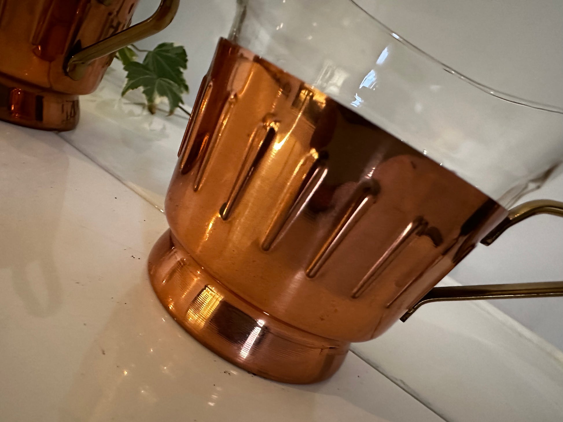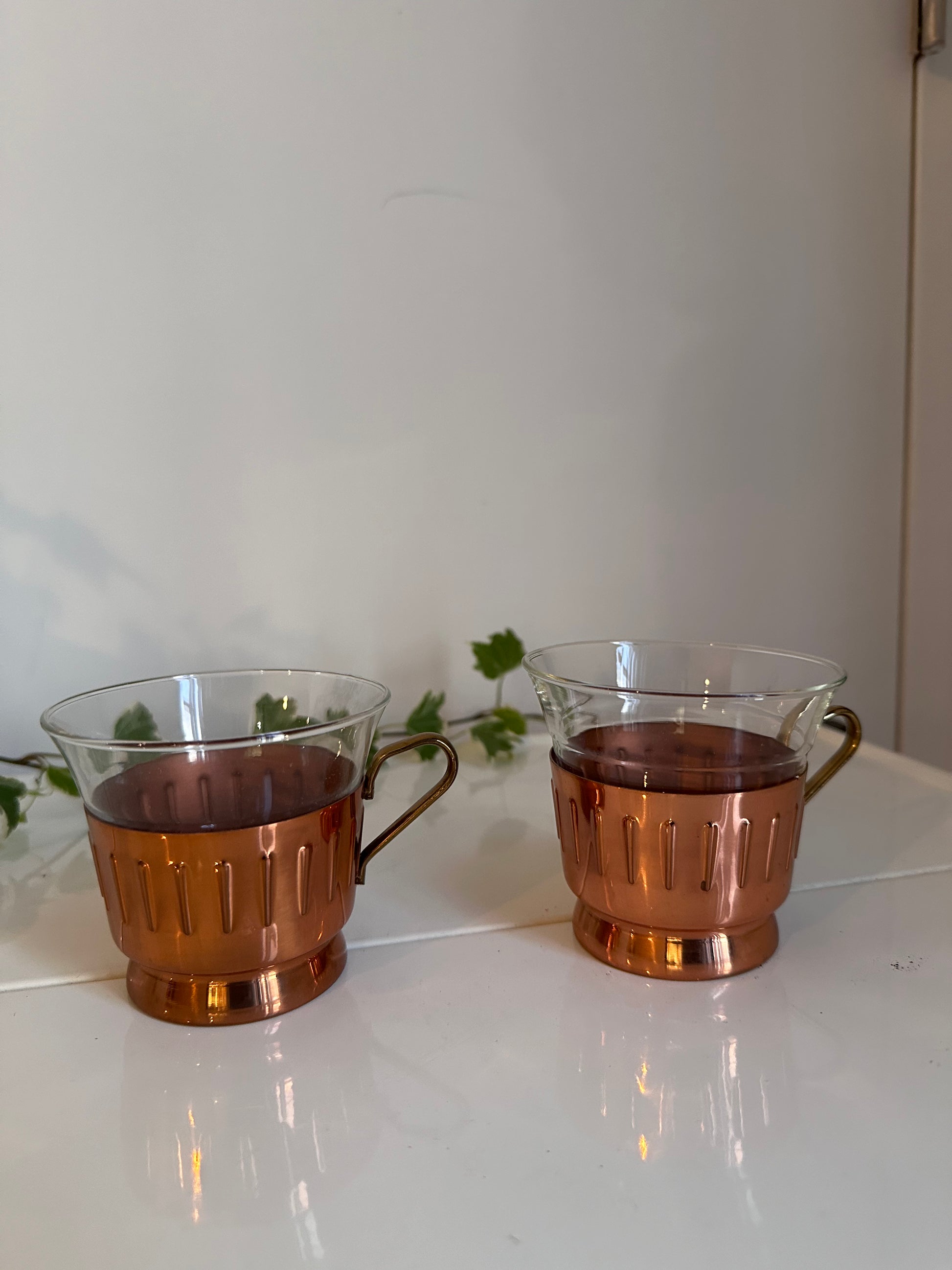 2 superleuke theeglazen in een koperen houder. Deze glazen zijn in een super vintage staat. Glas gemerkt onder. Dateren uit de jaren 70.