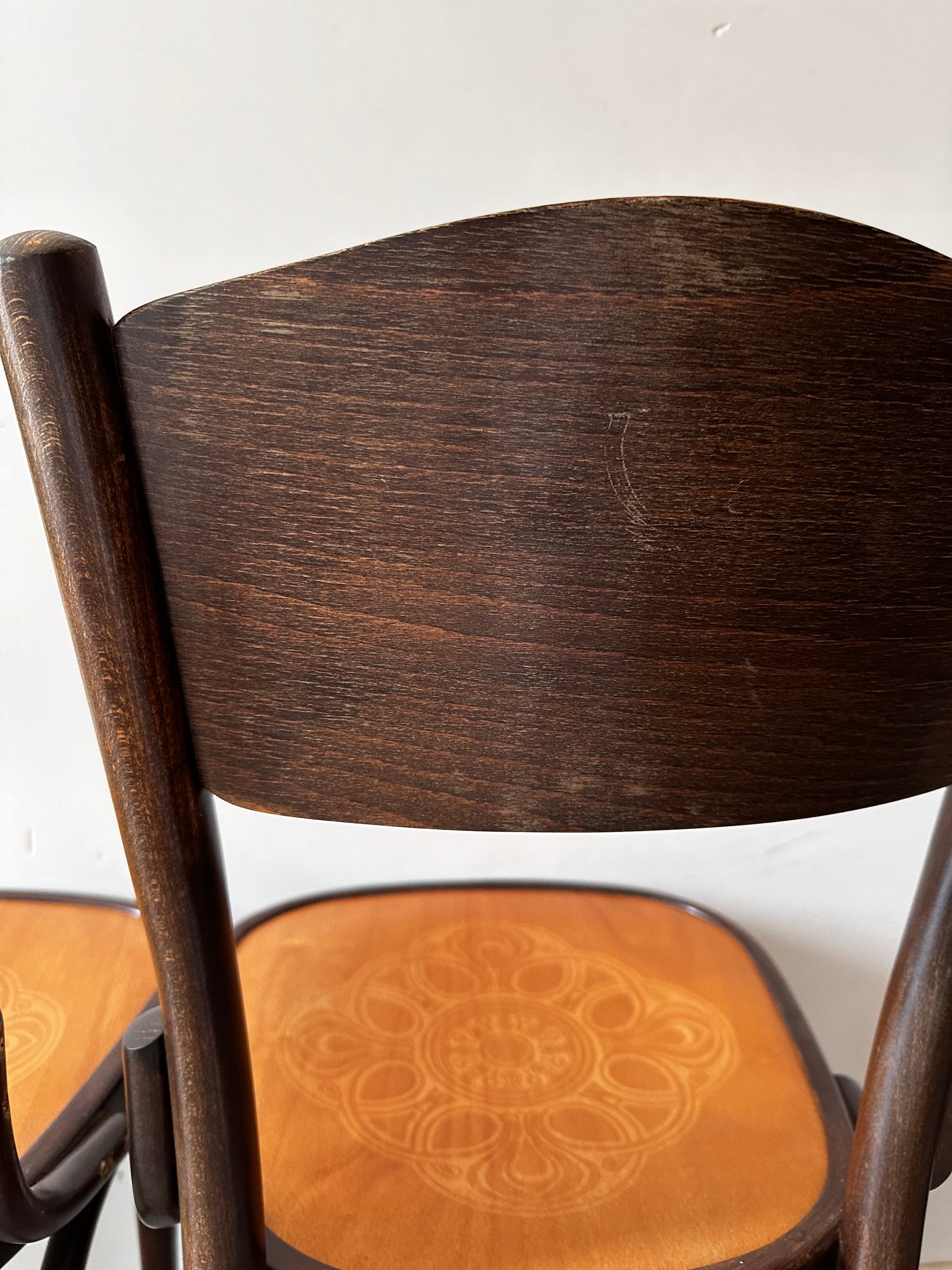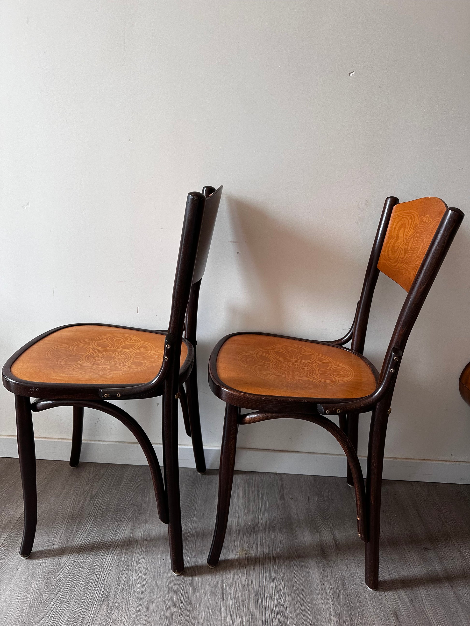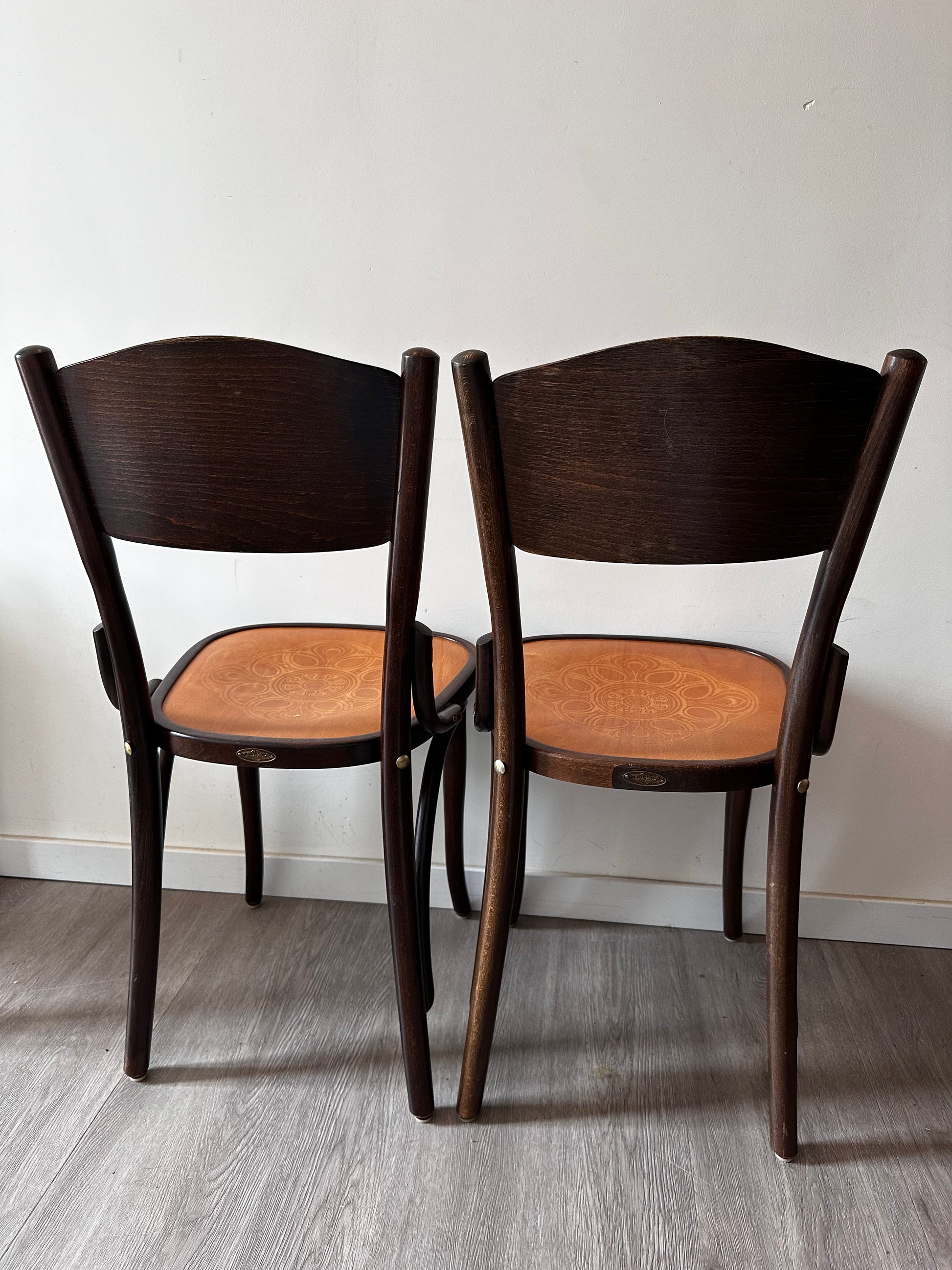 Twee mooie houten stoelen. In een super mooie vintage staat. De stoelen hebben twee verschillende kleuren hout, de zitting is licht hout met een mooi design. Stoel zijn gemerkt met een plaatje sattelite.