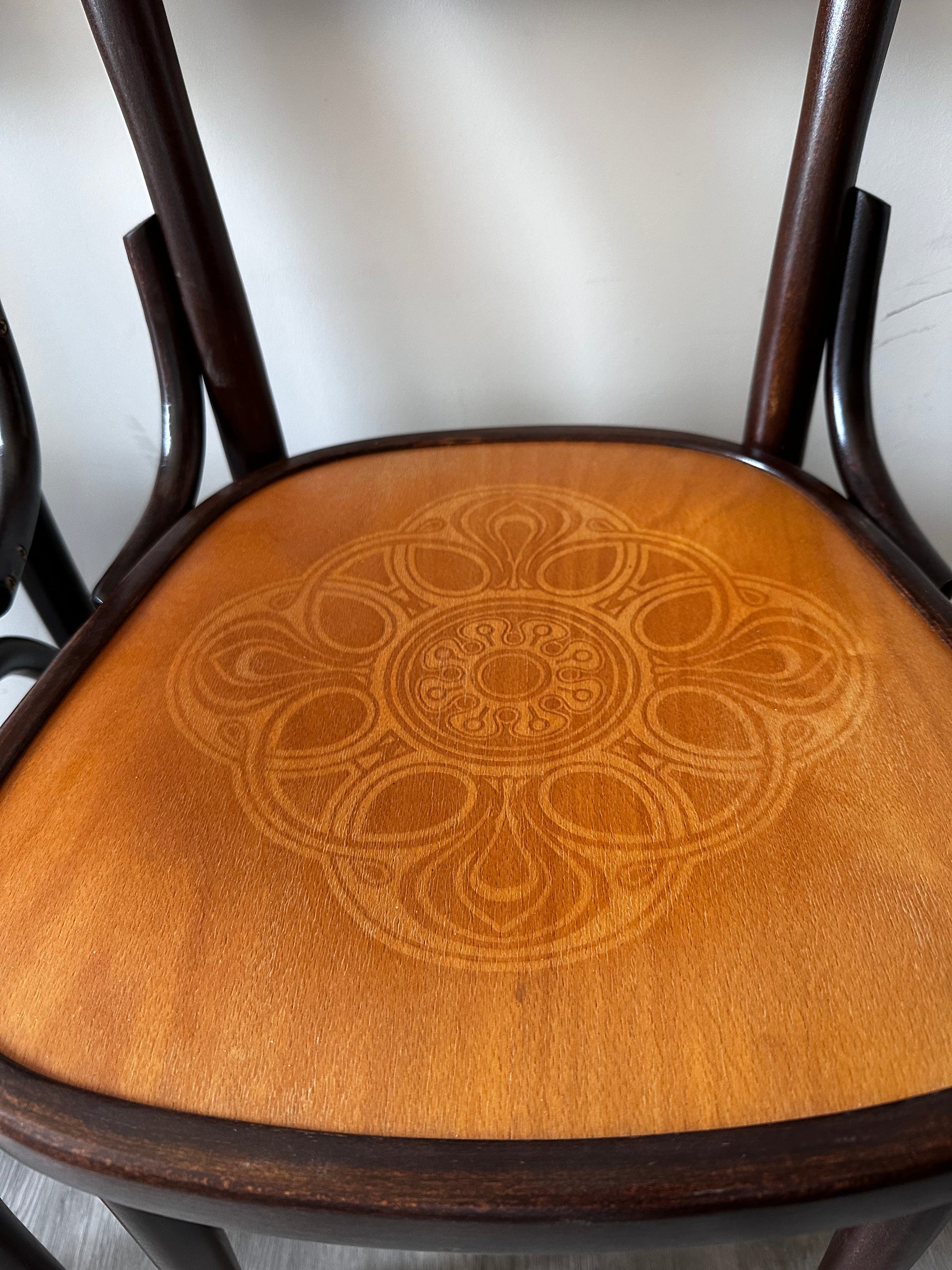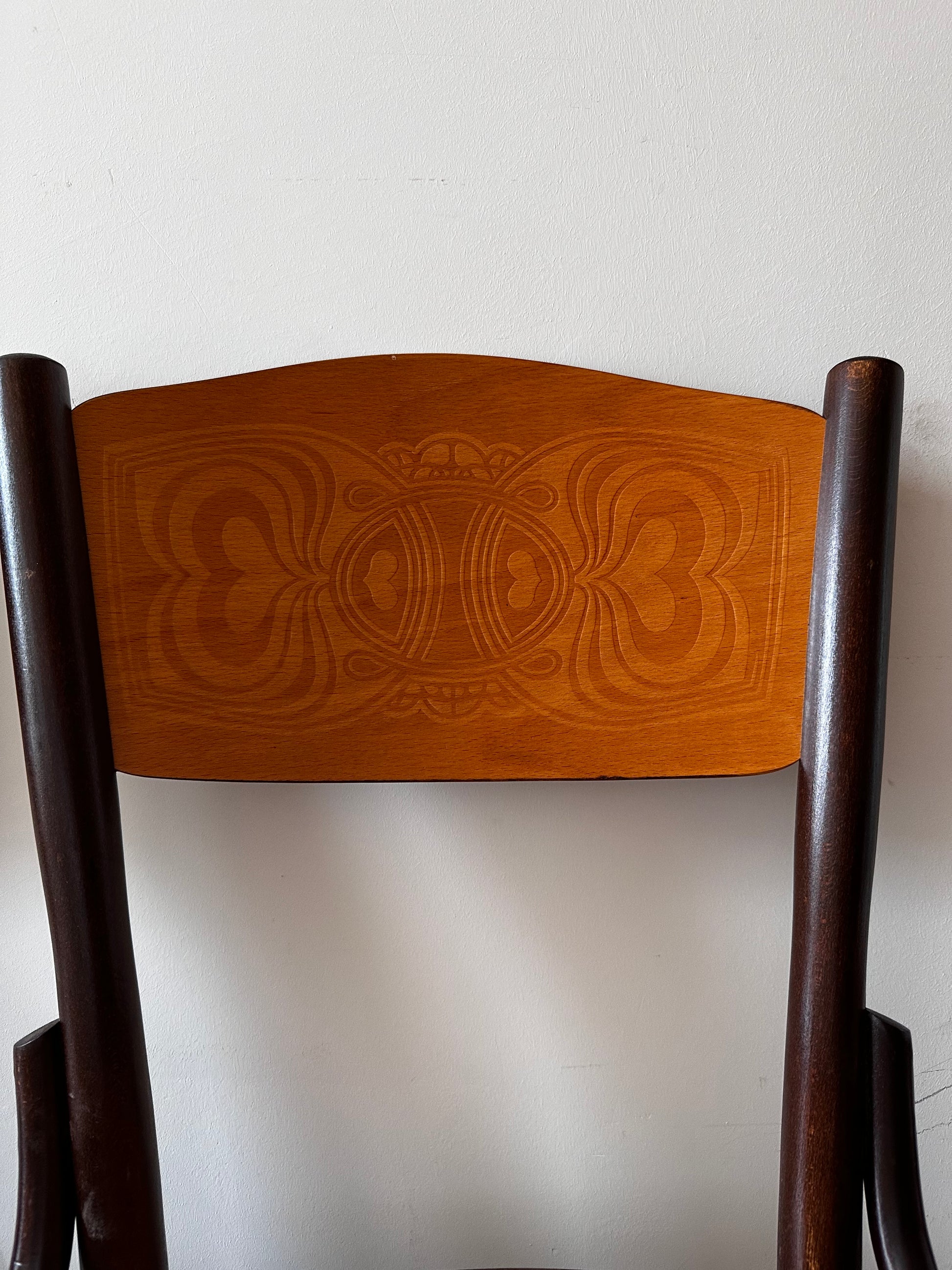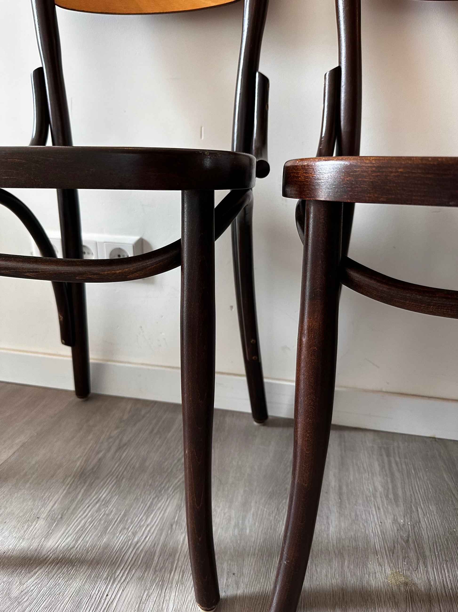Twee mooie houten stoelen. In een super mooie vintage staat. De stoelen hebben twee verschillende kleuren hout, de zitting is licht hout met een mooi design. Stoel zijn gemerkt met een plaatje sattelite.