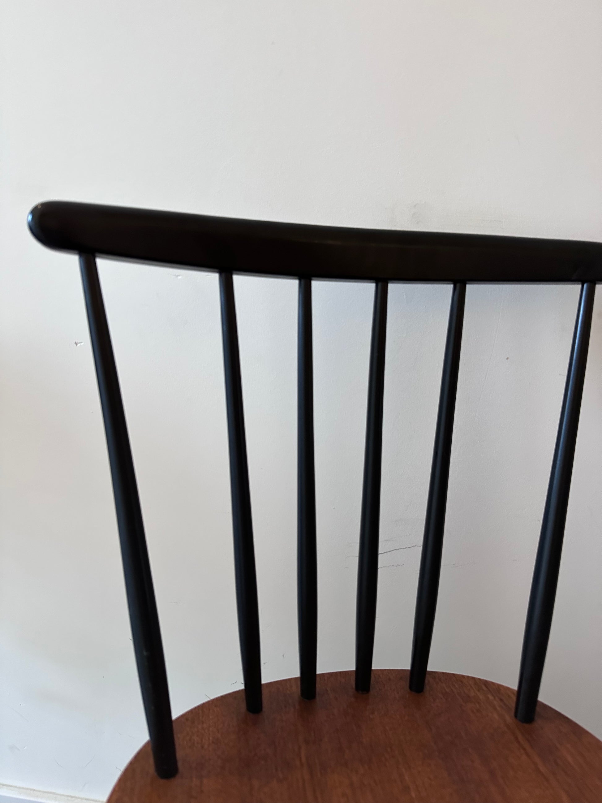 Twee geweldige spijlstoelen. Dateert uit de zestiger jaren en gefabriceerd in Nederland. Ze hebben een teak houten zitting en zwarte spijlen en poten. De zitting is van teak hout. Stoelen zijn van stevige kwaliteit. Ze zijn in een goede vintage staat, met hier en daar gebruikssporen van liefdevol gebruik. Afmetingen 41 cm breed 46 cm zithoogte 83 cm hoog