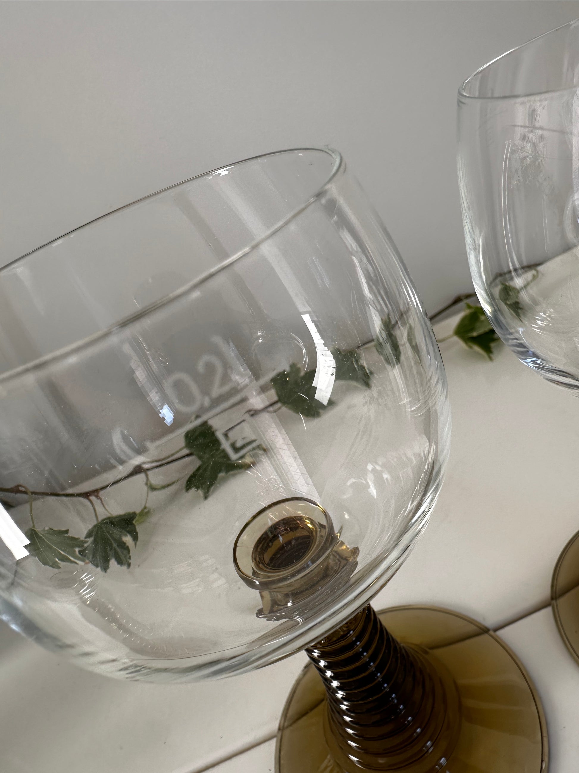 3 geweldige Roemer Moessel glazen. Met de kenmerkende uitlopende groene voet. De kleur van deze voet is mosgroen. Dit zijn de 0,2 ltr glazen. In een perfecte vintage staat.