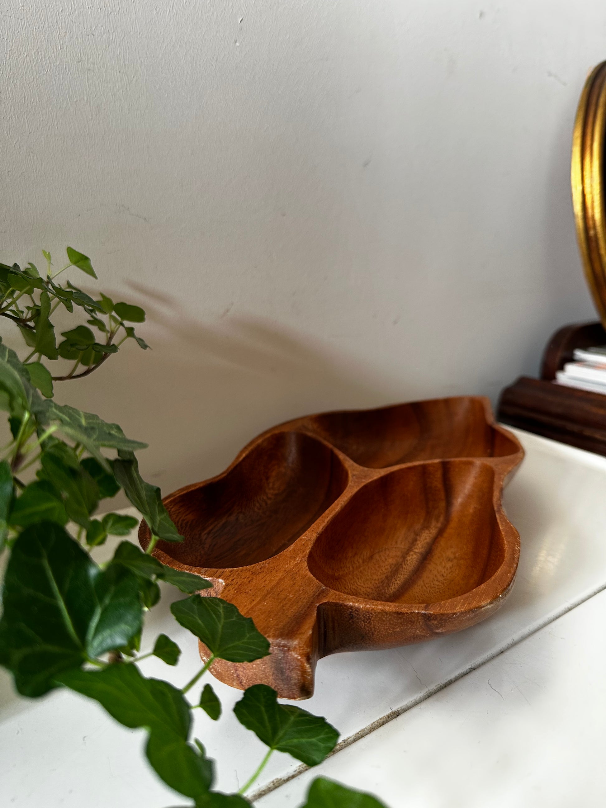 Strak vormgegeven houten schaal met drie compartimenten. Mooi uitgehold uit één stuk hout, met een warme houtkleur en duidelijke nerfstructuur. De vorm is organisch maar rustig, en door de vakverdeling ook praktisch. Q733