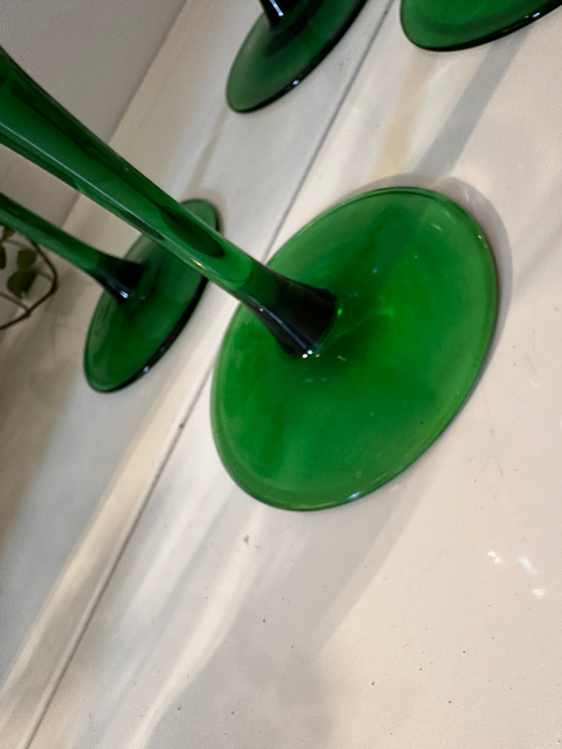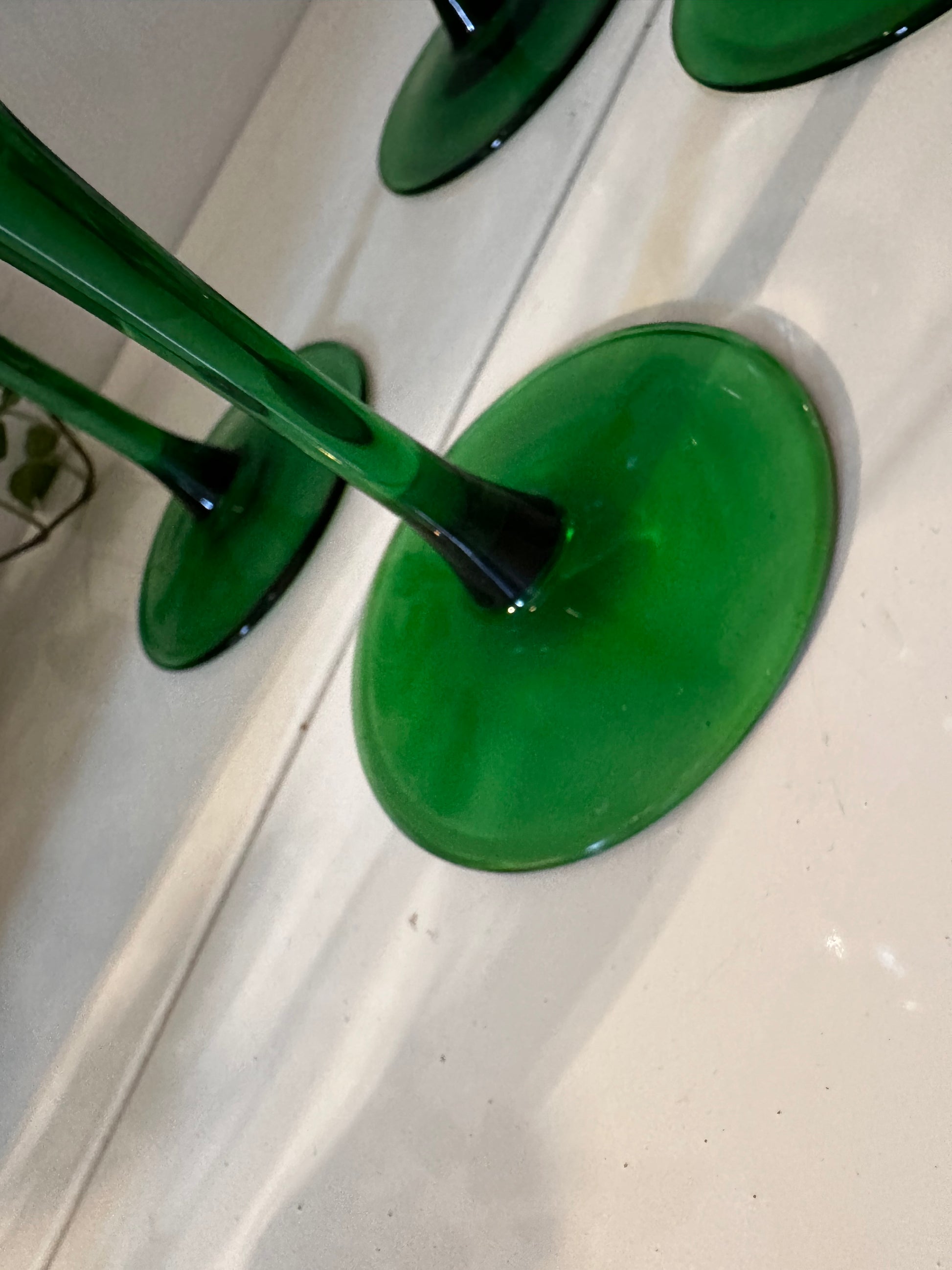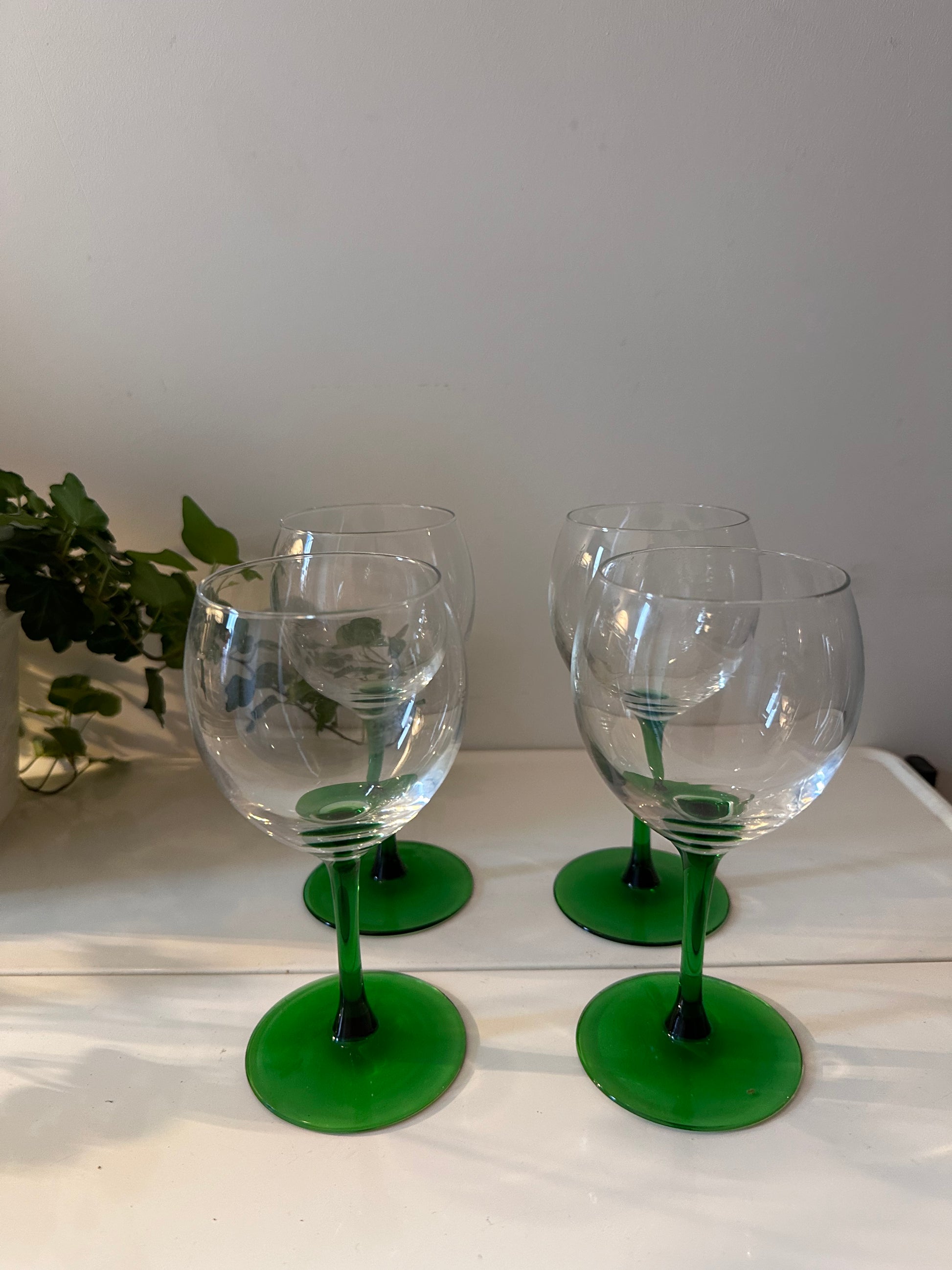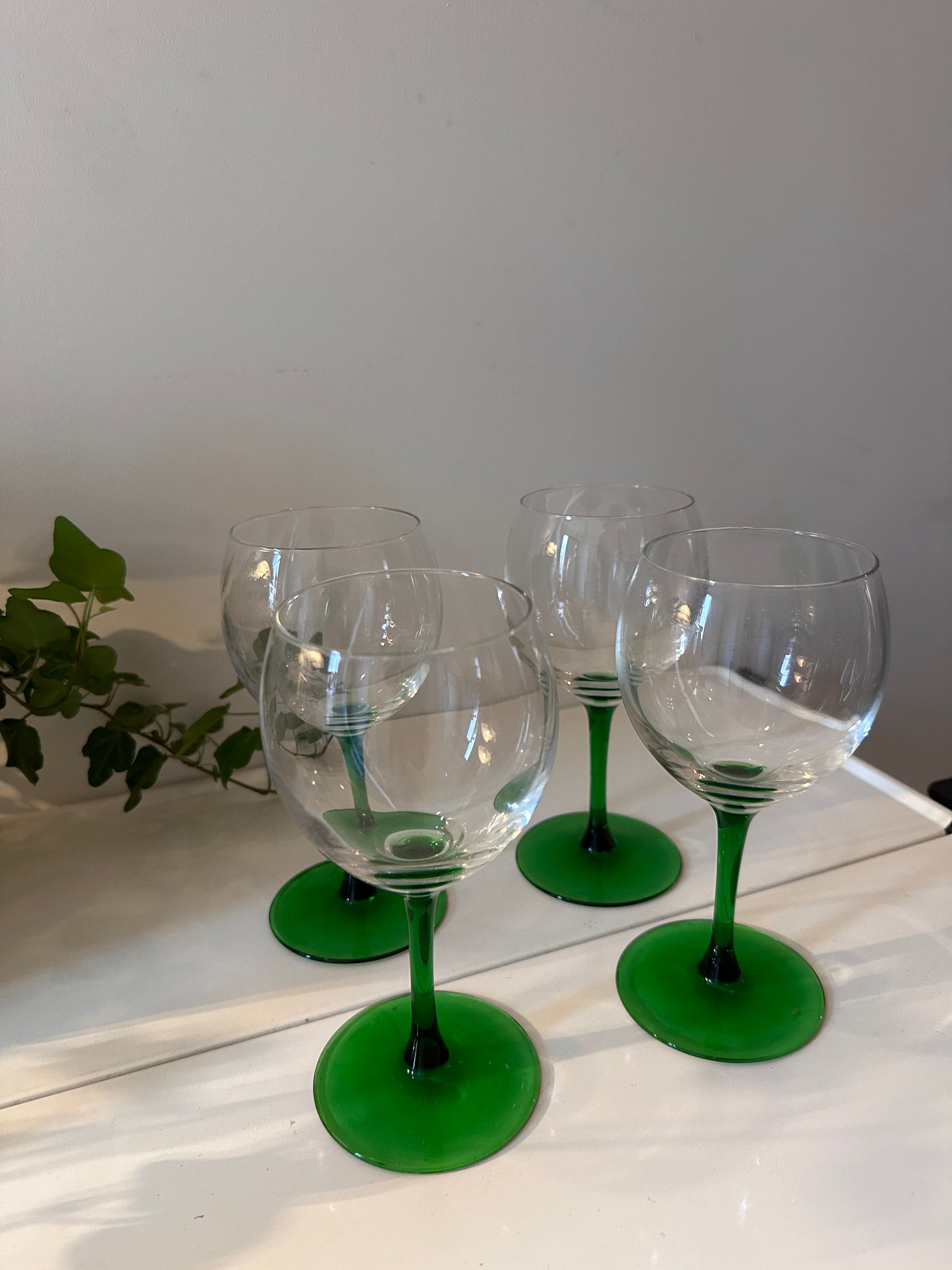 Een set van 4 geweldige Franse wijnglazen. In een top vintage staat. De glazen staan op een mooie slanke groene voet. Inhoud van de glazen is circa 0,2 ltr. Glazen dateren rond de jaren 70
