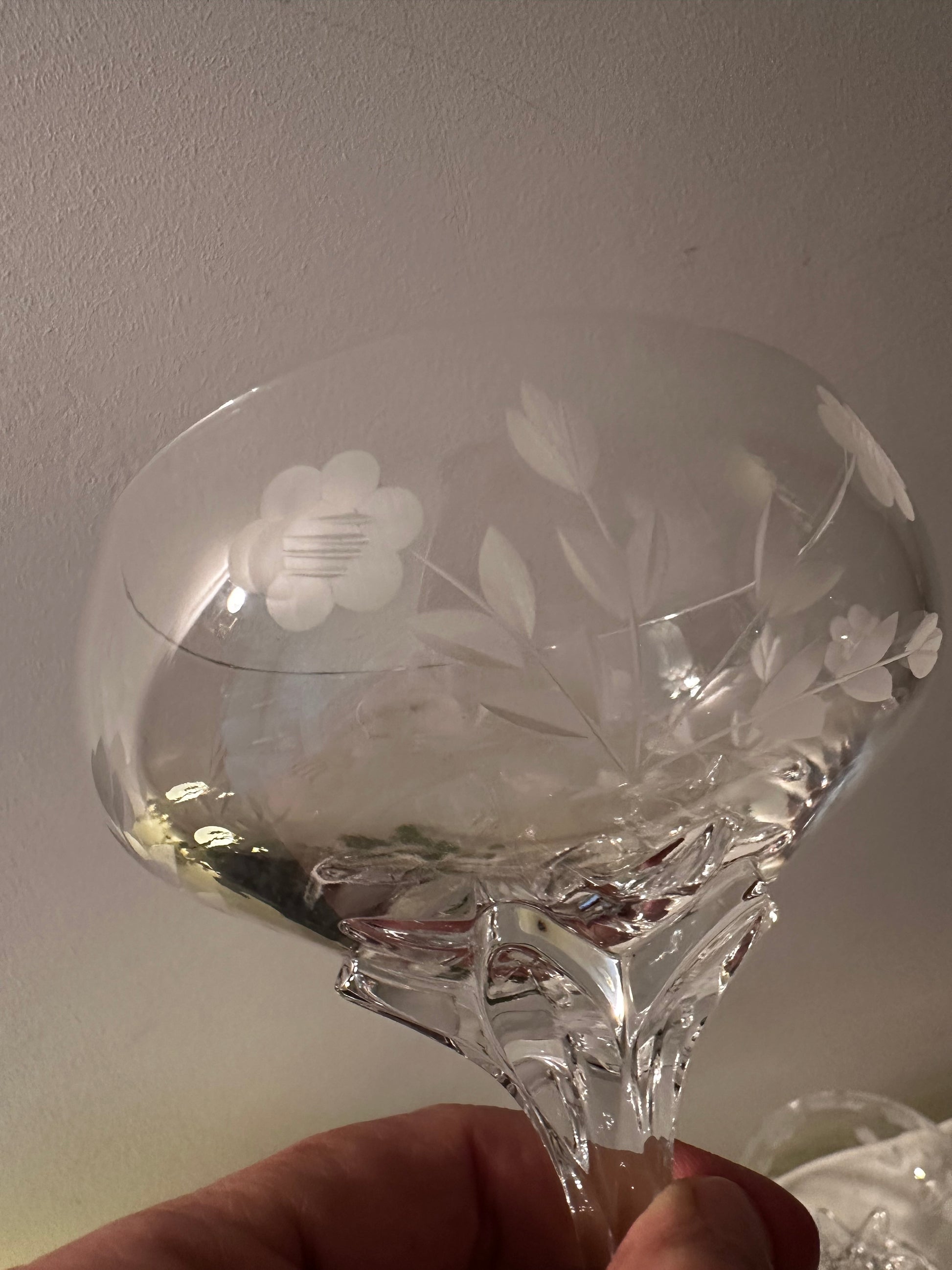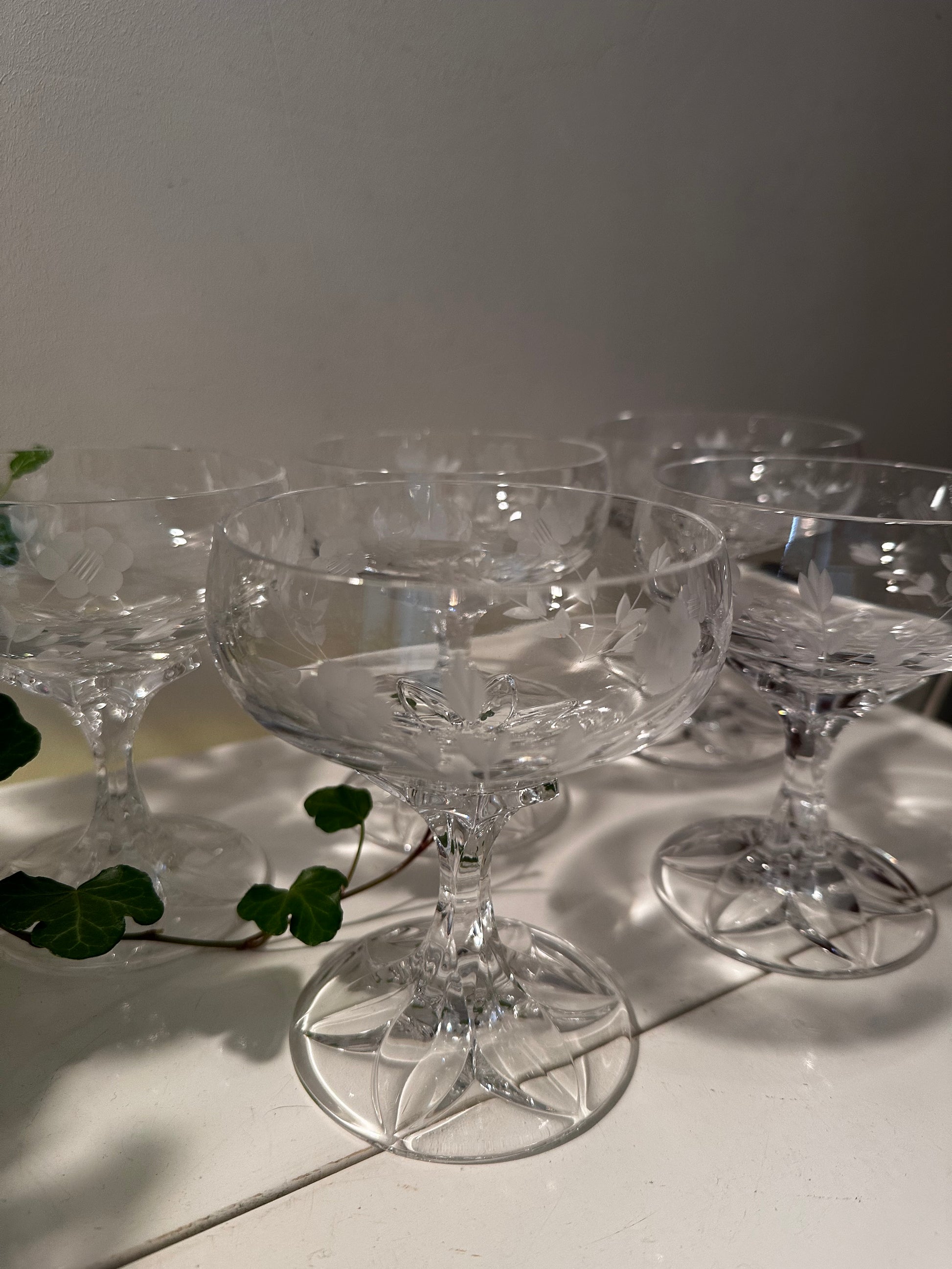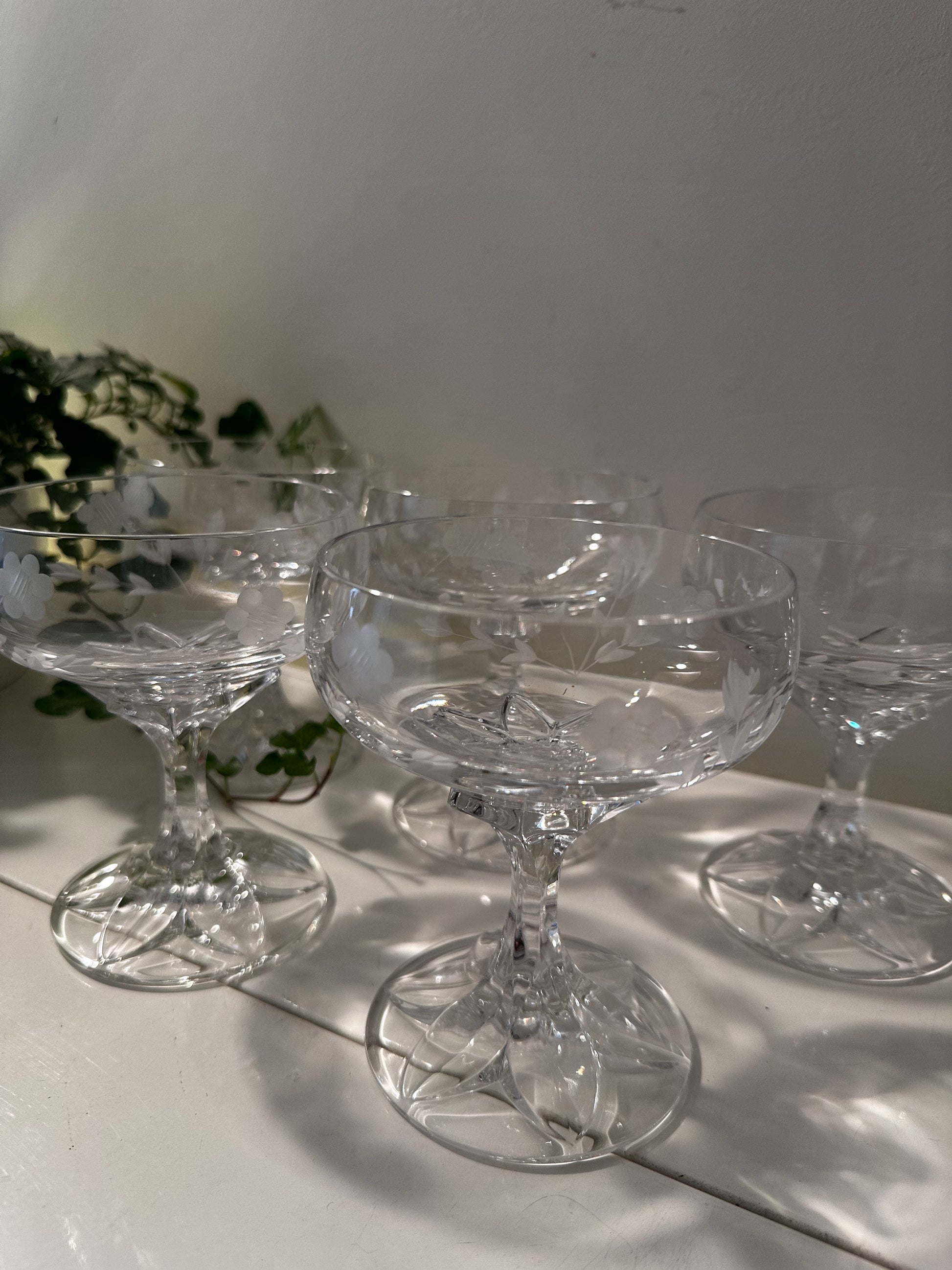 Een set van 5 prachtige kristallen coupe glazen. In een uitstekende staat. De glazen hebben een sublieme uitstraling. De glazen dateren jaren 60 en zijn in een perfecte staat. Ze hebben ingeslepen bloemen en de voet is als een bloemenstengel die prachtig uitmond onder aan het glas