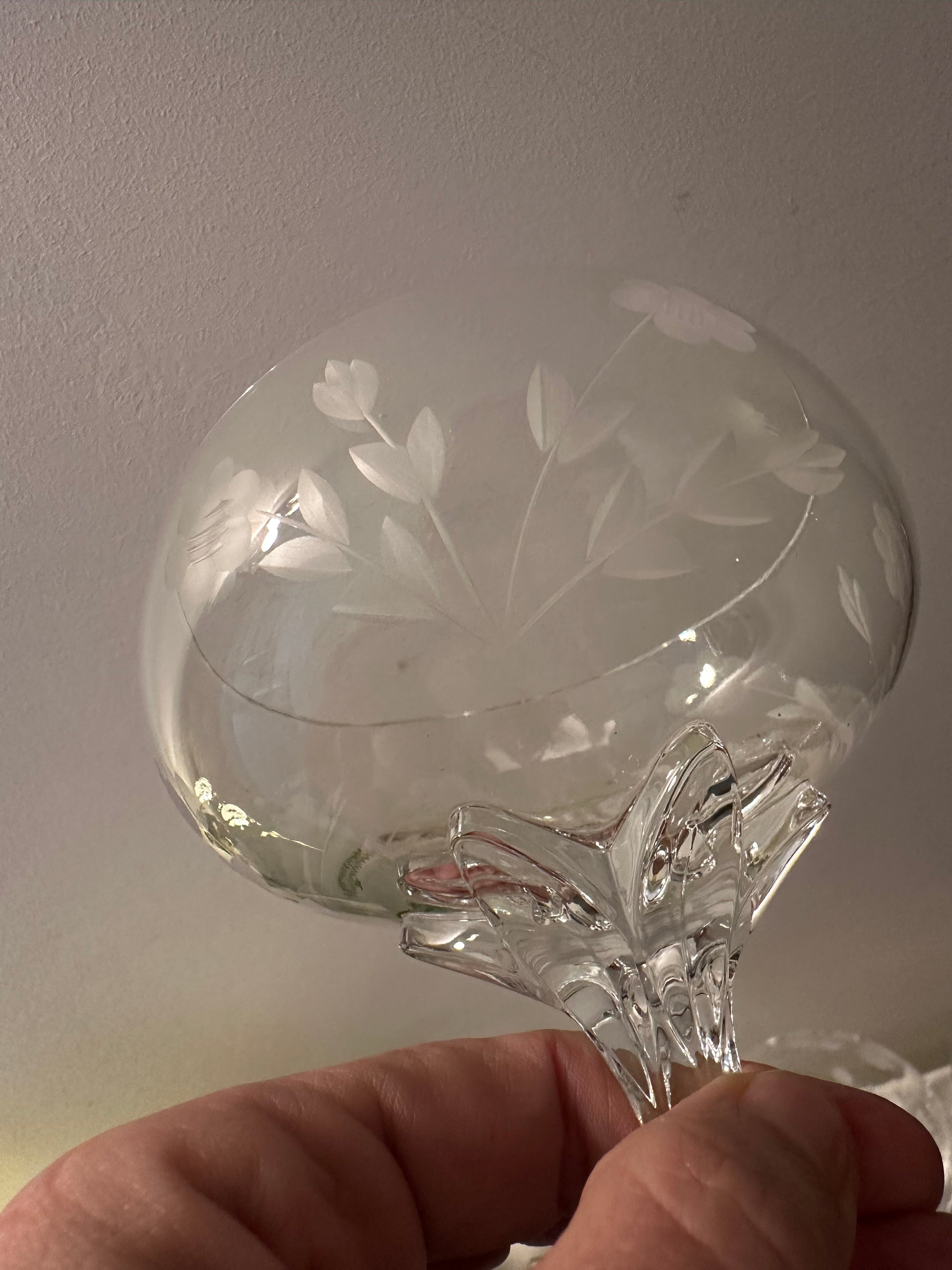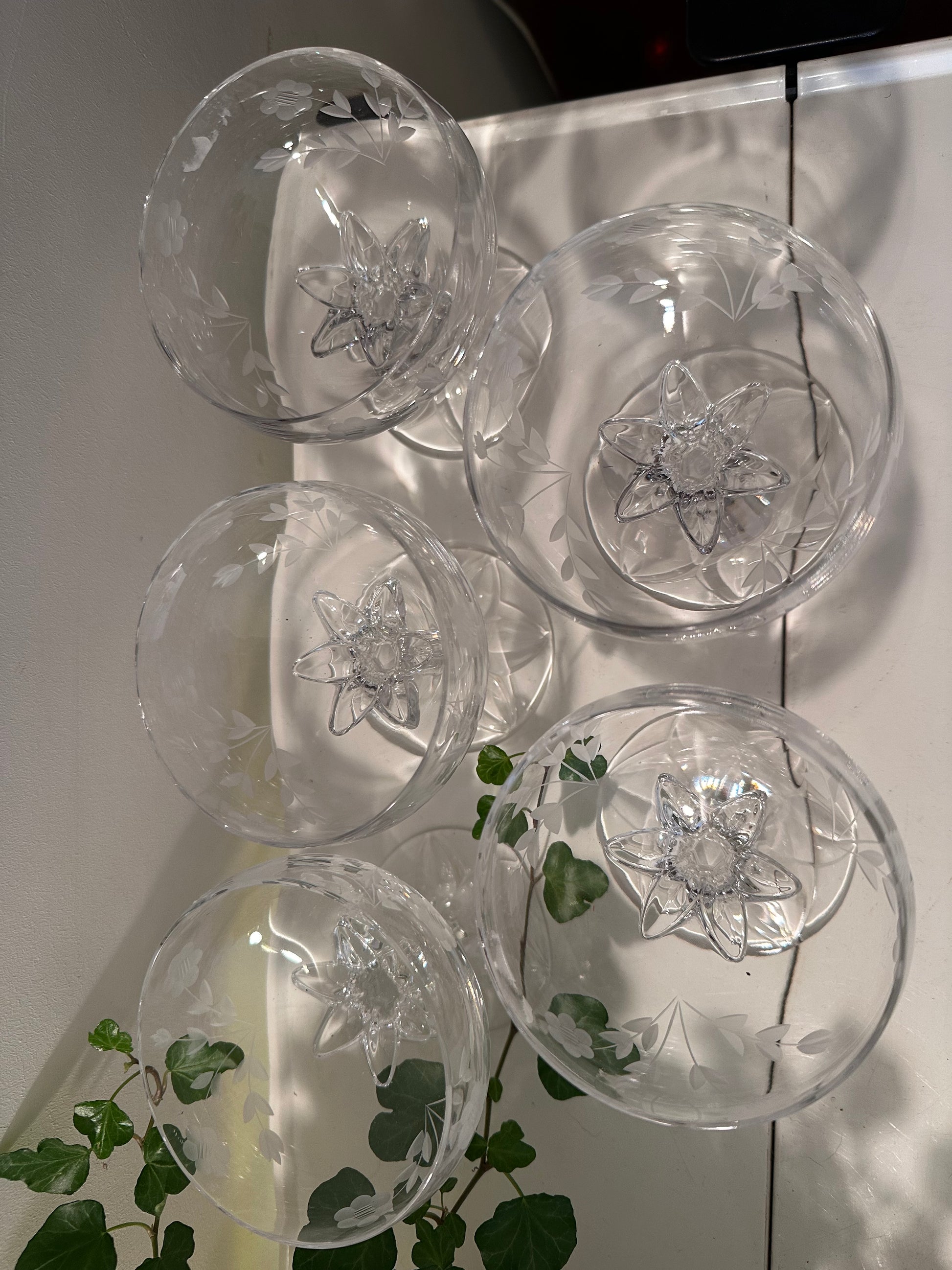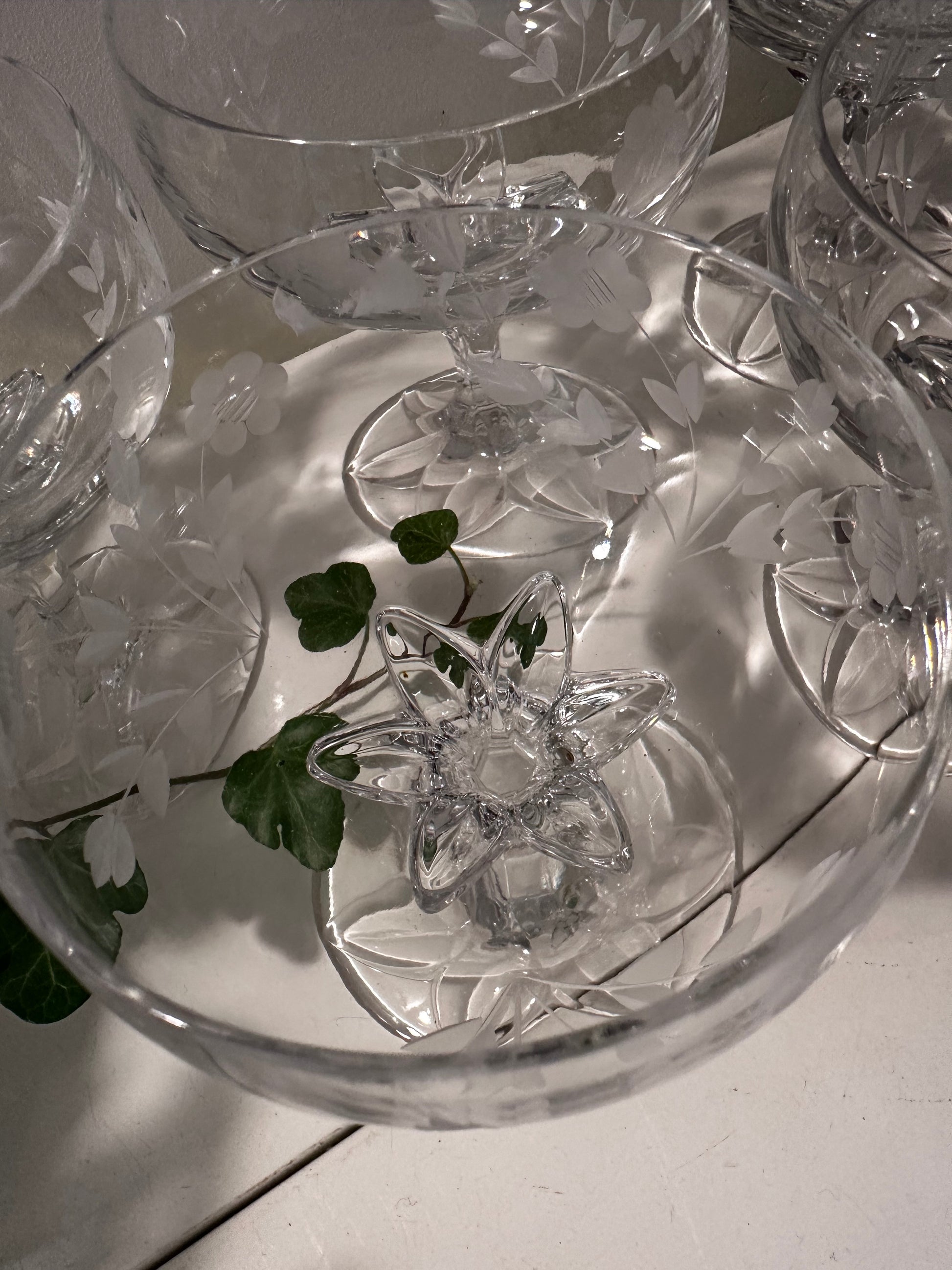 Een set van 5 prachtige kristallen coupe glazen. In een uitstekende staat. De glazen hebben een sublieme uitstraling. De glazen dateren jaren 60 en zijn in een perfecte staat. Ze hebben ingeslepen bloemen en de voet is als een bloemenstengel die prachtig uitmond onder aan het glas