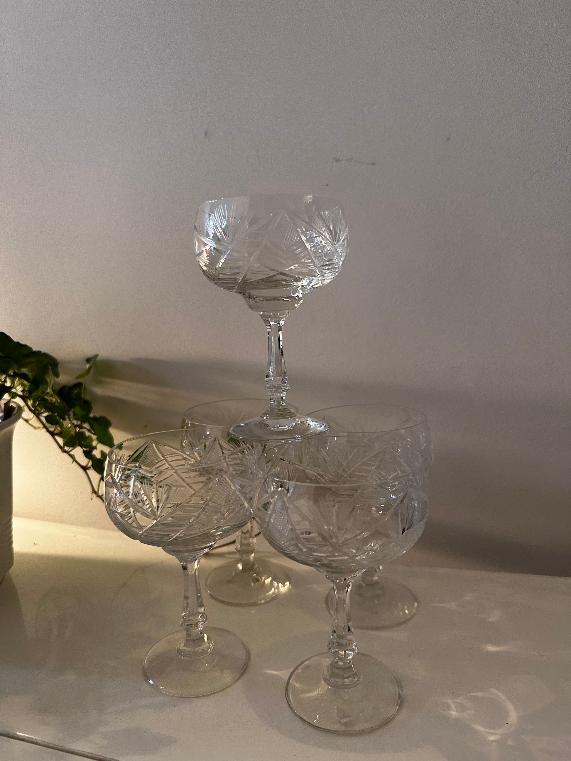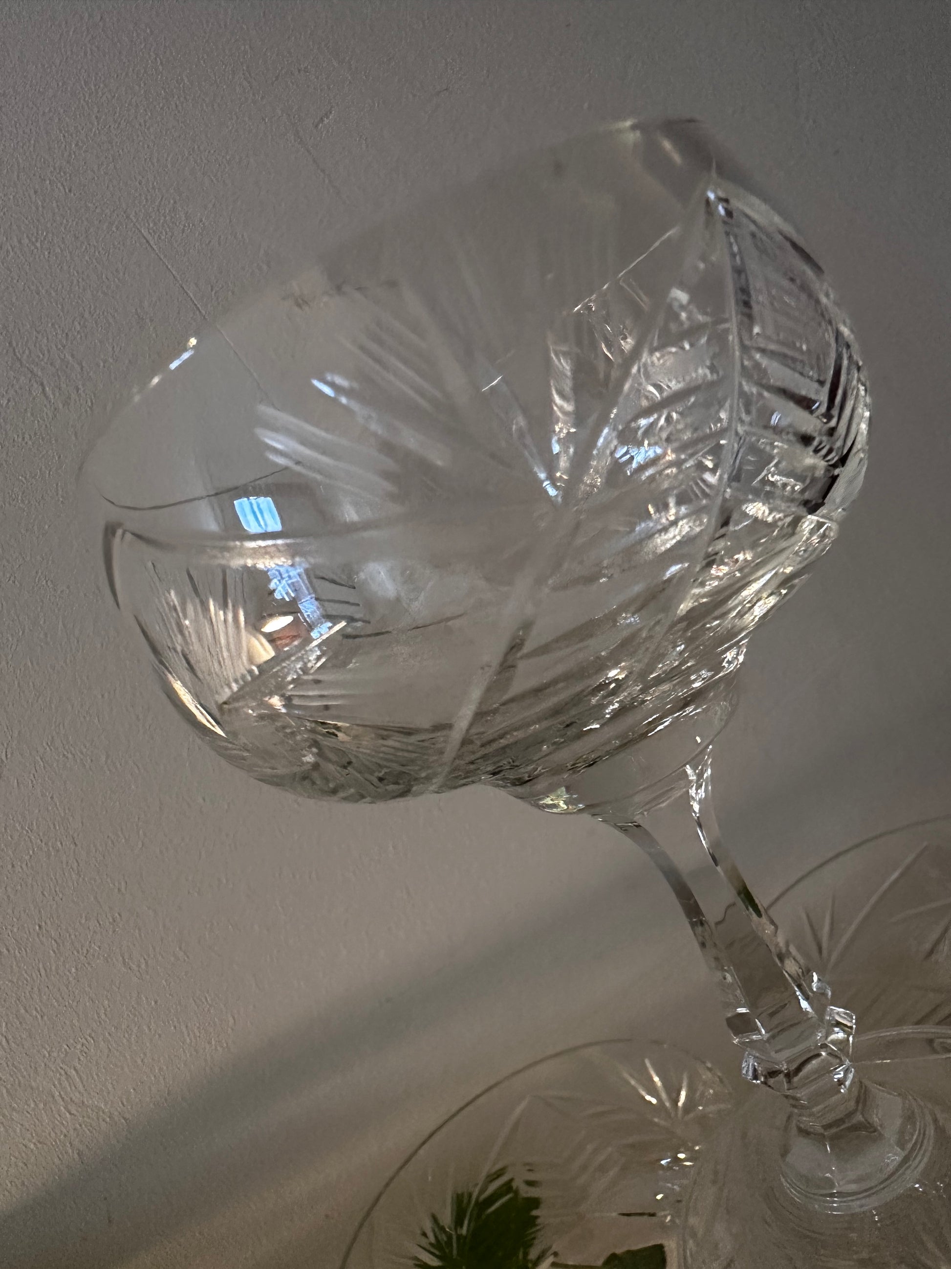 Set van 5 prachtige voetglazen. De glazen zijn van kristal en in een top vintage staat. De glazen hebben een ingeslepen design en staan op een elegante voet.