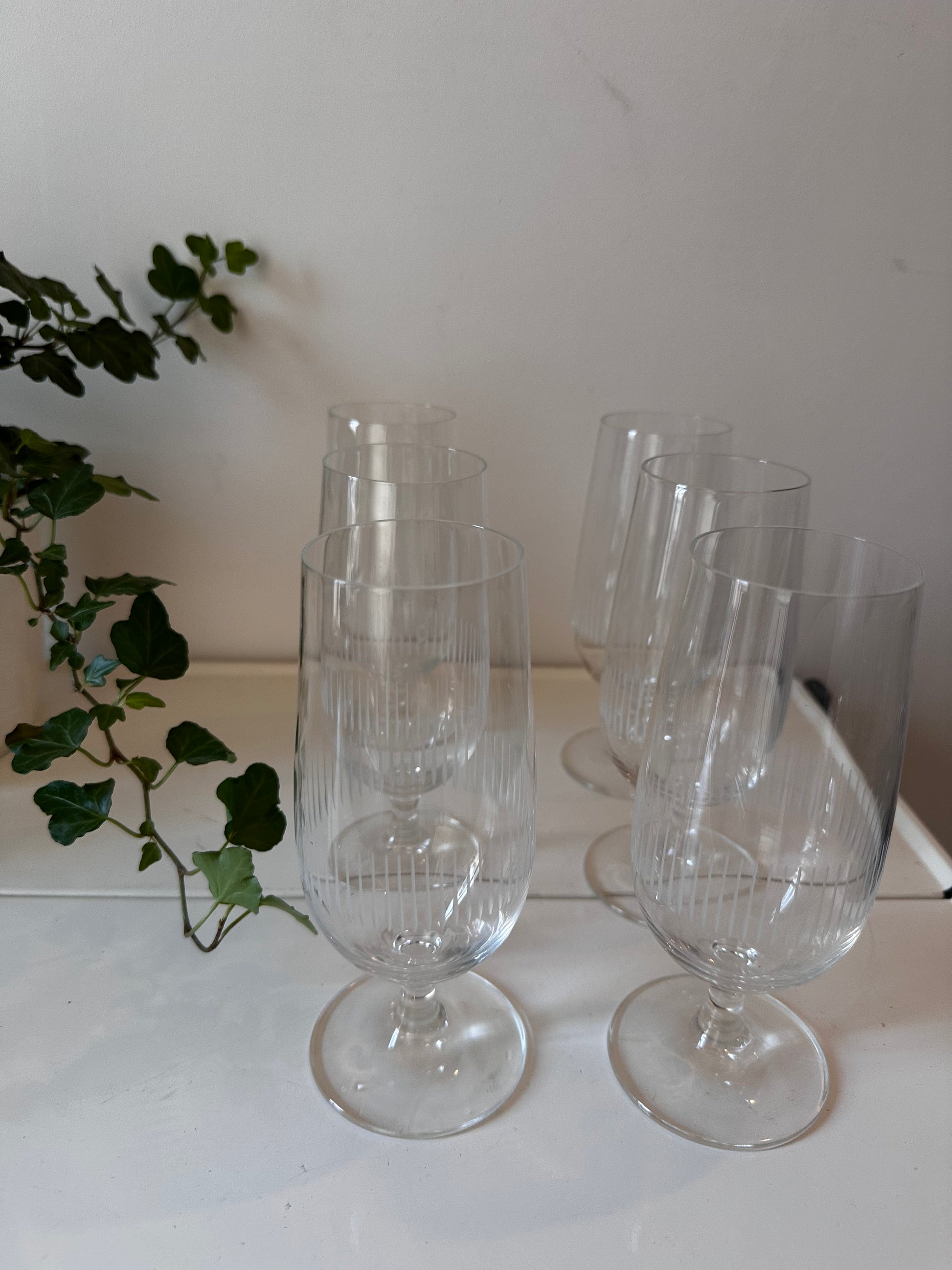 Een set van 6 prachtige voetglazen in een werkelijk super vintage staat. Glazen staan op een laag voetje en hebben een lijngravering in het glas hoog ca 16 cm breed ca 5 cm