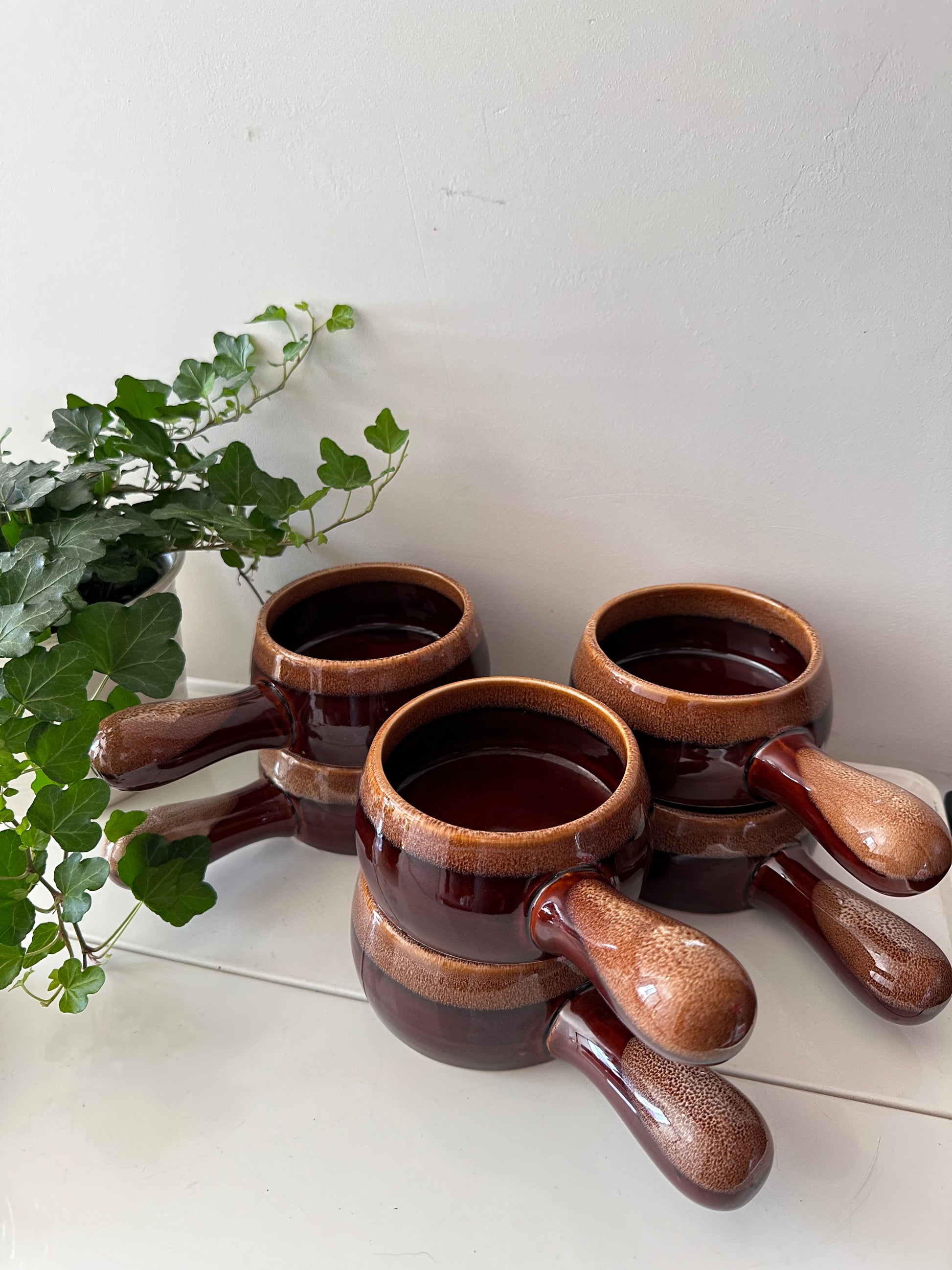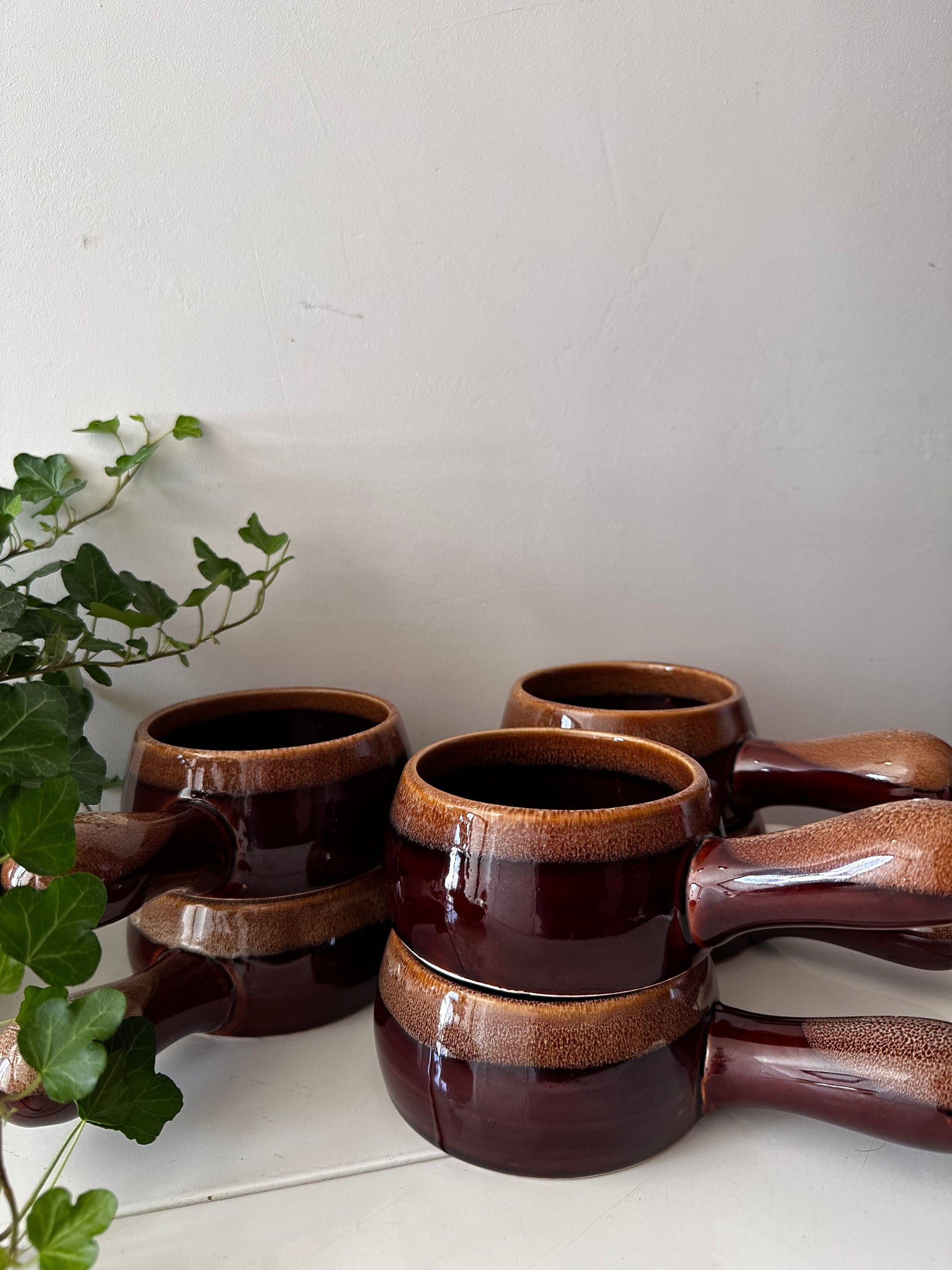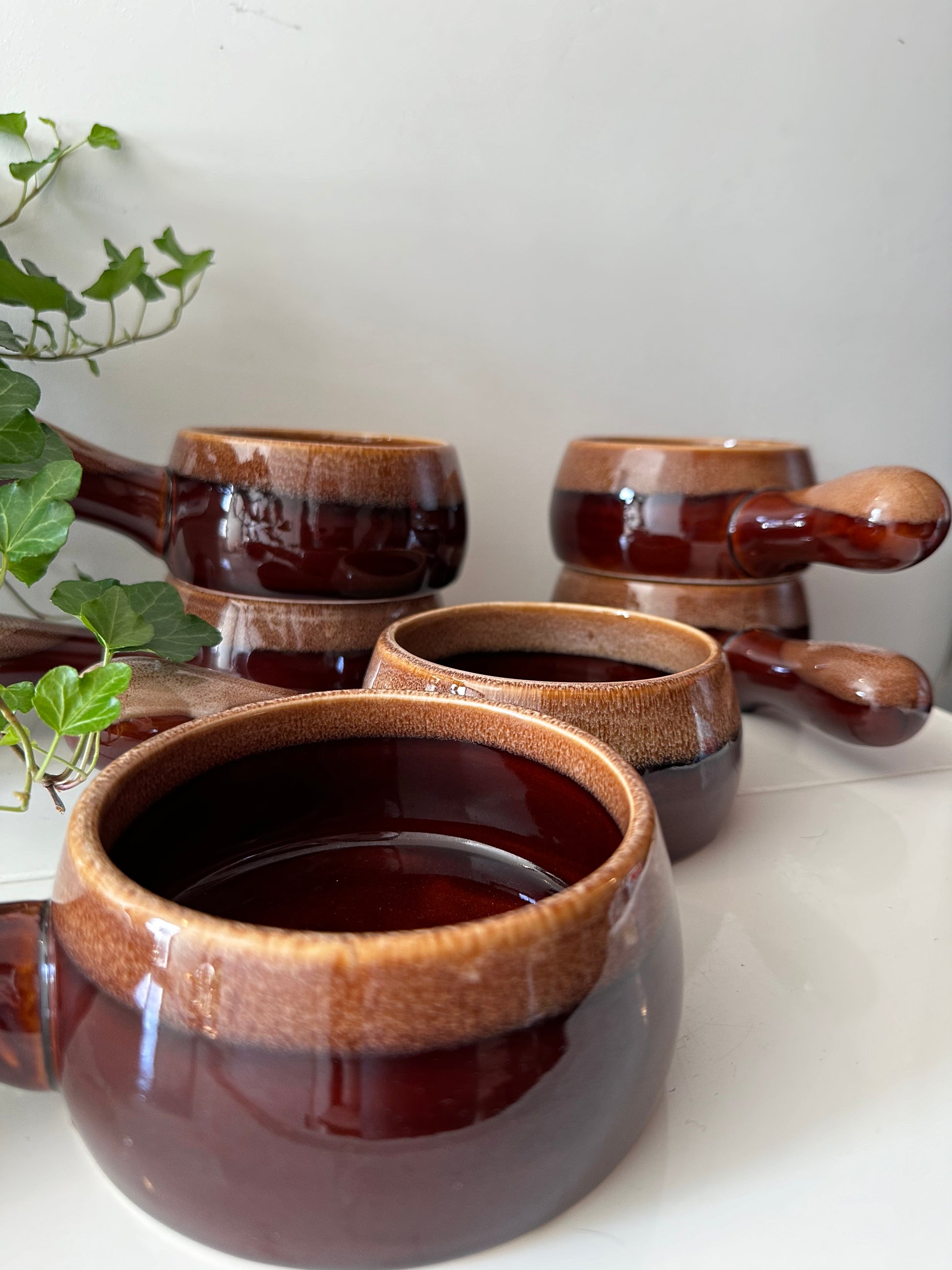 Een te gekke set van 6 vintage soepkommen. Afkomstig uit Duitsland en dateren jaren 70. Ze hebben die gave retro bruine kleur met beige. Ook heel handig ze hebben een groot handvat. In een supermooie vintage staat