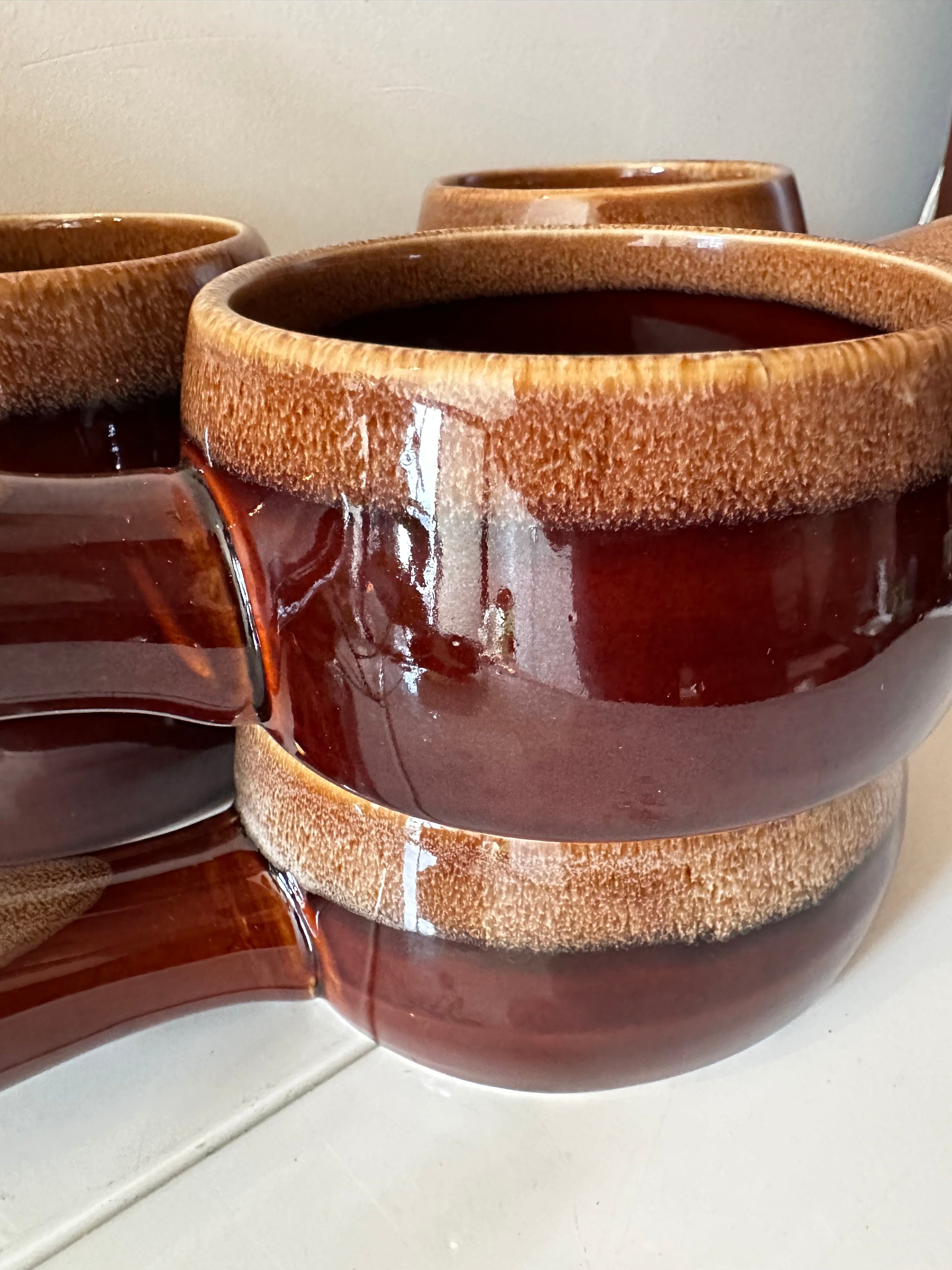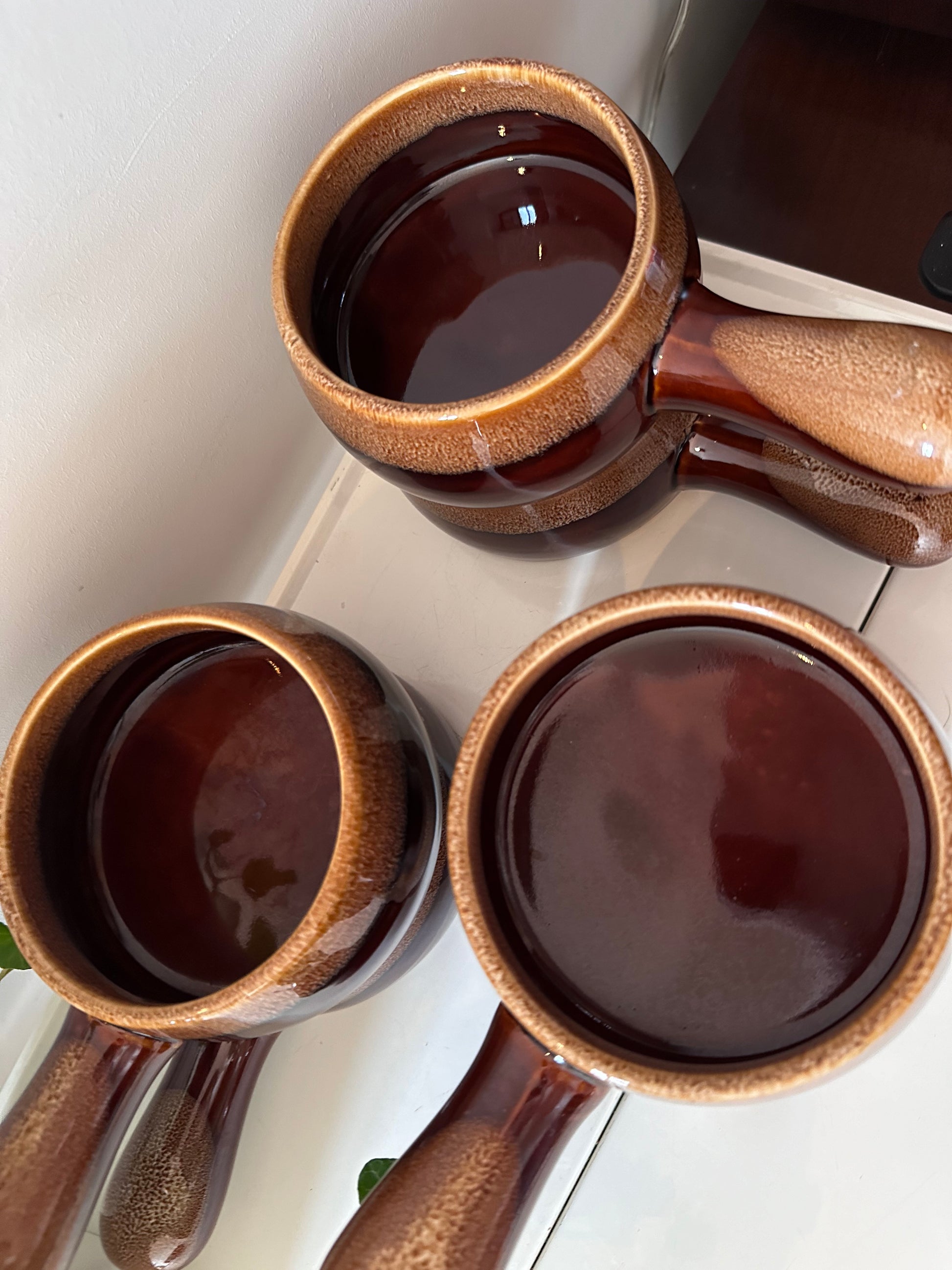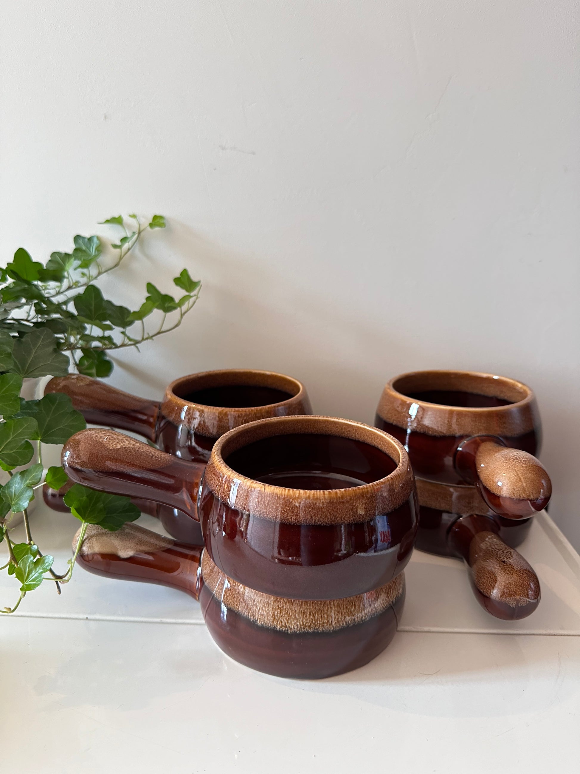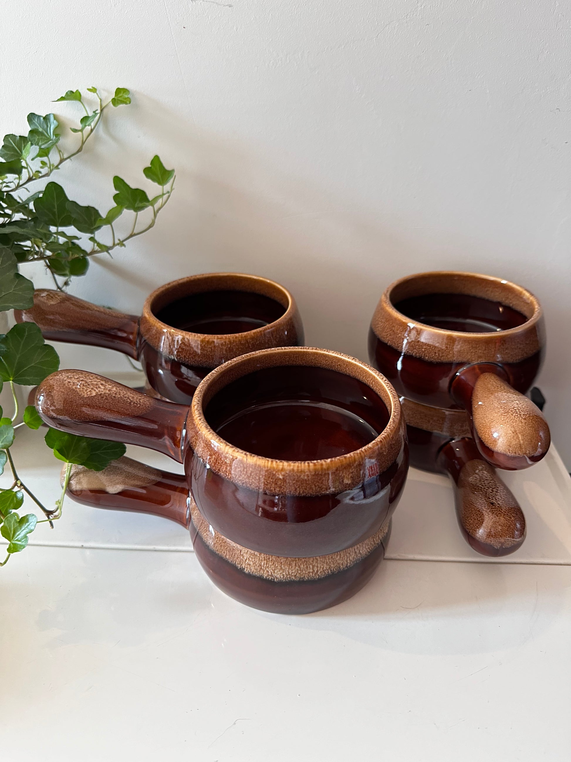 Een te gekke set van 6 vintage soepkommen. Afkomstig uit Duitsland en dateren jaren 70. Ze hebben die gave retro bruine kleur met beige. Ook heel handig ze hebben een groot handvat. In een supermooie vintage staat