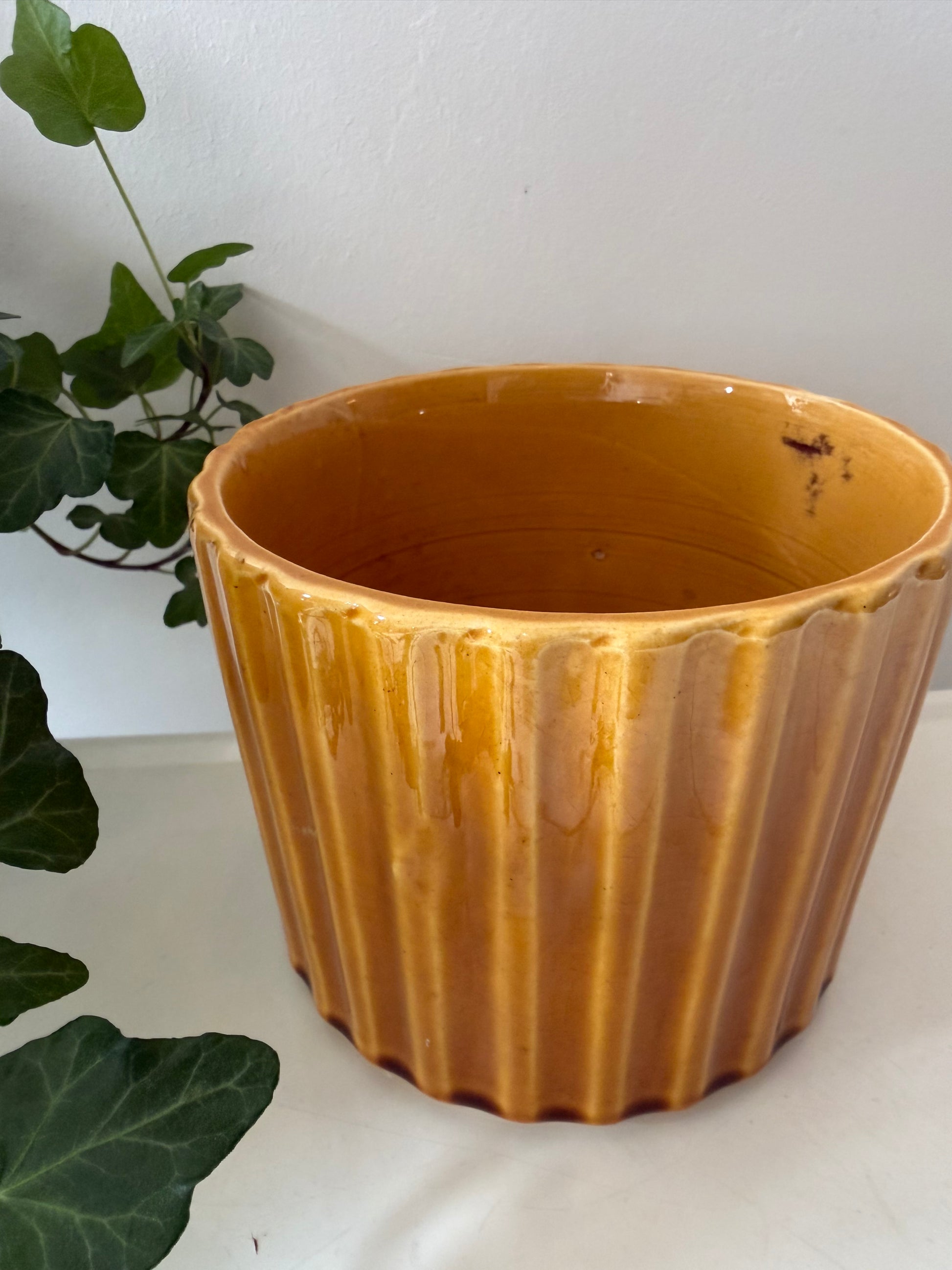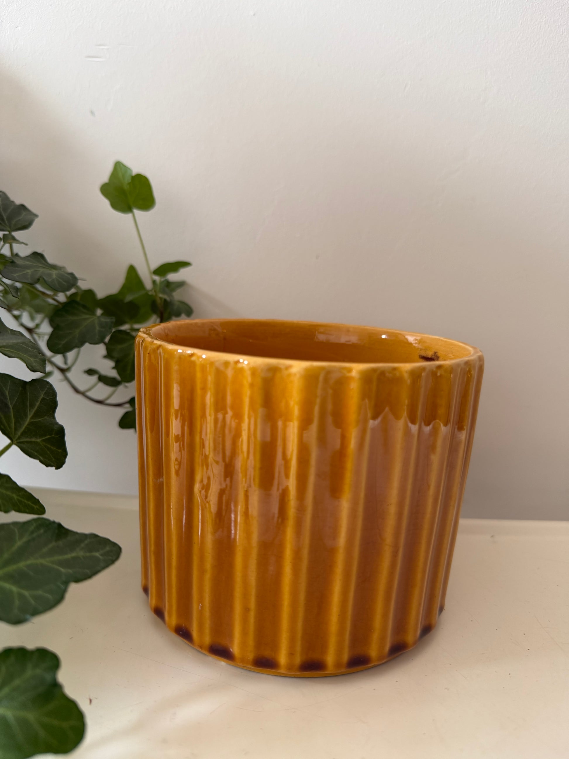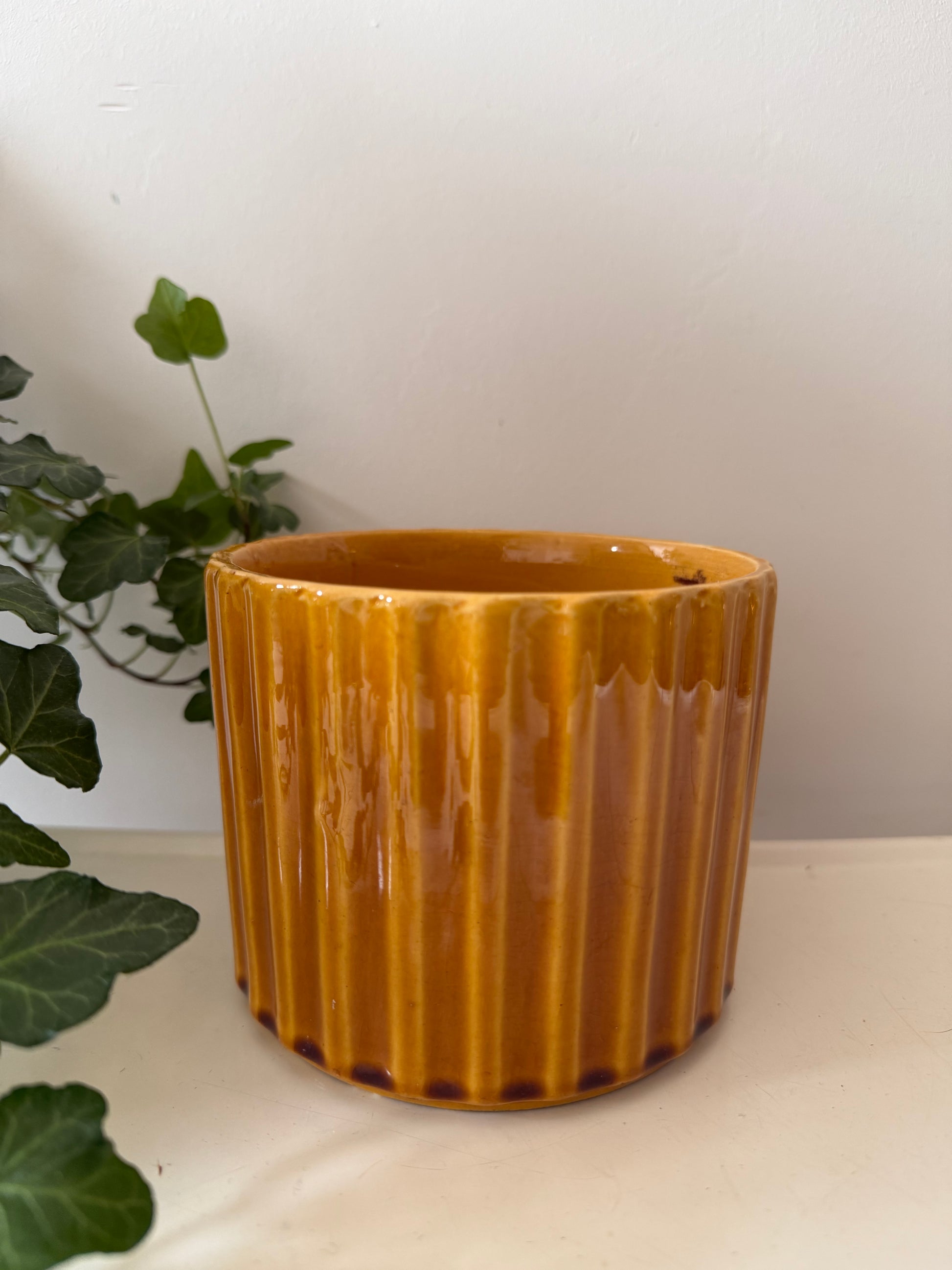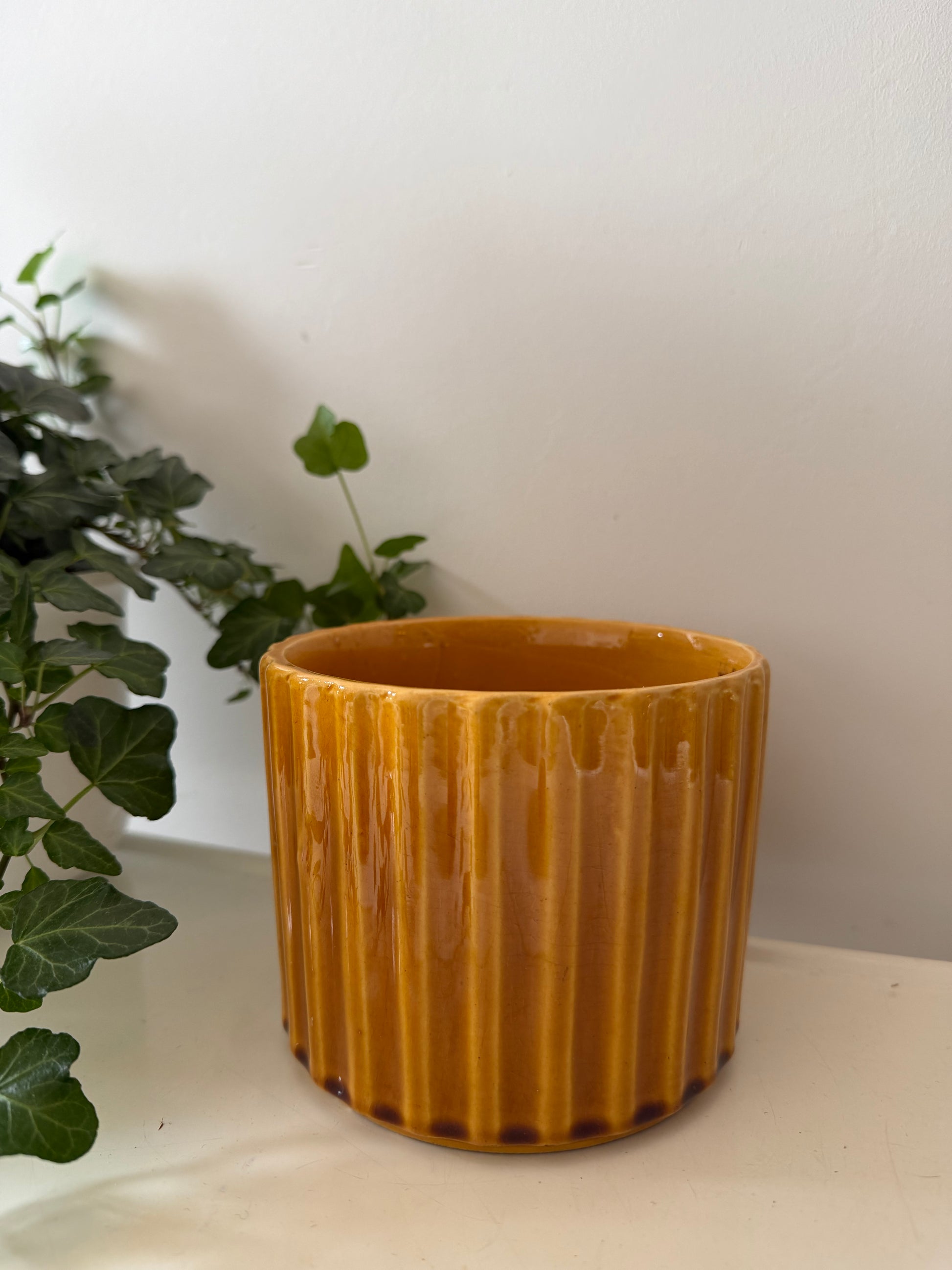 Hele mooie keramieken bloempot in een warme okergele kleur met van die verticale ribbels rondom. Glazuur loopt iets uit aan de bovenkant en onderaan zie je donkerdere accenten. Binnenkant ook geglazuurd en onderop gemerkt ADCO. Q51