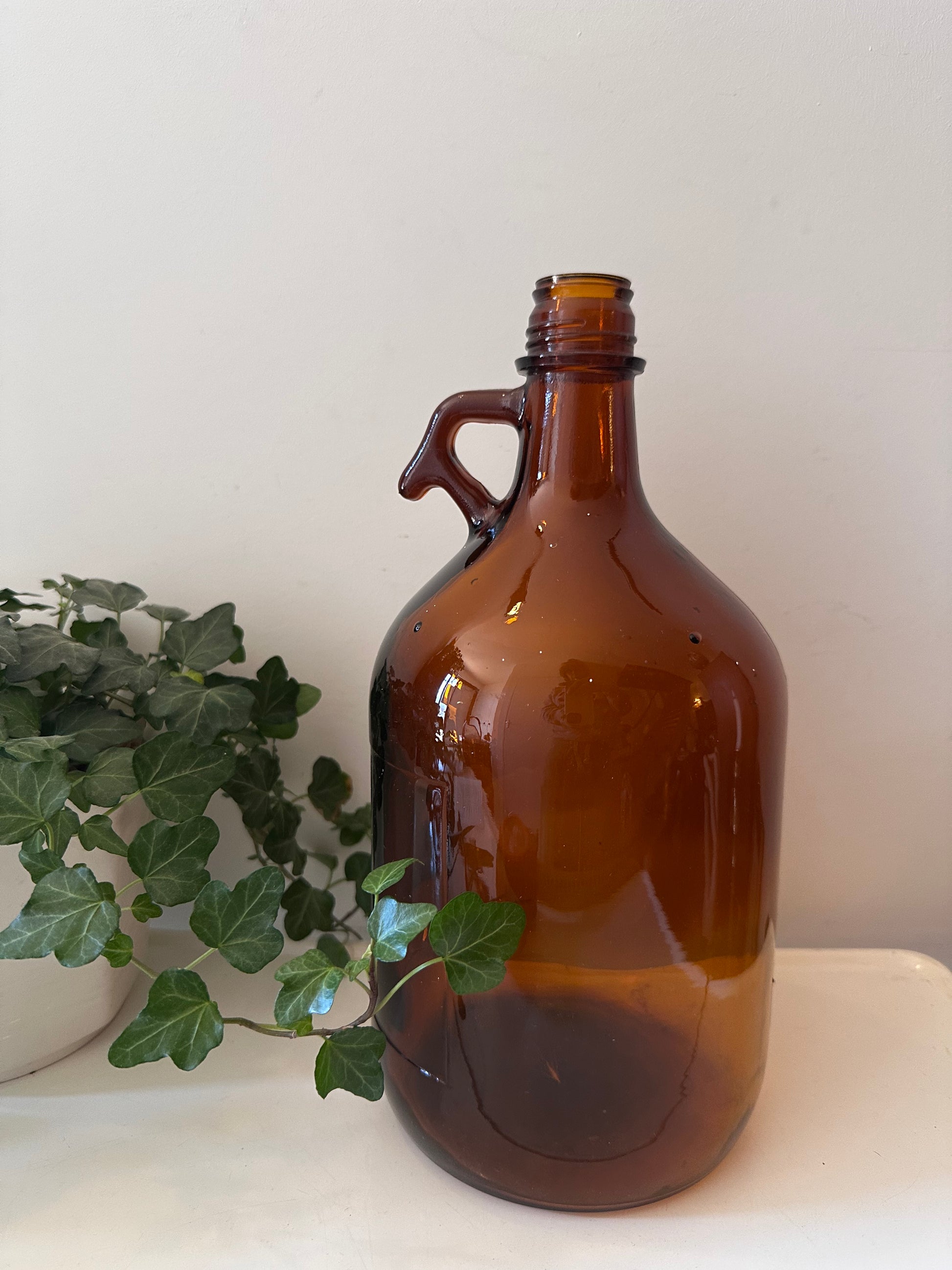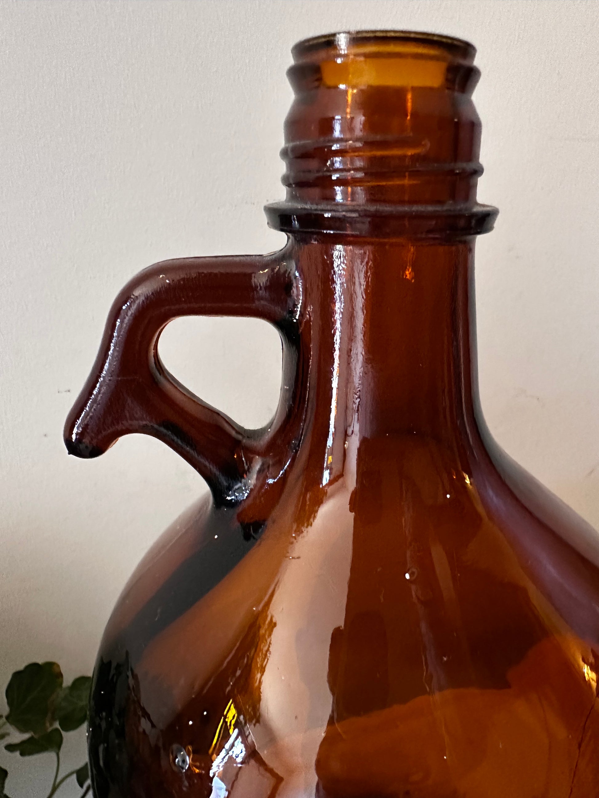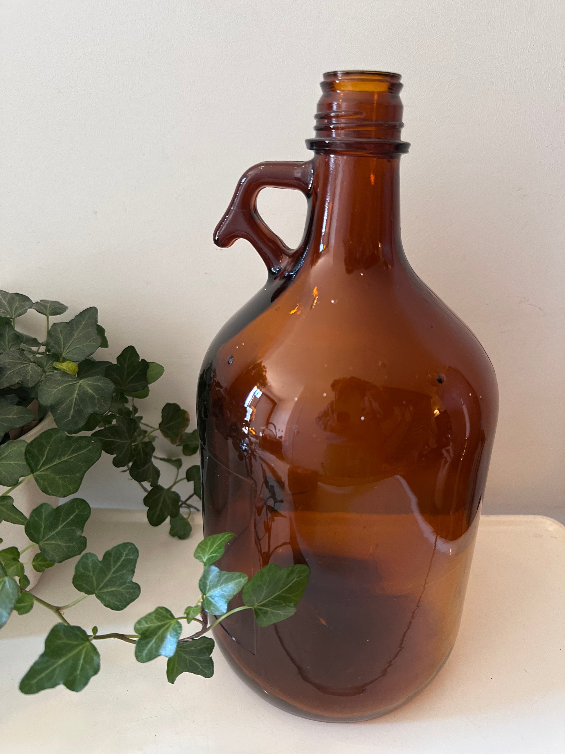 Stoere bruine flesvaas met handvat. De diepe amberkleur en robuuste vorm geven een vintage touch. Mooi met een tak erin of gewoon zo neerzetten.