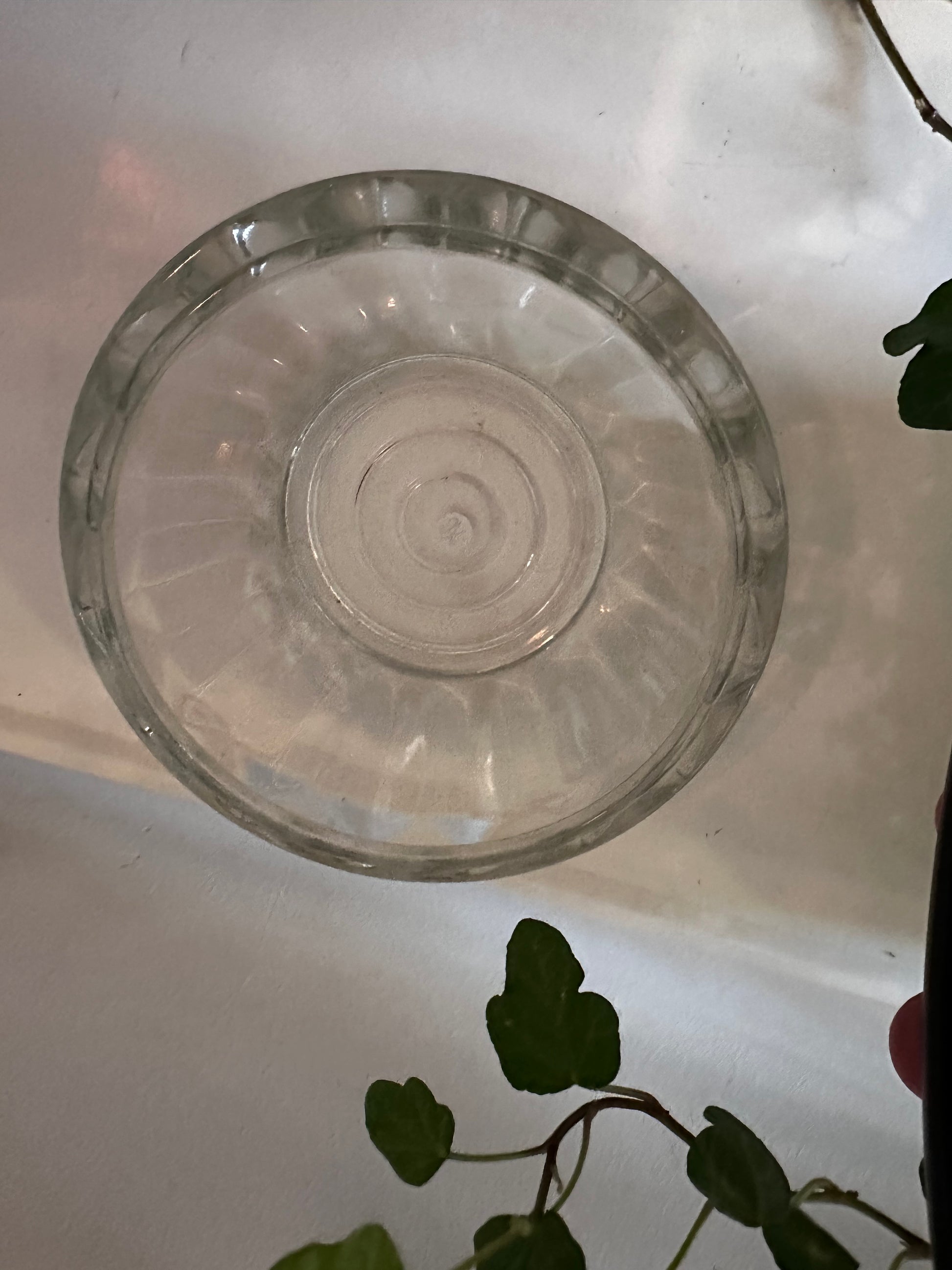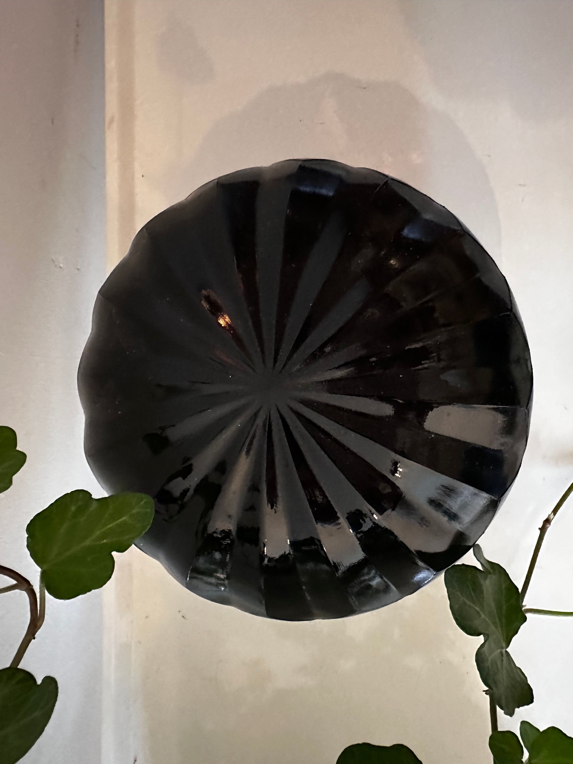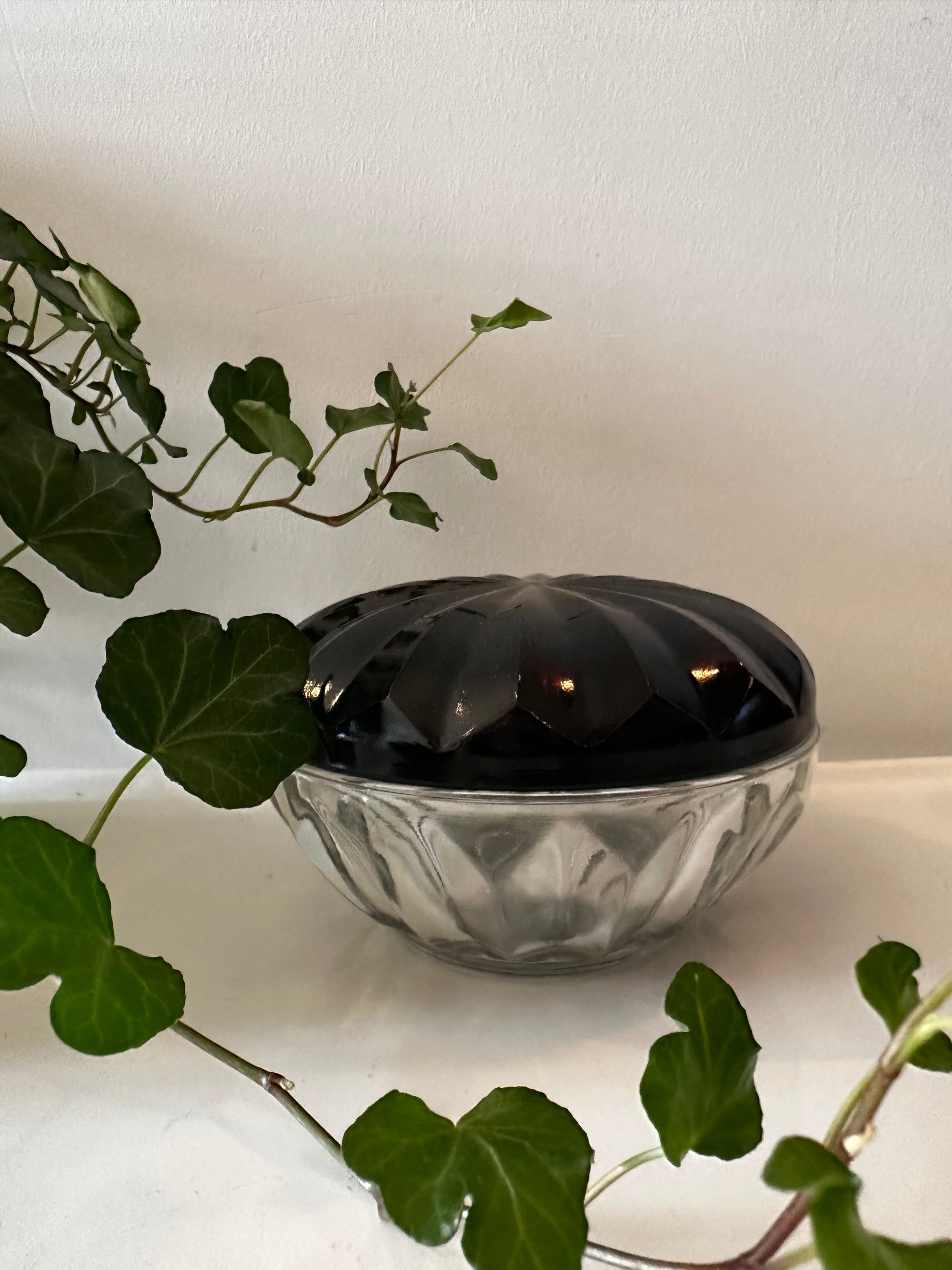 Een mooi Art Deco schaaltje gemaakt van glas. Deksel is van zwart glas en de onderkant van geribbeld transparant glas in je hand. Schaaltje is in een mooie vintage staat.