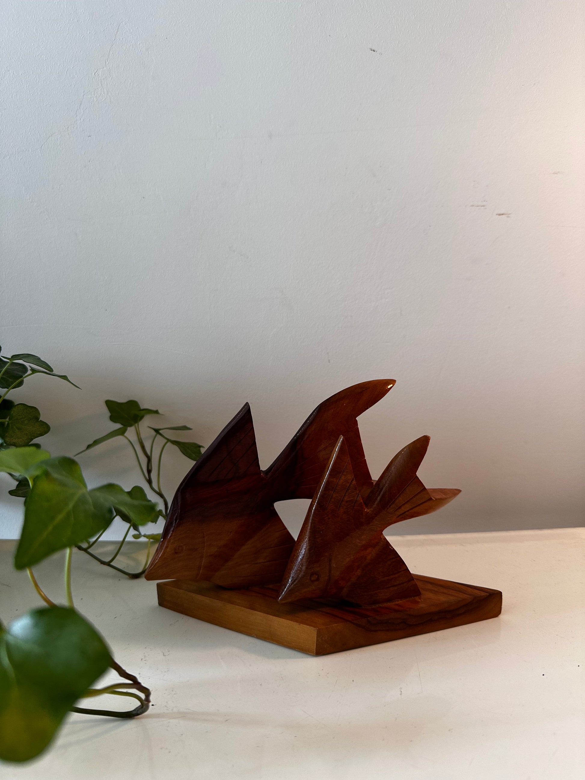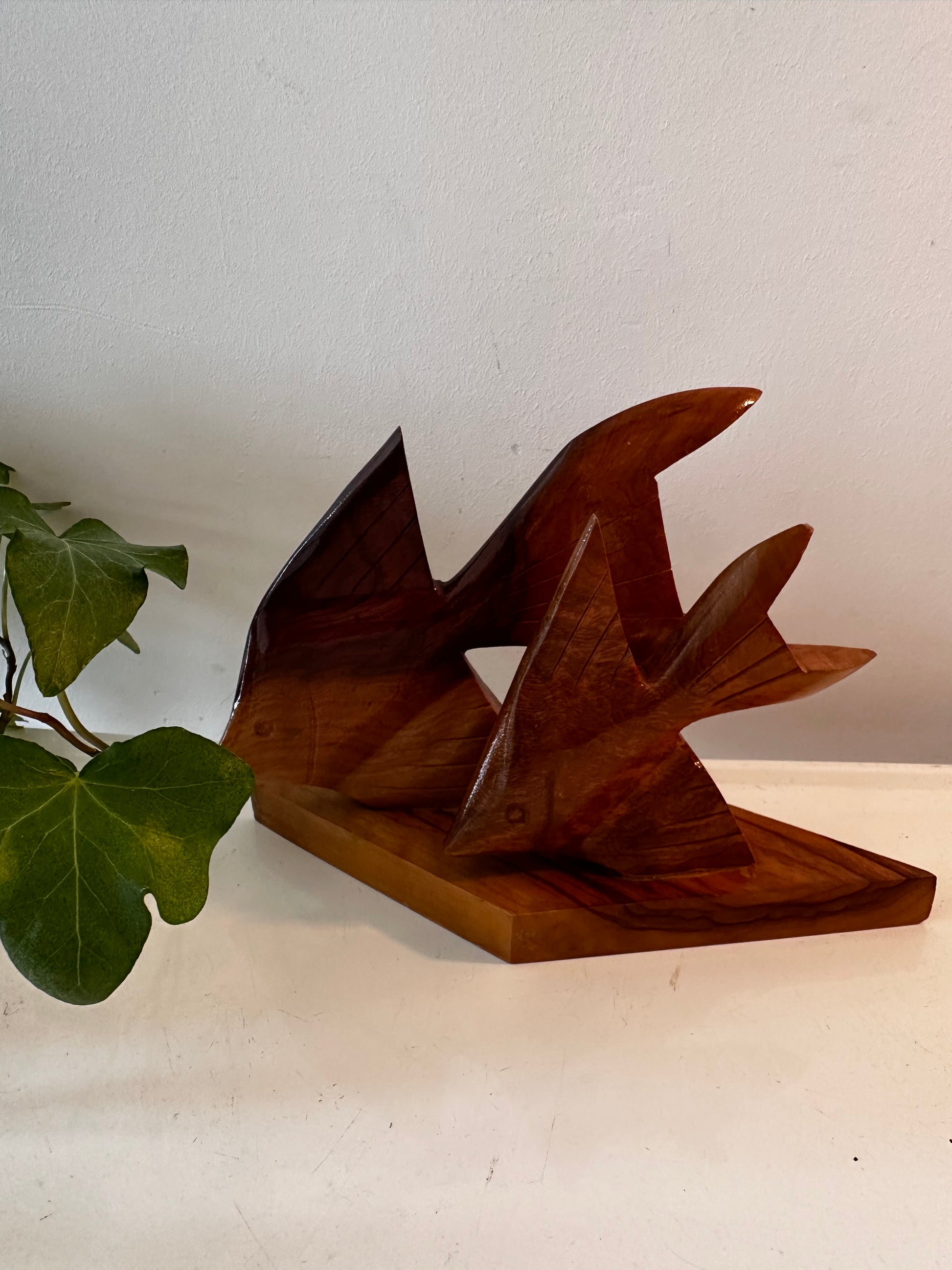 Een jaren 60 vintage houten beeldje. Dit teak houten beeld van twee vissen is in een supermooie vintage staat. Afkomstig uit Denemarken.