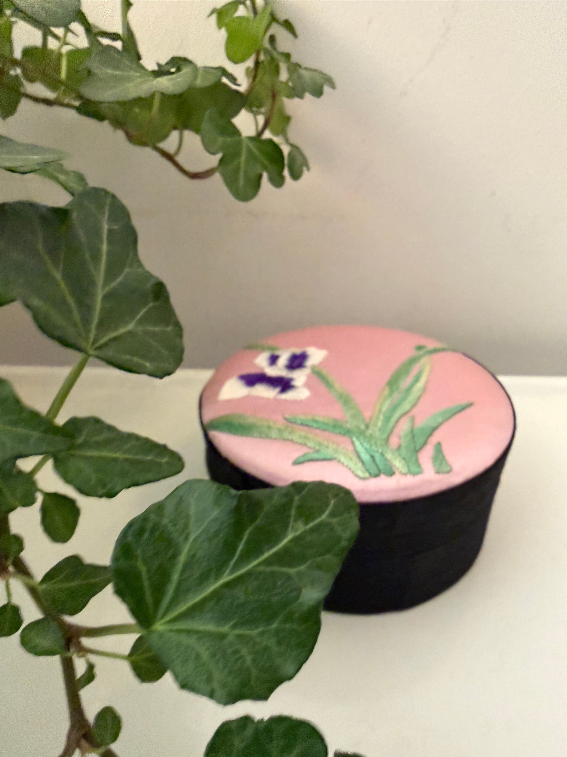 Oh zo leuk dit kleine ronde sieradendoosje 🩷 Zwart fluweel aan de buitenkant en een roze satijnen deksel met geborduurde bloem. Een fijn doosje voor ringen of kleine spulletjes. Q865