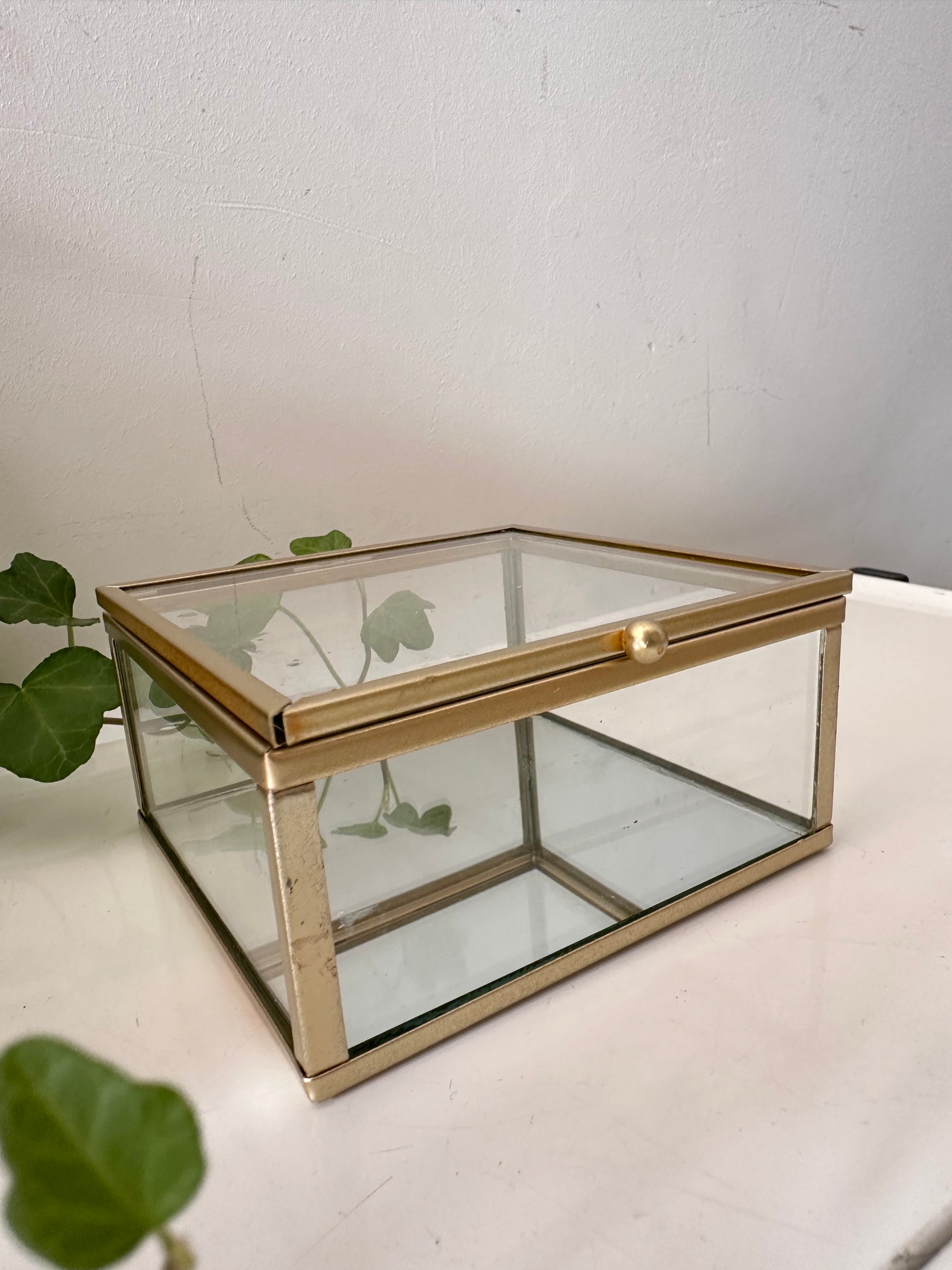 Superleuk glazen bewaardoosje met messing randen en een spiegeltje als bodem – ideaal voor sieraden of kleine schatten. Die goudkleurige afwerking geeft ‘m net dat chique vintage randje. Q522