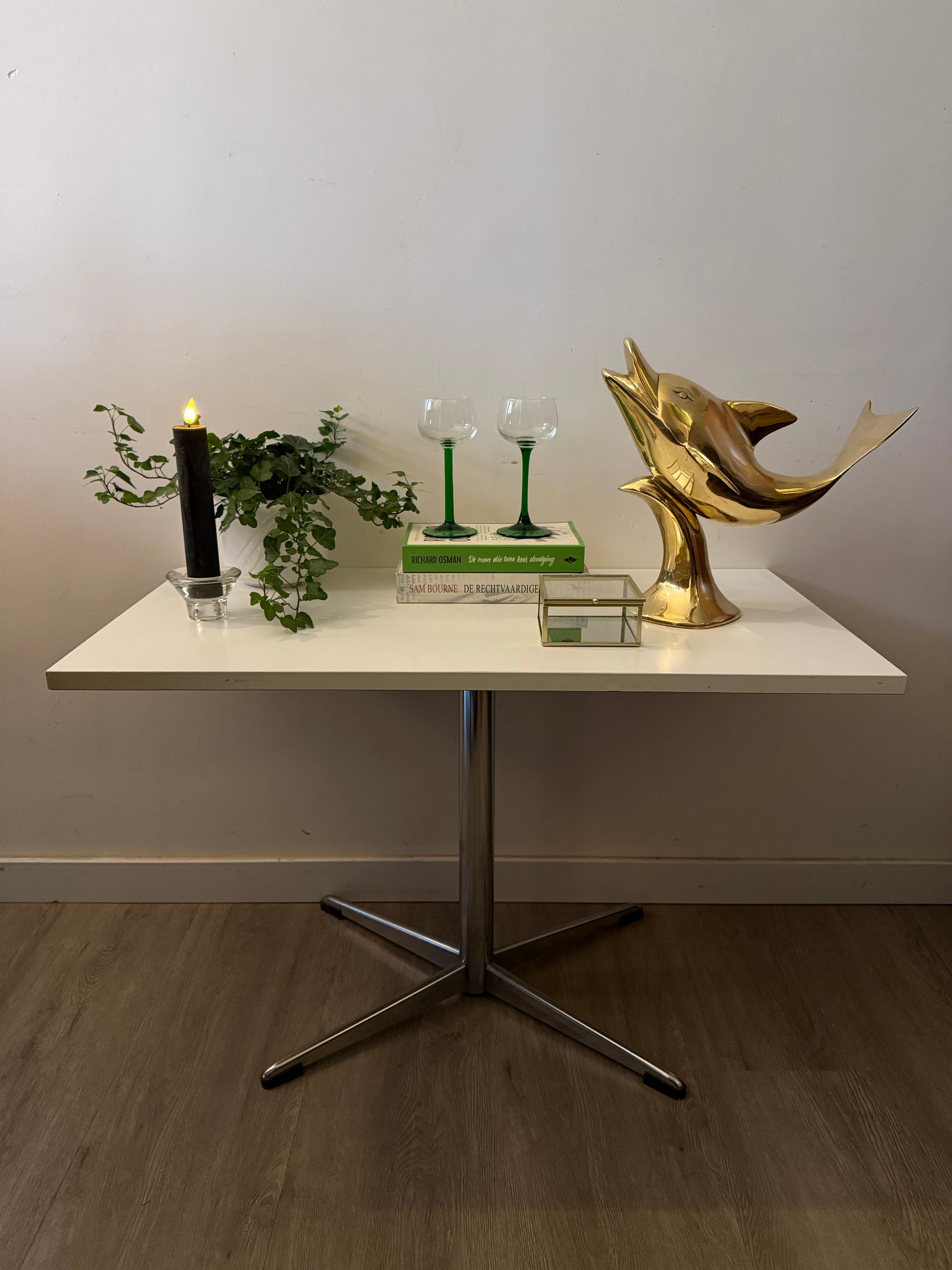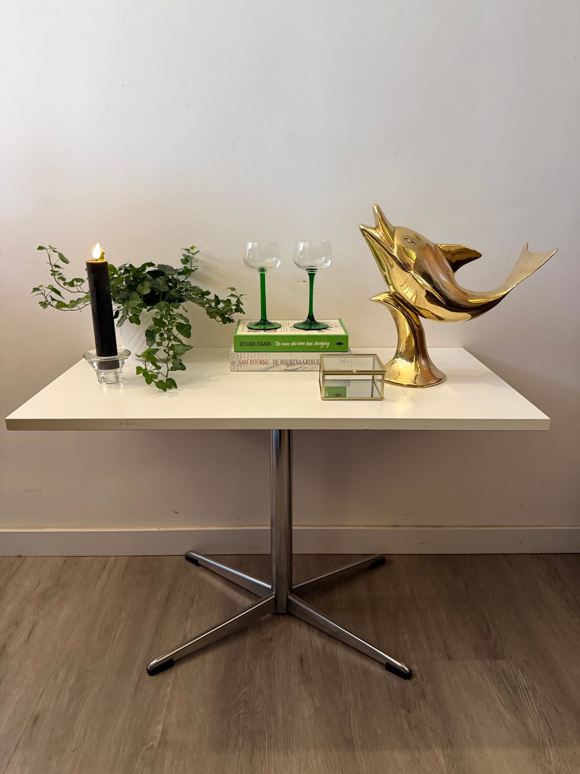 Strak wit blad met een glanzende chroom poot in kruisvorm. Clean model door de mix van wit en staal. Past helemaal in die jaren 70/80 sfeer met een lichte space-age touch. Stevig en stabiel, ideaal als bijzettafel of compacte sidetable.