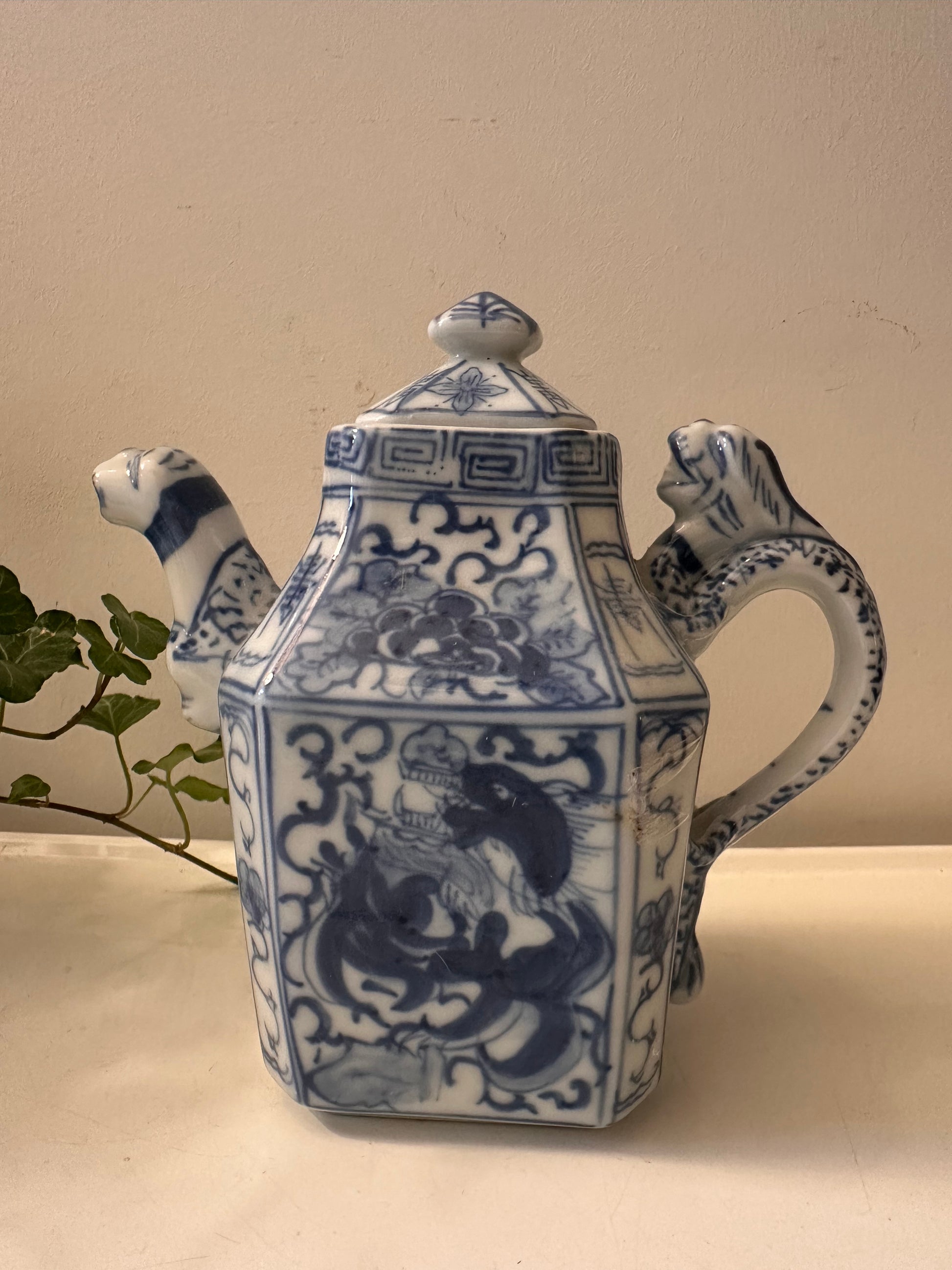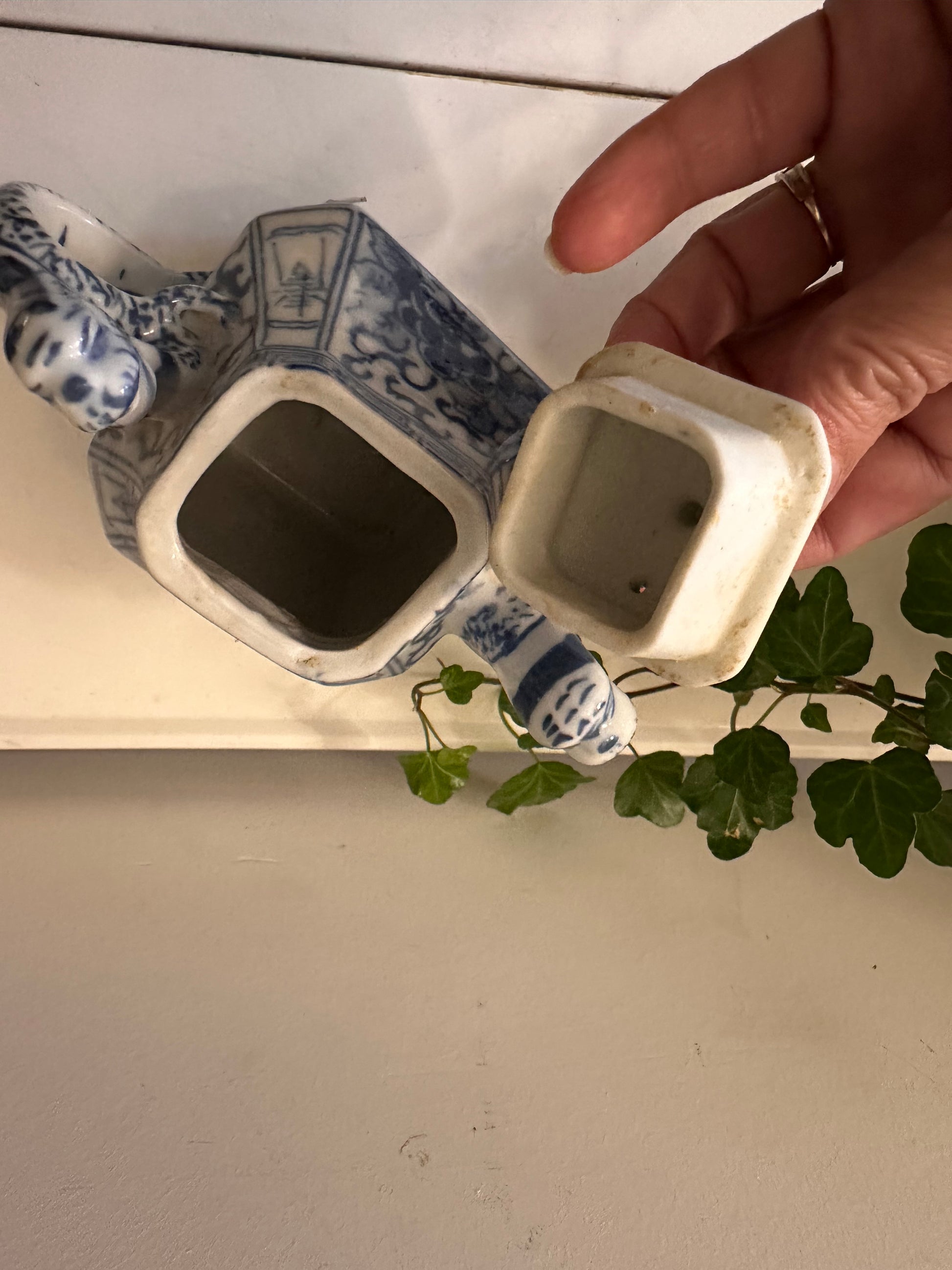 Onwijs gaaf exemplaar in Chinese stijl met leeuwenkop-handvat en dierenkop-tuit. Mooie zeshoekige vorm met klassiek blauw decor in Kangxi-stijl. Gemaakt in China rond de jaren 60-70, handbeschilderd porselein met stempel onderop. Q621