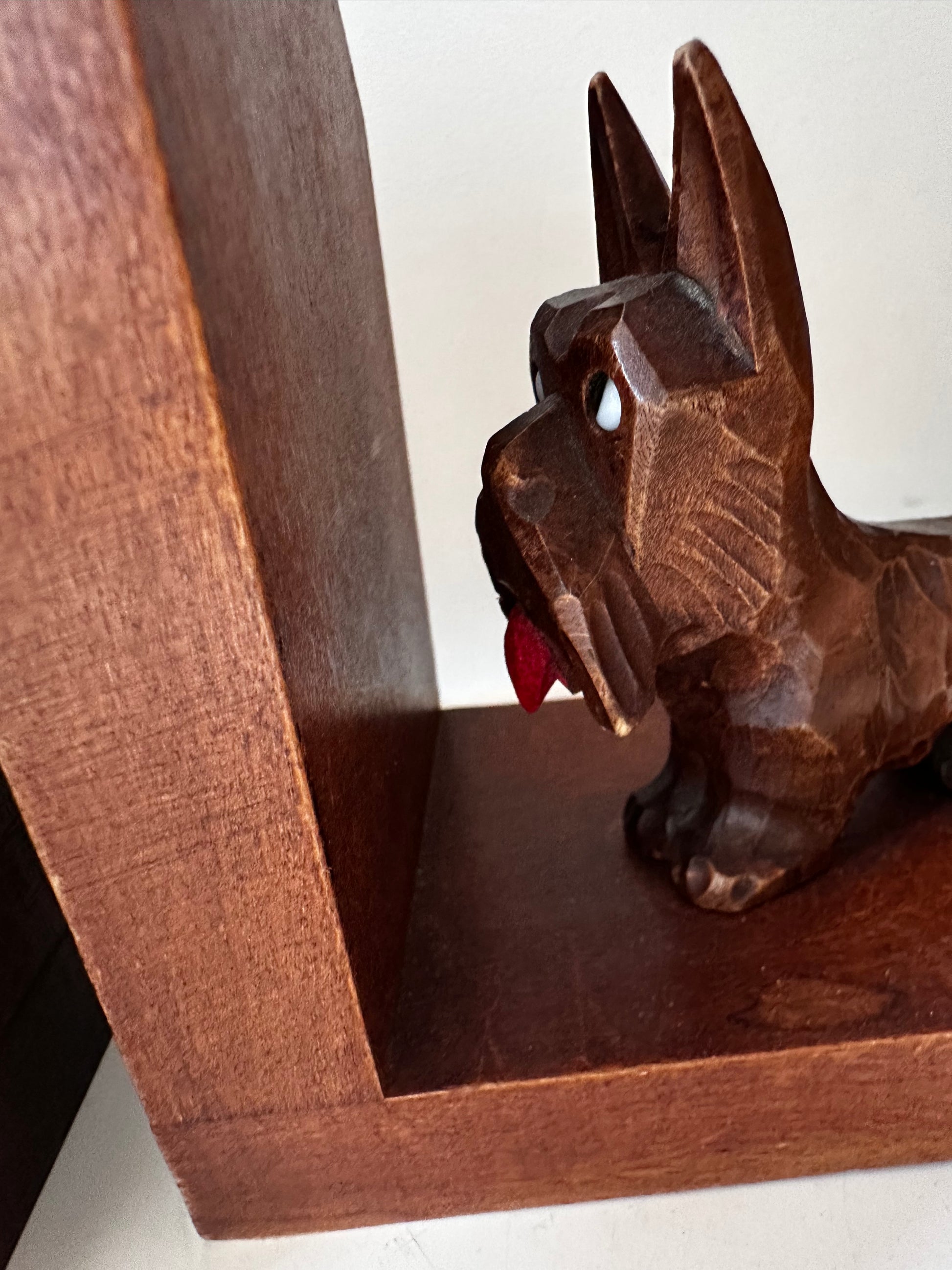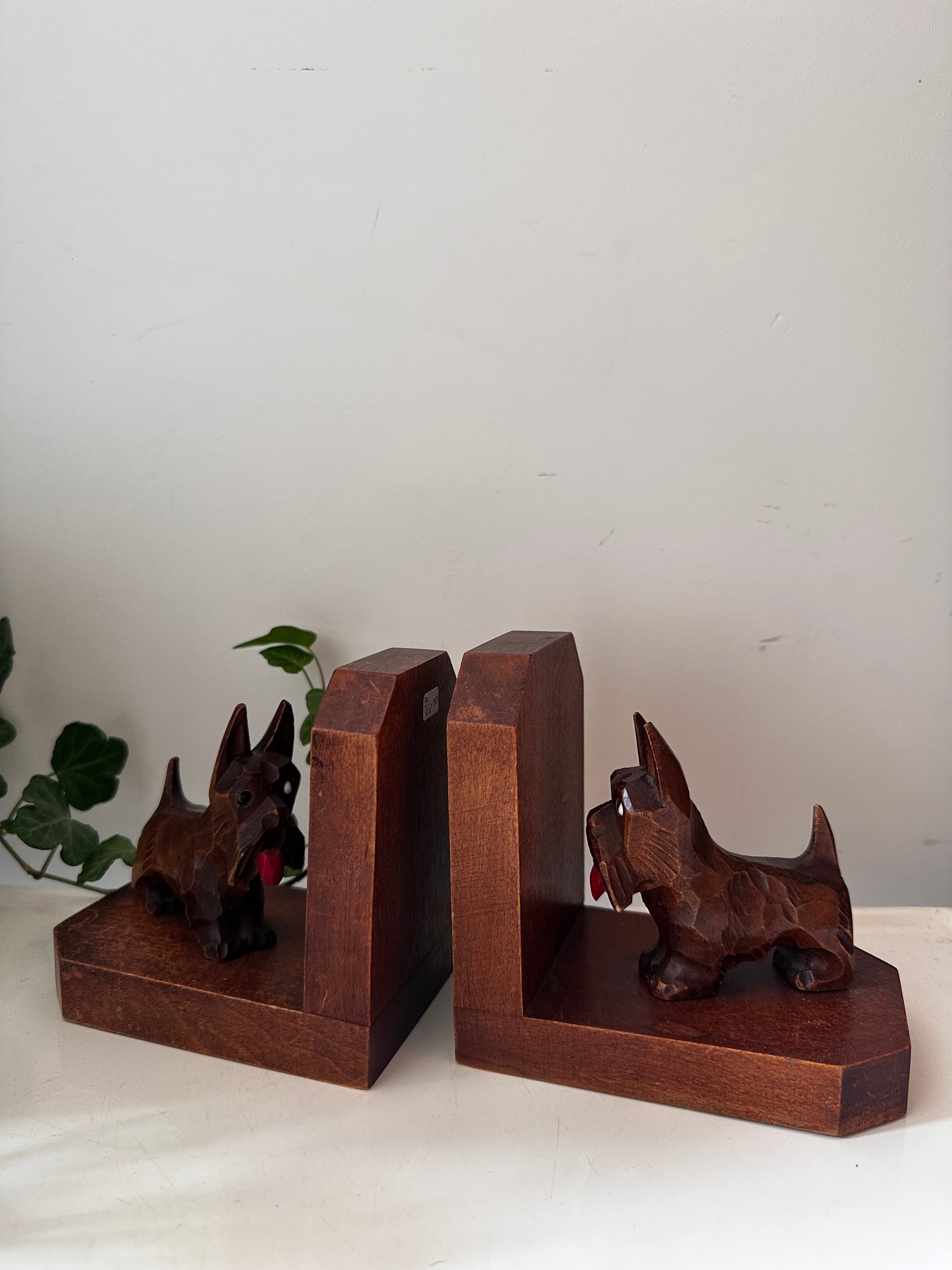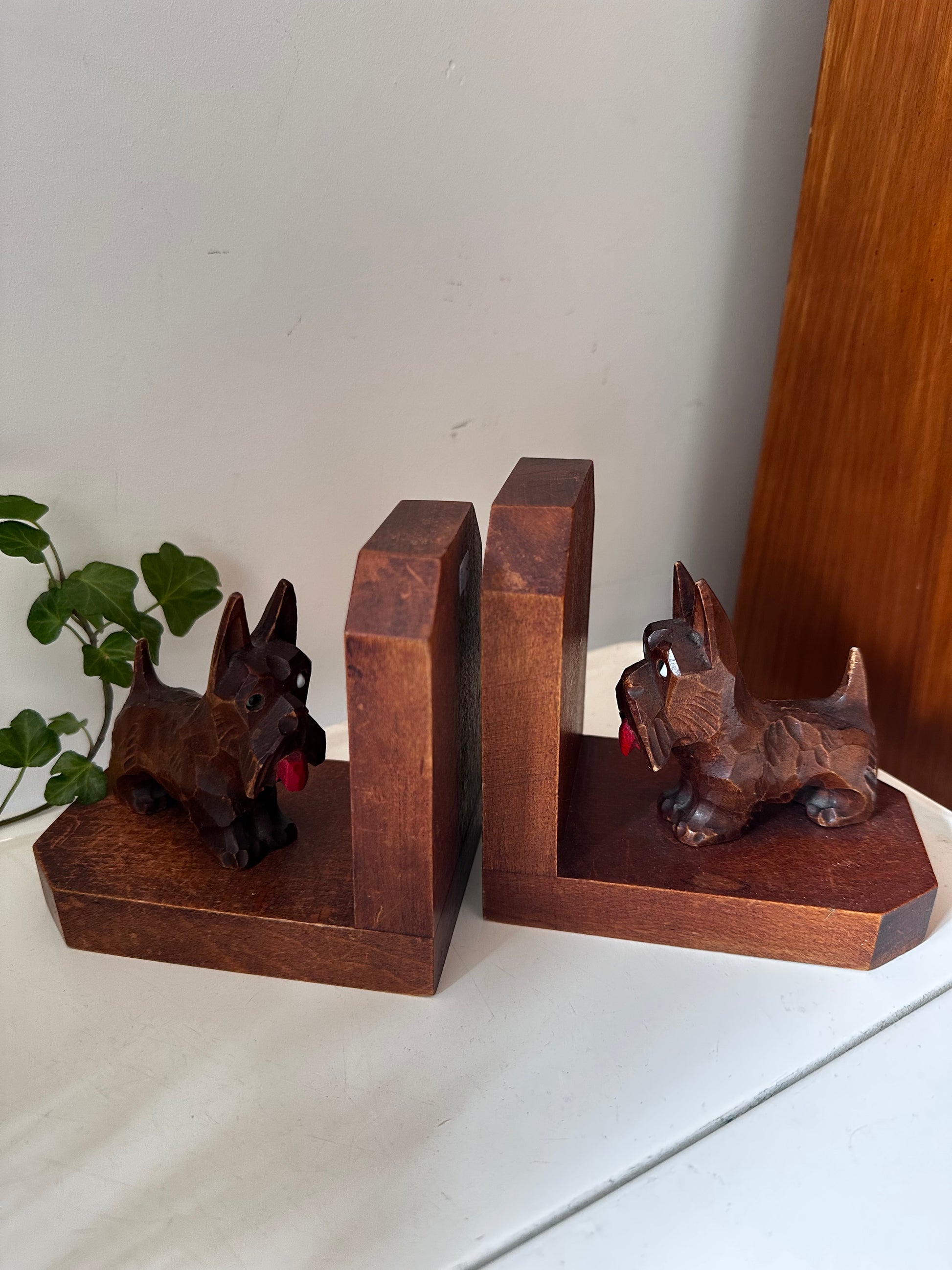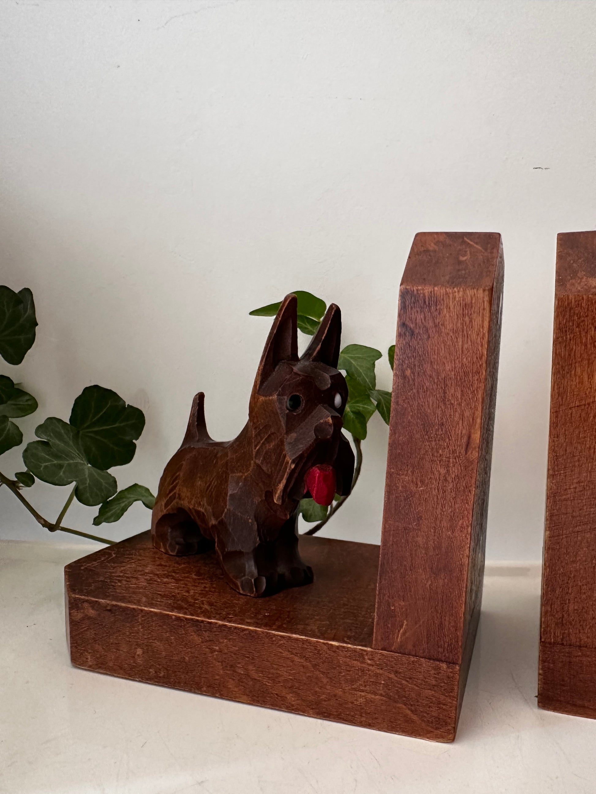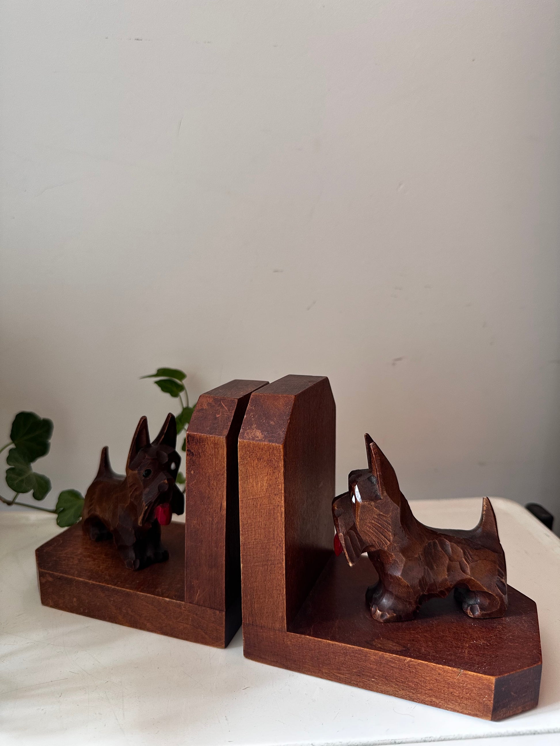 Superleuke set met gesneden Schotse terriërs. Gemaakt van massief hout, met oog voor detail — van de puntige oortjes tot de rode tong. Q94