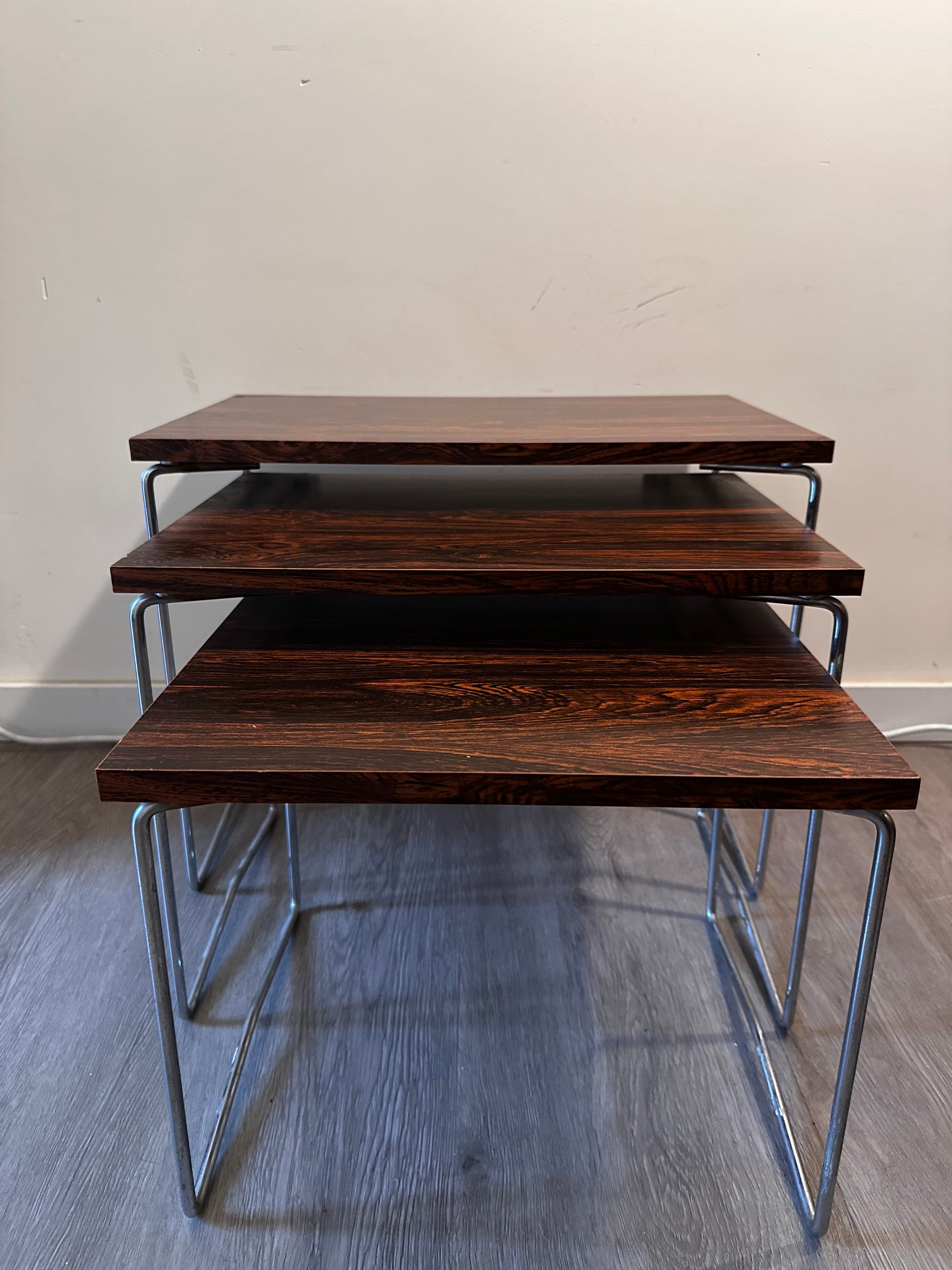 Een super toffe set nesting tables bijzettafeltjes. De tafeltjes zijn van het merk brantantia en dateren omstreeks de jaren 60/70. Set bestaat uit 3 tafeltjes met een houten blad en chroom onderstel. In een mooie vintage staat met lichte gebruiksporen die passen bij de leeftijd.