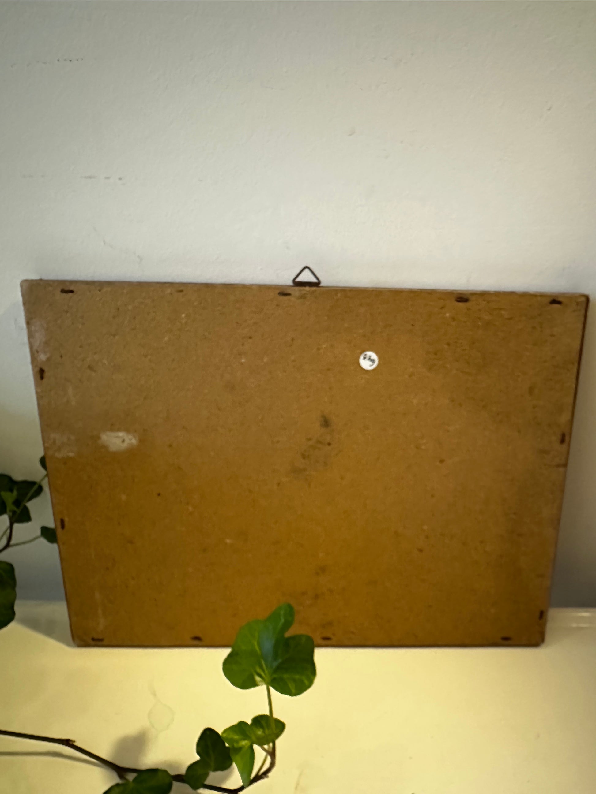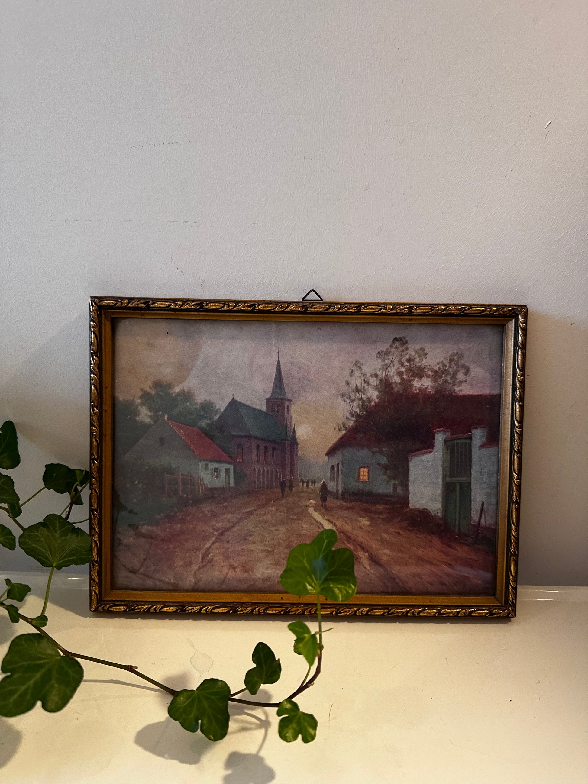 Romantisch brocante prentje in goudkleurig lijstje. In een mooie vintage staat. Prentje heeft een voorstelling van een landweggetje met kerk en boerderijtje.