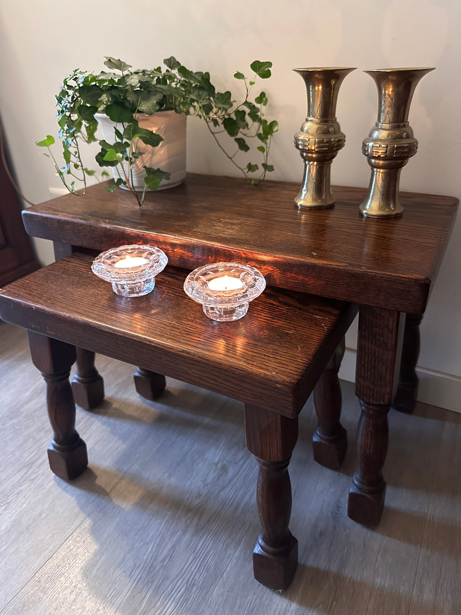 Een toffe set van 2 houten nesting tafeltjes. Deze brutalist stijl tafeltjes zijn in een mooie vintage staat. Tafeltjes dateren jaren 70.