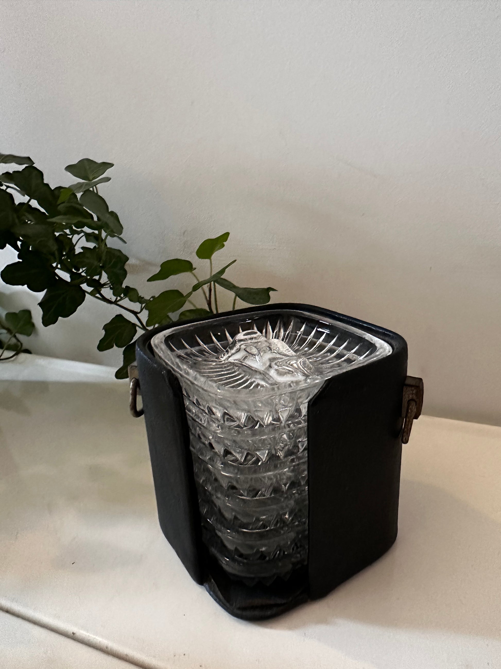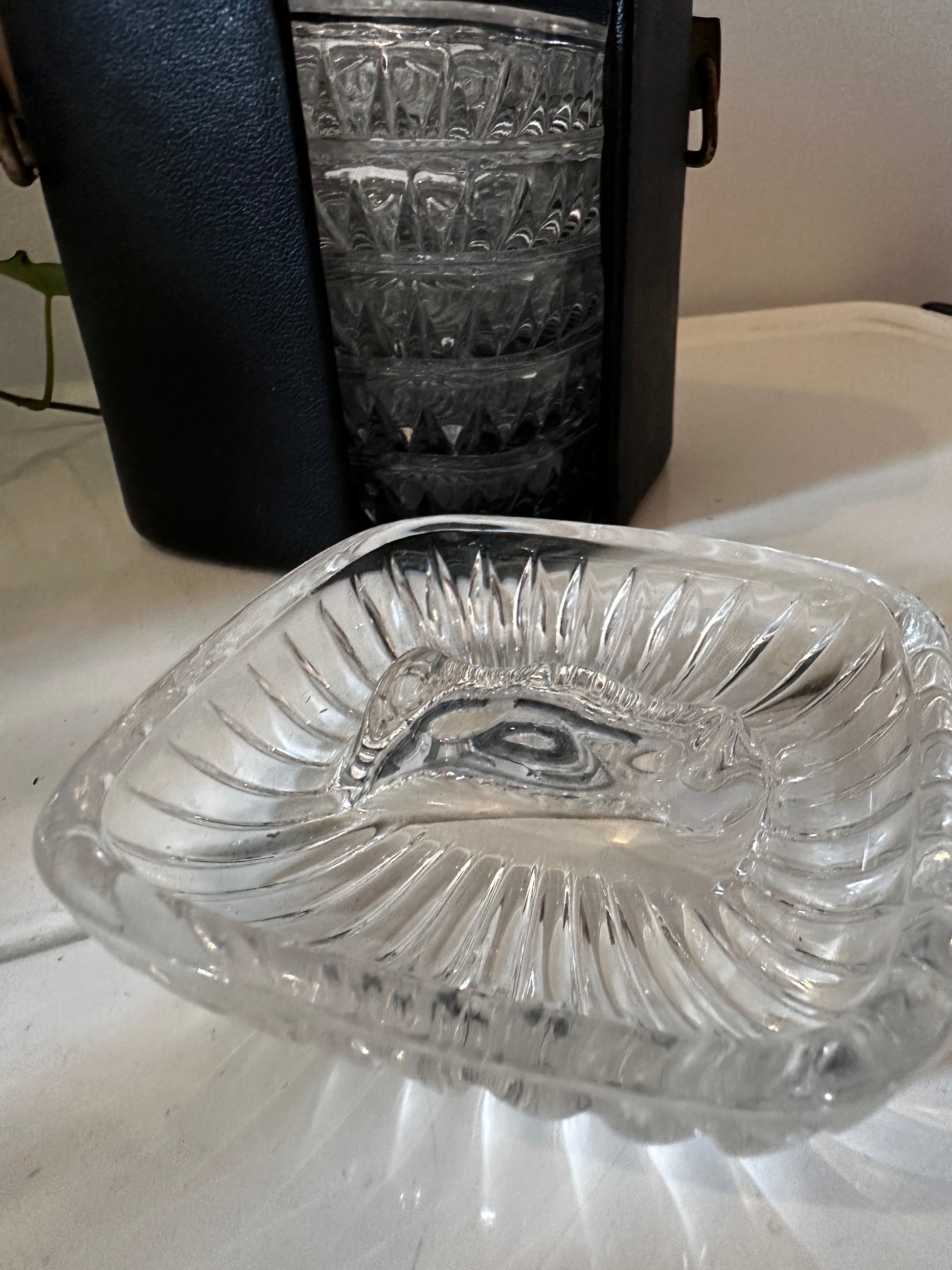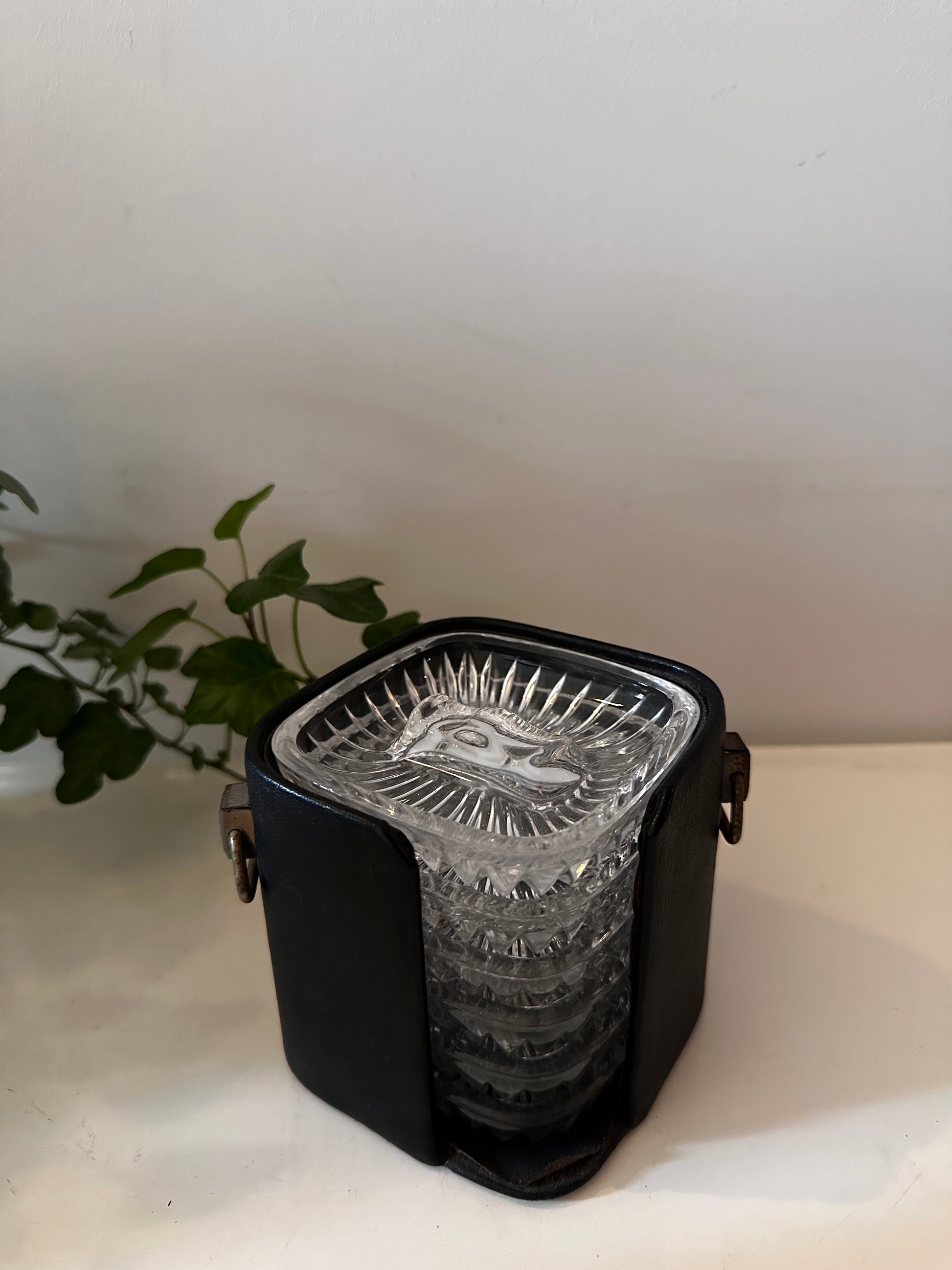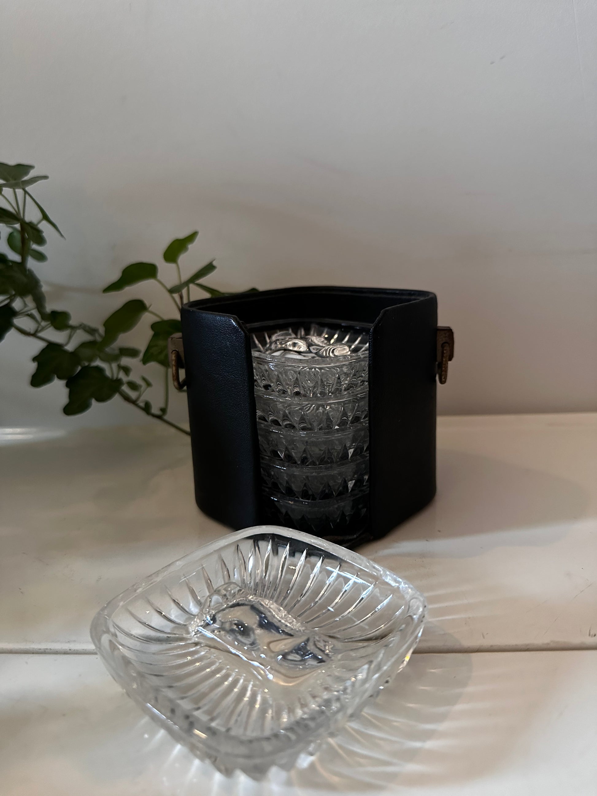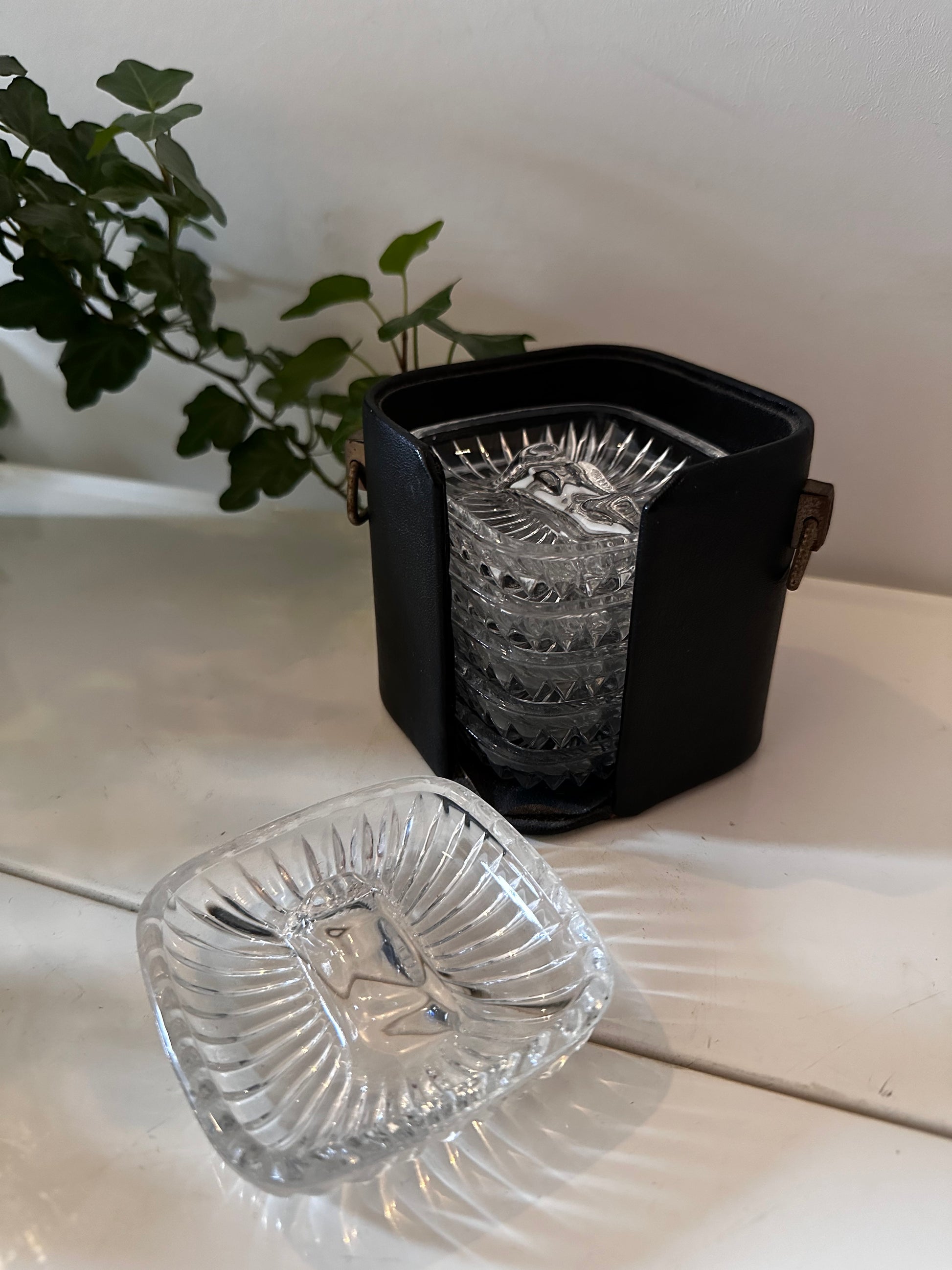 Cassette met kristallen asbakjes. Dateert uit de jaren 70. In een mooie vintage staat met lichte gebruikssporen passend bij de leeftijd.
