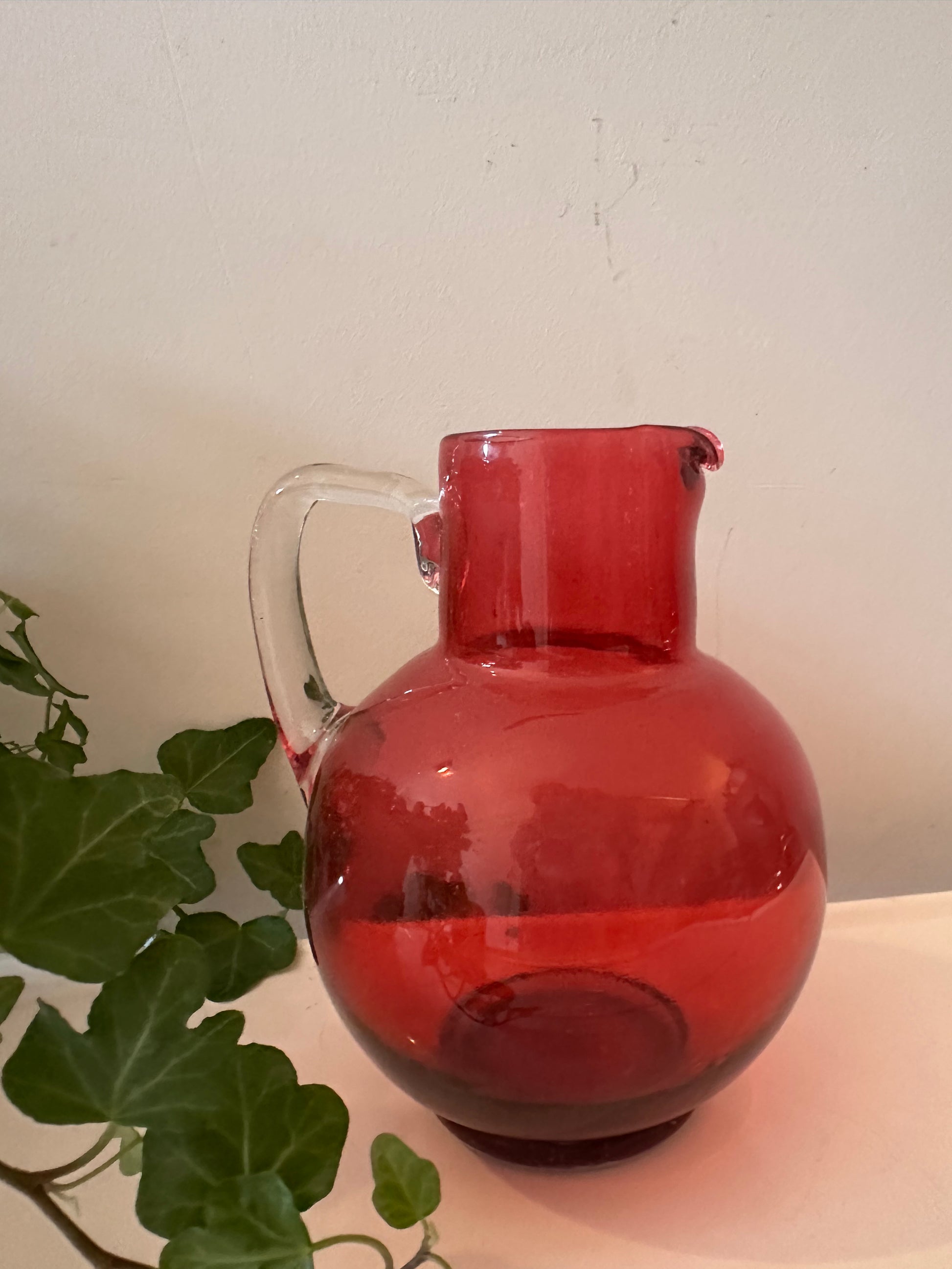 Supermooie vintage kan in diep robijnrood glas, met helder handvat en een mooie ronde buikvorm. Handgeblazen model uit de jaren 70, typisch voor Scandinavisch glaswerk uit die tijd. De kleur en vorm doen denken aan Holmegaard artglas — een echte blikvanger voor tafel of kast. Q527