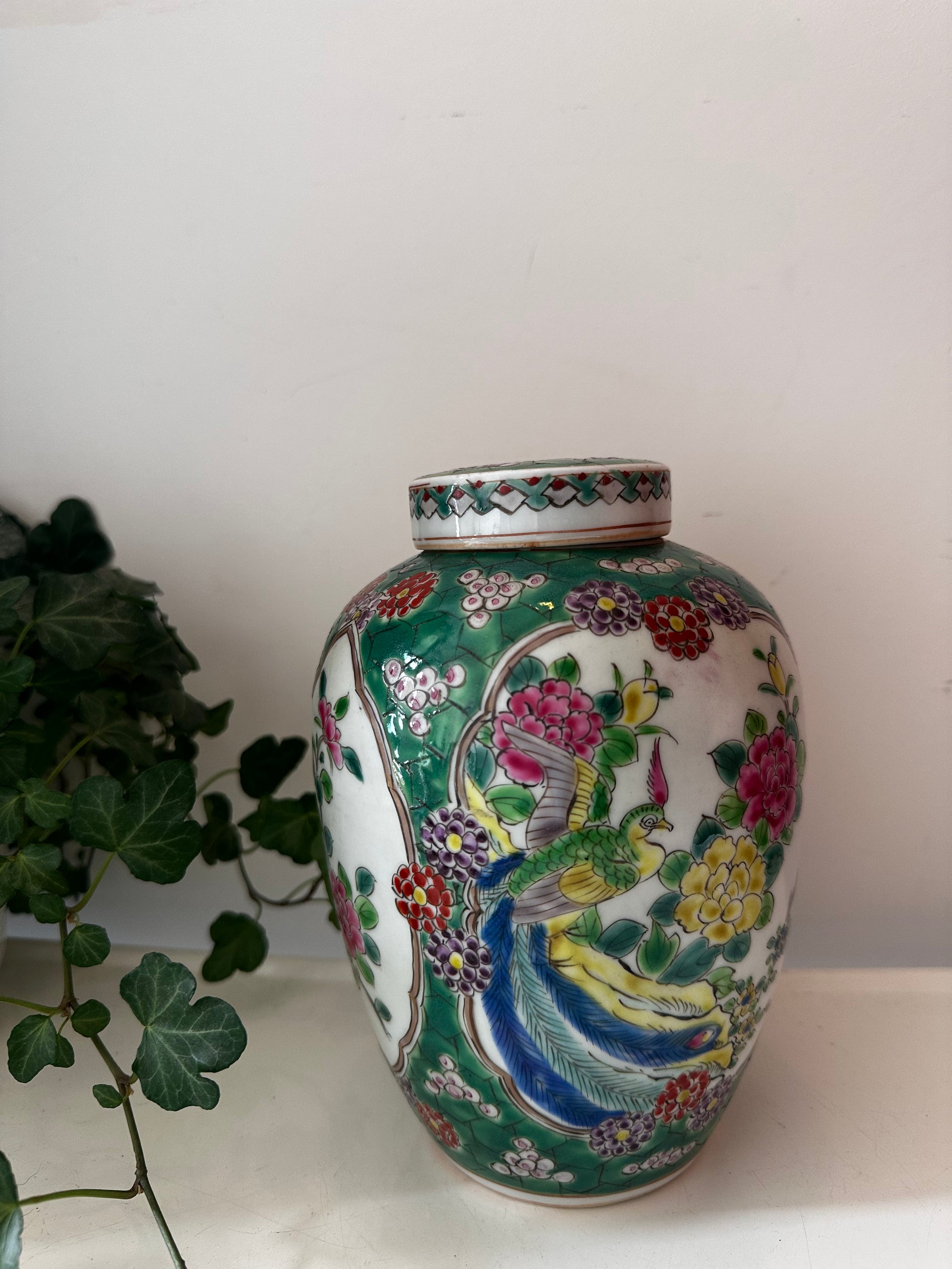Opvallende vintage porseleinen pot uit China, rijk versierd met bloemmotieven, een elegante dame en een kleurrijke vogel. Mooie groene achtergrond met fijne details in roze, paars en blauw – klassiek Chinees exportdesign met een vrolijke, decoratieve uitstraling. Gemerkt aan de onderzijde. Q27
