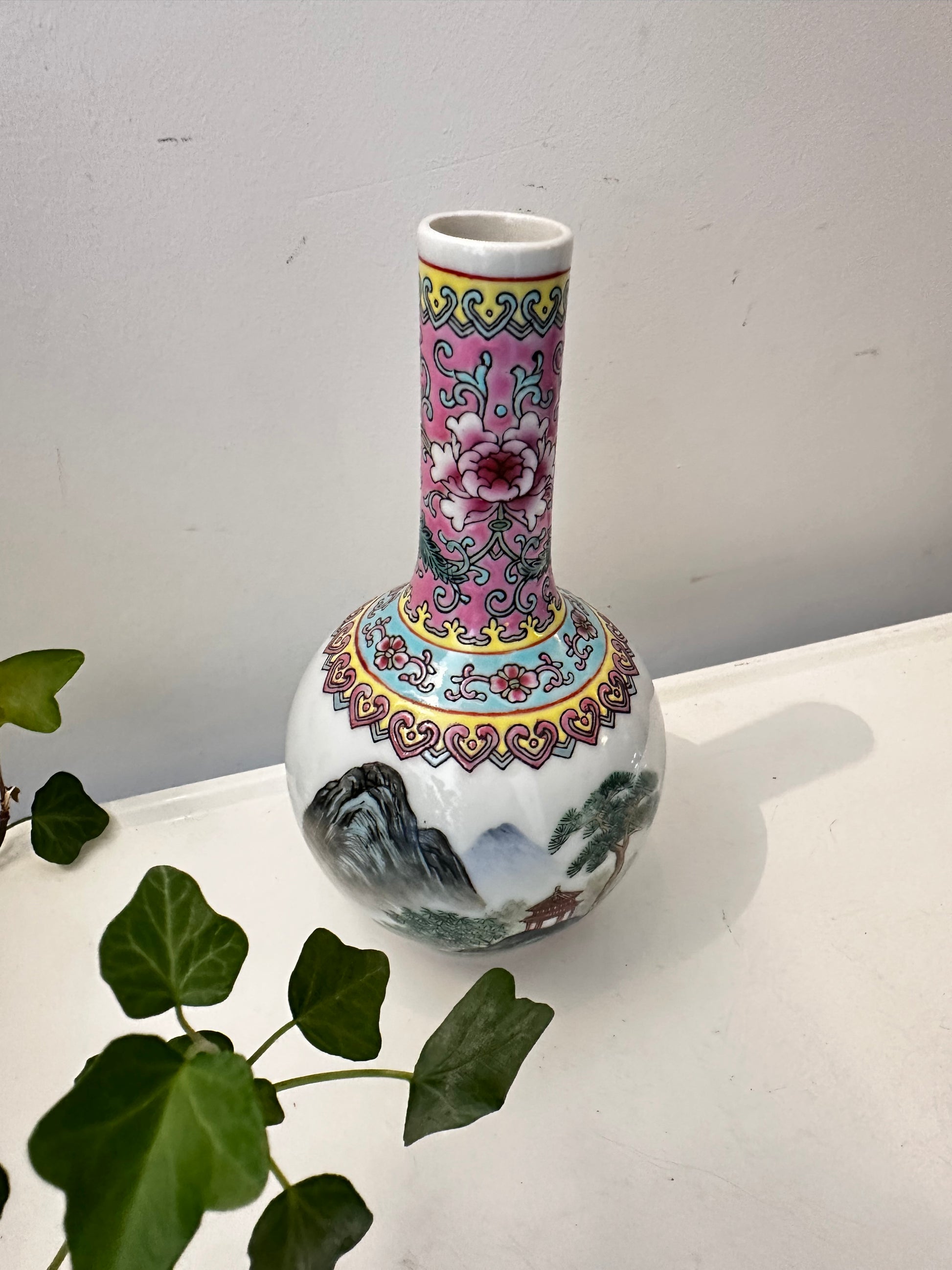Deze porseleinen vaas is een plaatje met zijn lange slanke hals in roze met florale motieven en een klassieke landschapsschildering op de buik. Aan de onderzijde staat een rood merkteken in Chinese karakters. In een mooie vintage staat. Q197