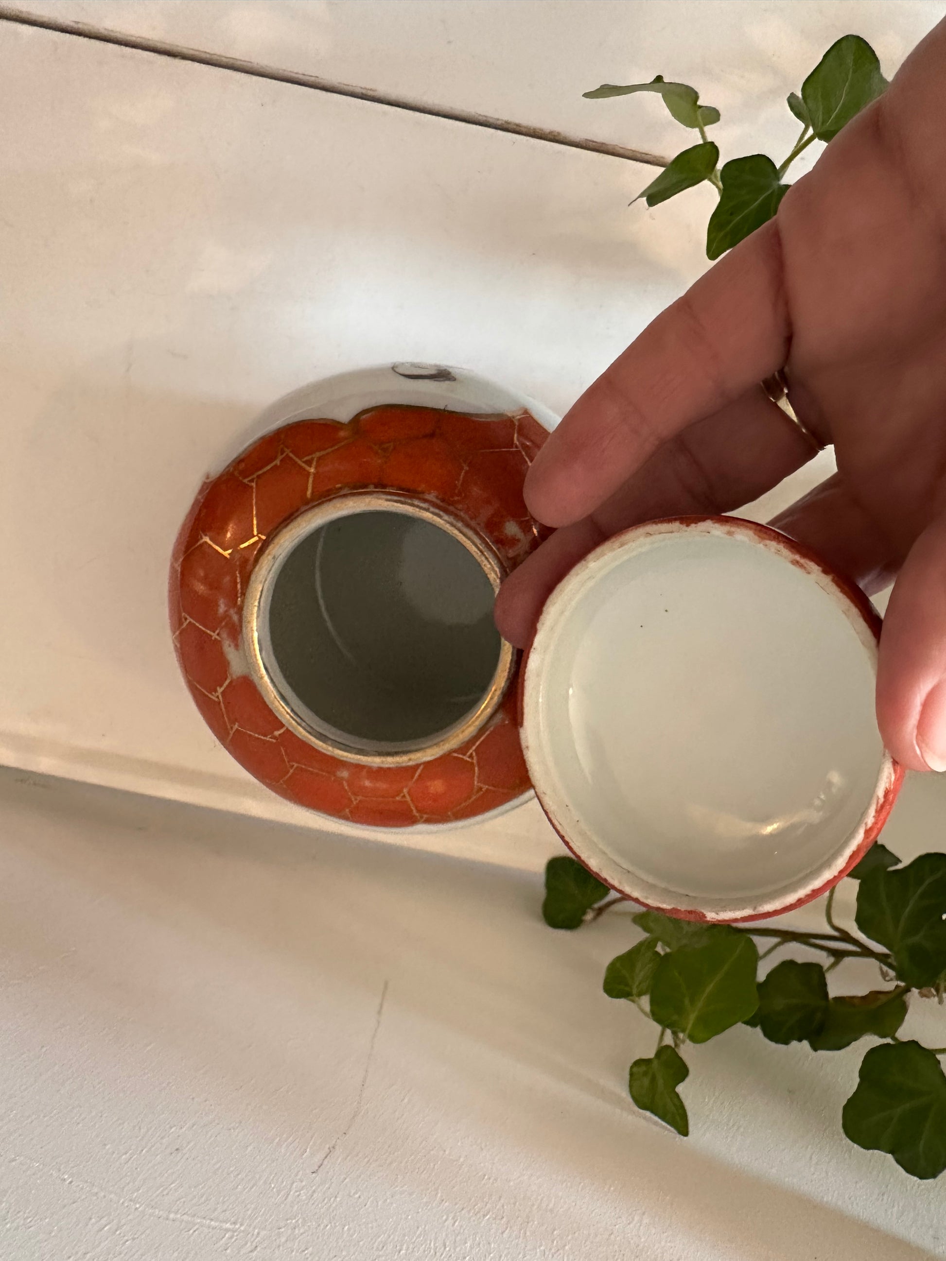 Hoe leuk is dit kleine porseleinen potje met deksel! Handbeschilderd met klassieke figuren in rood, roze en groen tinten. Dit soort potjes werd in de jaren 60–70 veel vanuit China naar Europa geëxporteerd. Leuk als decoratie of om kleine spulletjes in te bewaren. Q21
