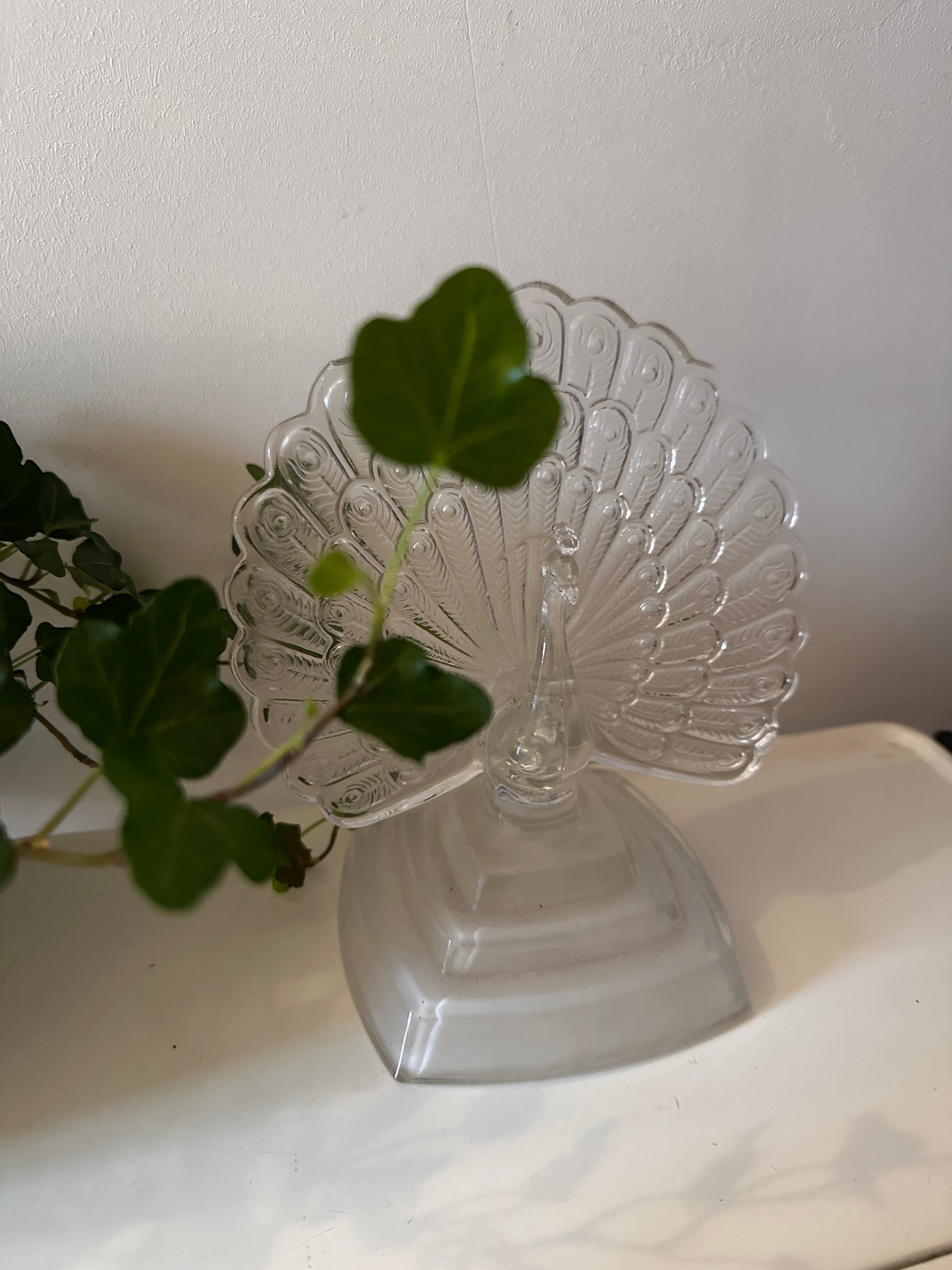 Een prachtig pronkstuk. Cristal D’Argue kristal glazen pauw. In een supermooie vintage staat. De voet is van mat glas en de pauw zelf is transparant.