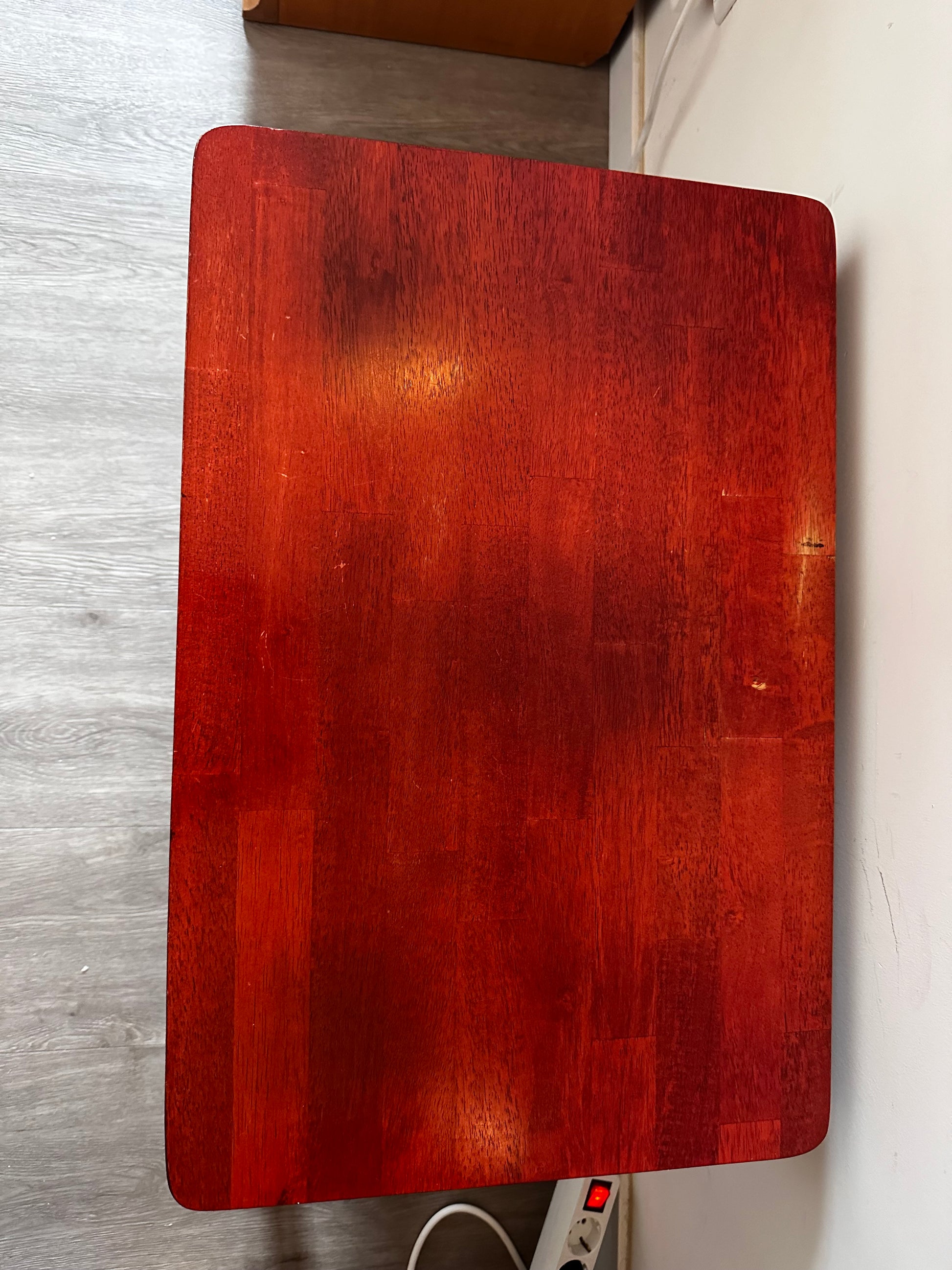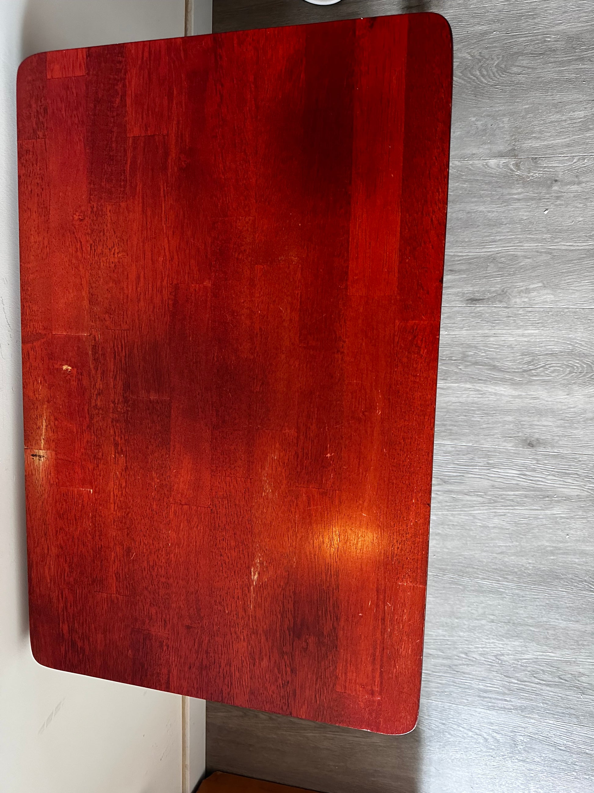 Geweldig leuk Deens design bijzettafeltje met een strak ontwerp. Poten van de tafel zijn een vierkant frame. Tafeltje heeft een roodbruine kleur. In een mooie vintage staat met lichte gebruiksporen.