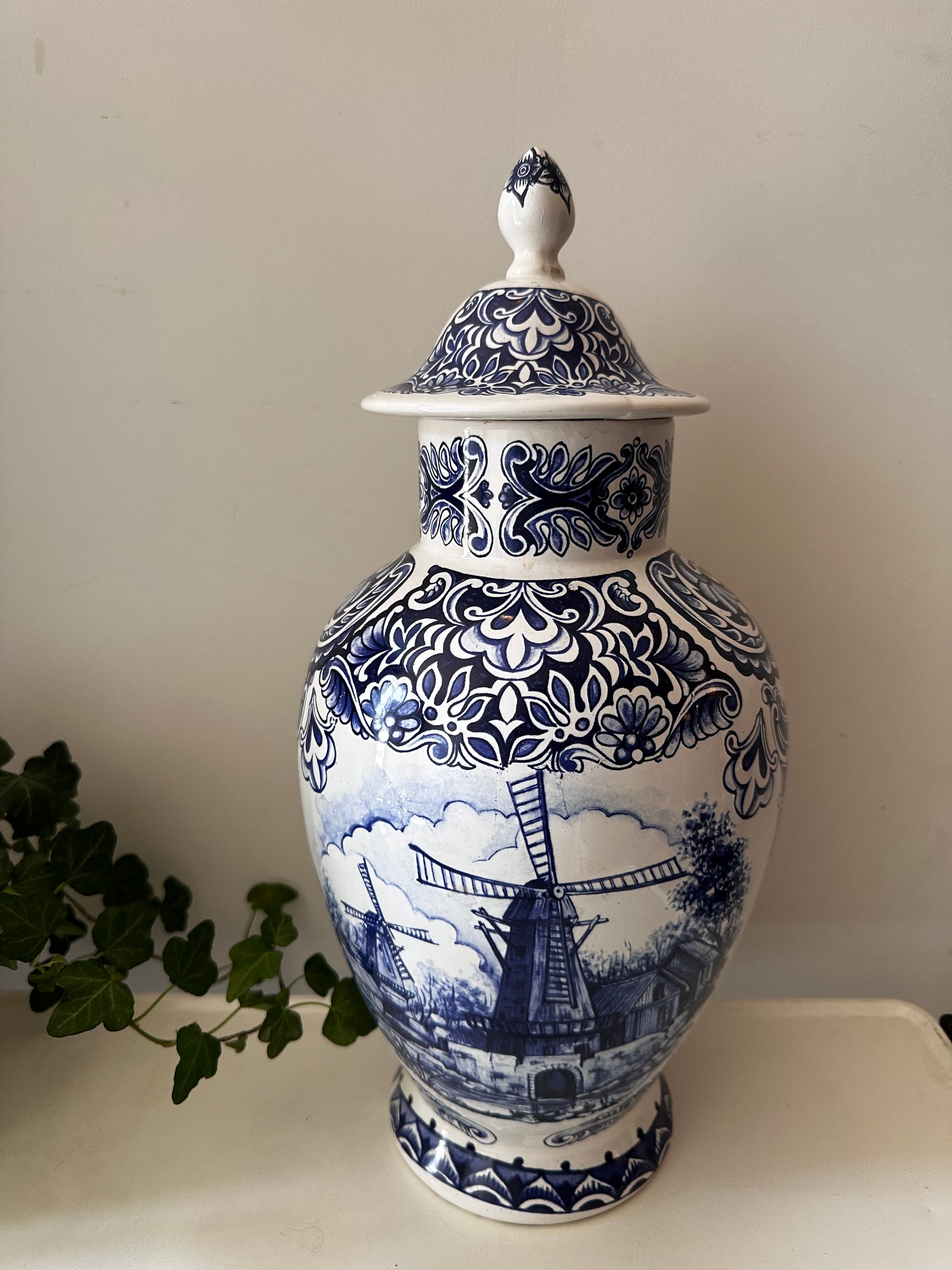 Prachtige vintage vaas met deksel, met handgeschilderd molenlandschap en sierlijke florale patronen in klassiek Delfts blauw. De vaas is gemerkt ‘T. DELFTS BLEAU’ aan de onderzijde en heeft een craquelé afwerking die bijdraagt aan de charme. Onderaan zit een haarlijn (zie foto), maar de vaas is nog steeds stevig en prachtig. Q119