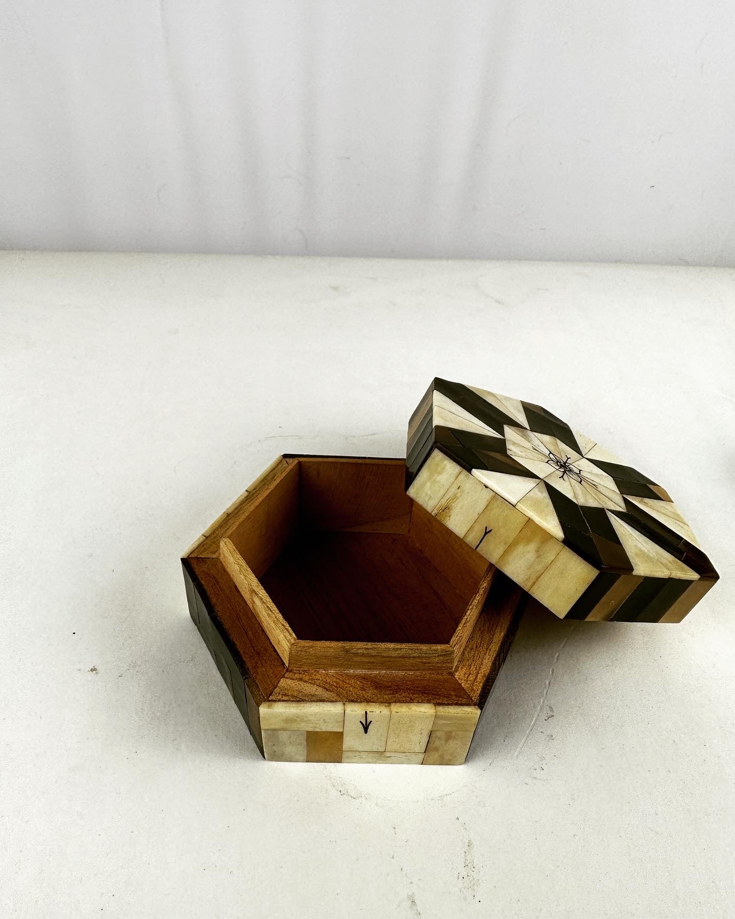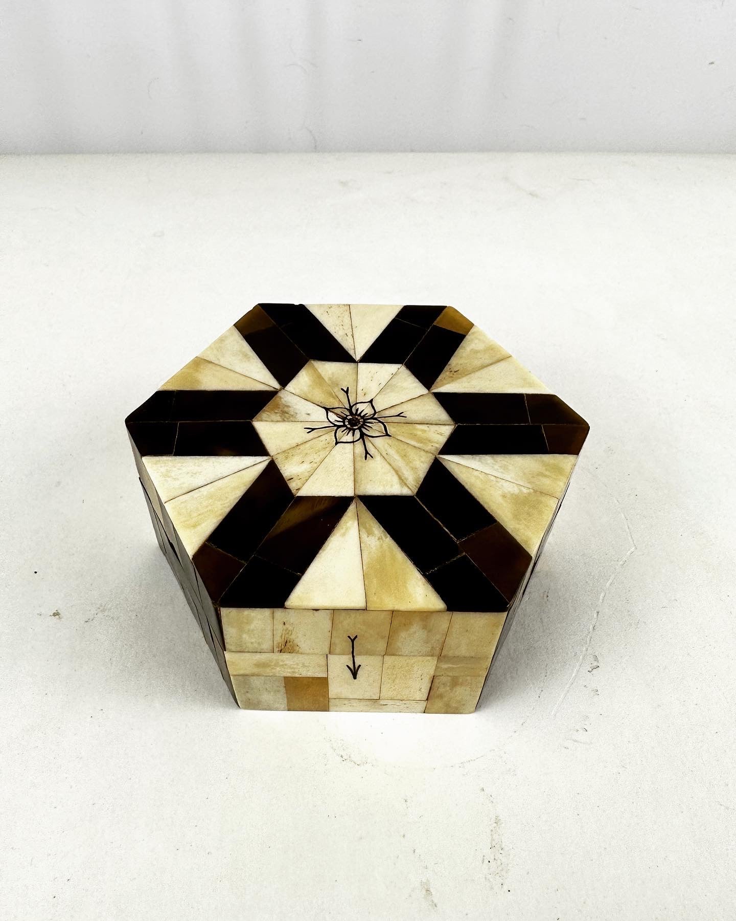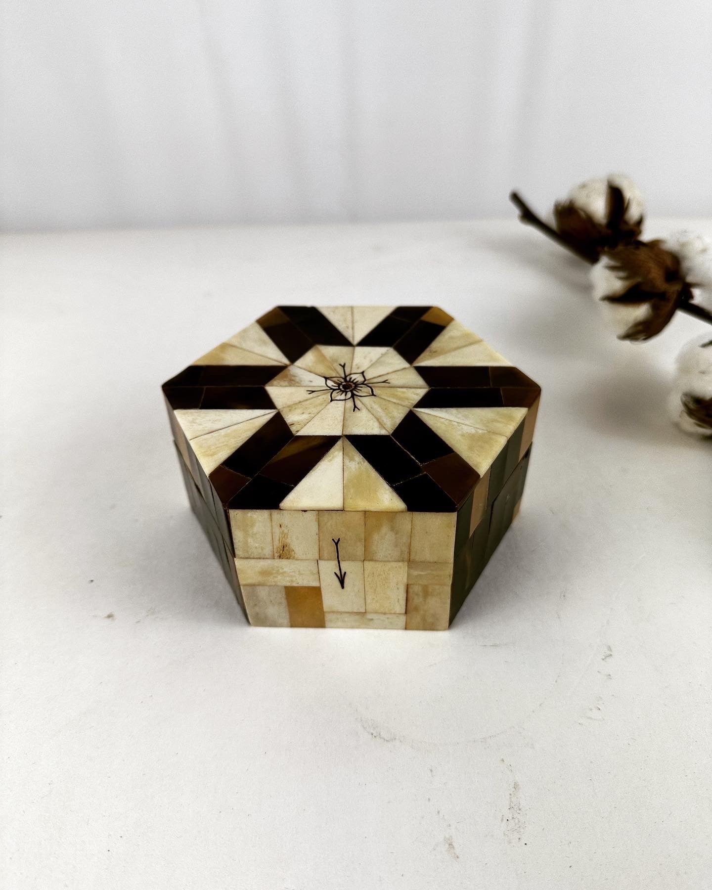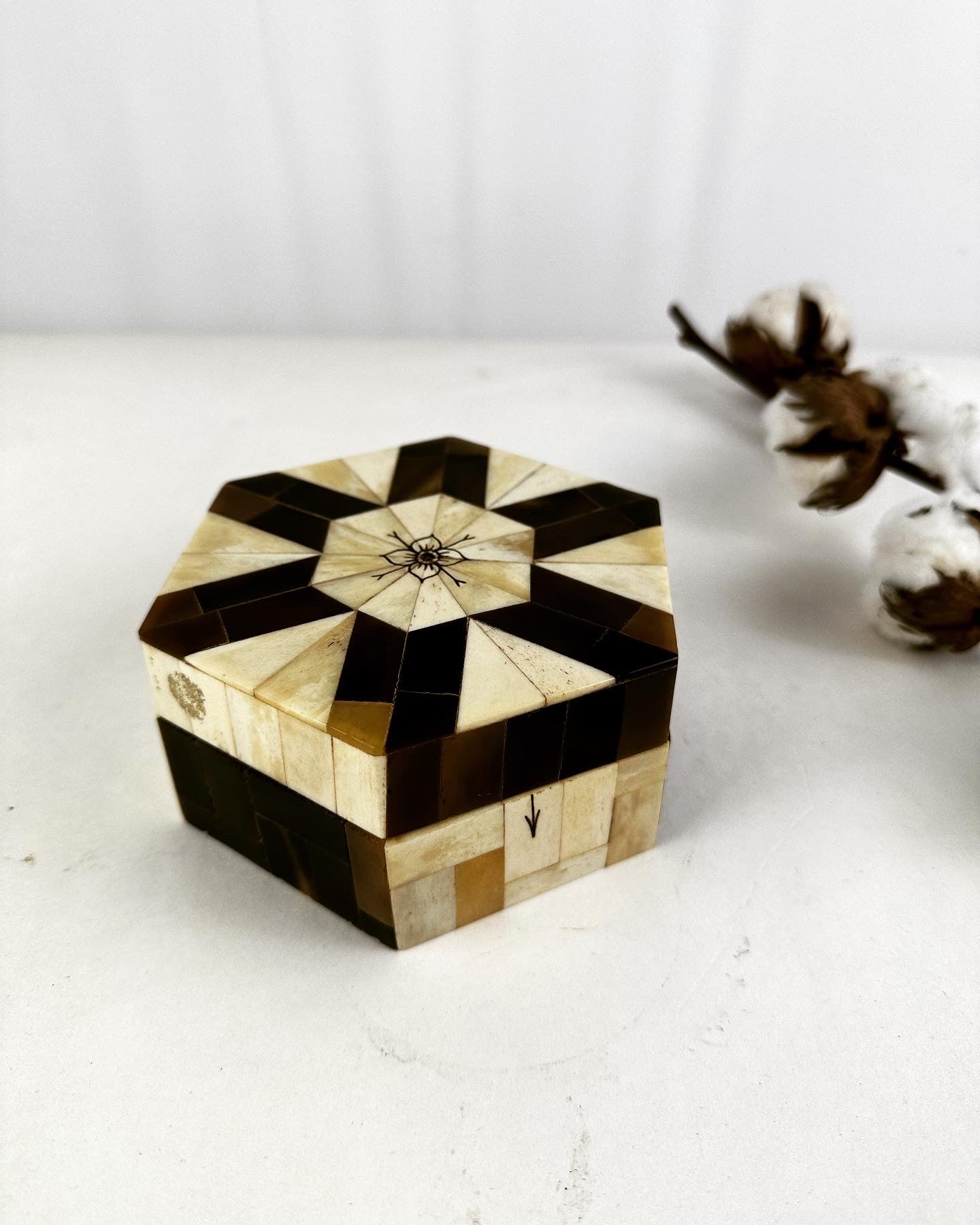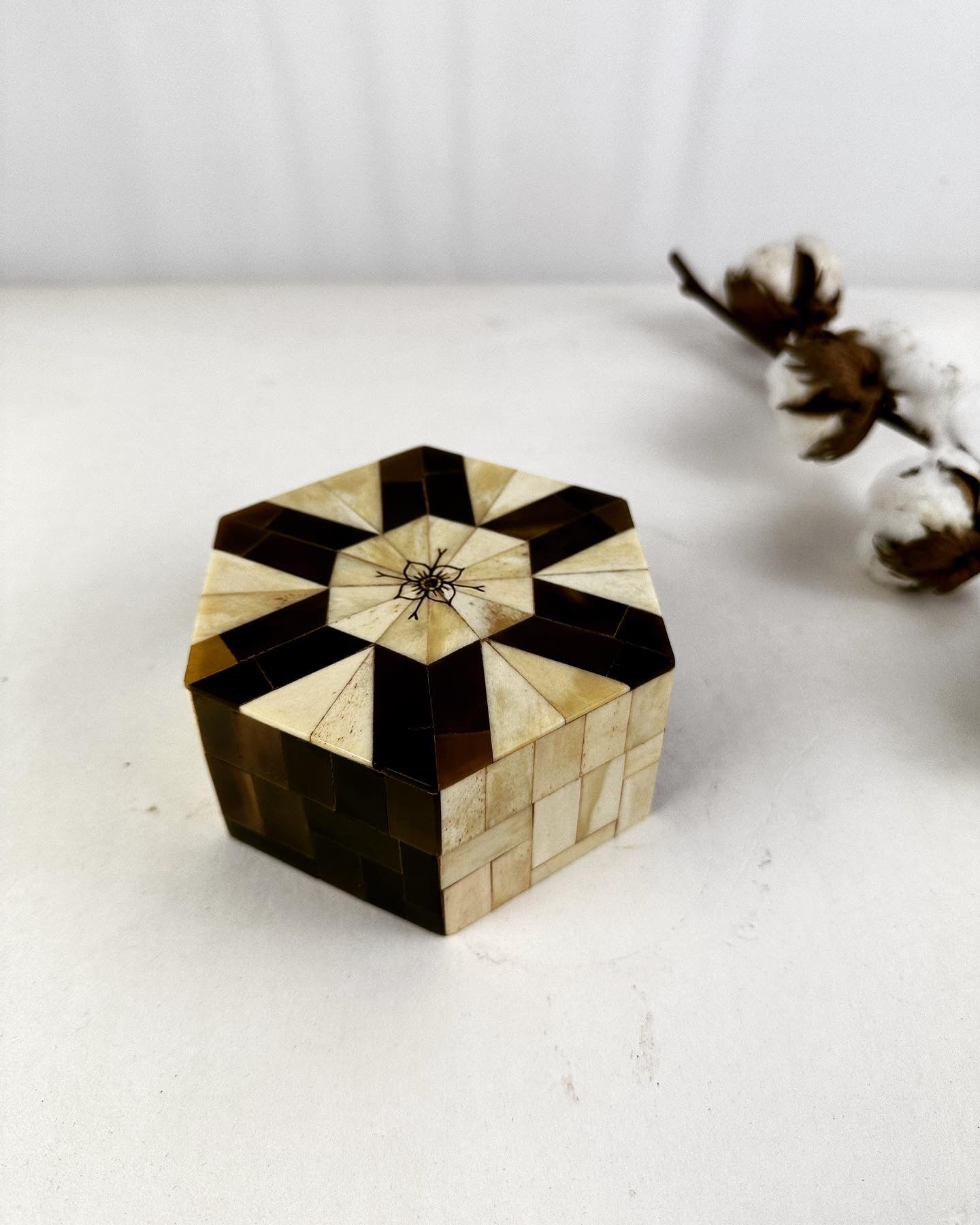 Super mooi doos met een soort parelmoer/ivoor-achtige steentjes ingeleverd. In een geweldige vintage staat. Bruin/crème gekleurd. Zeskantige doosje wat voor van alles gebruikt kan worden.