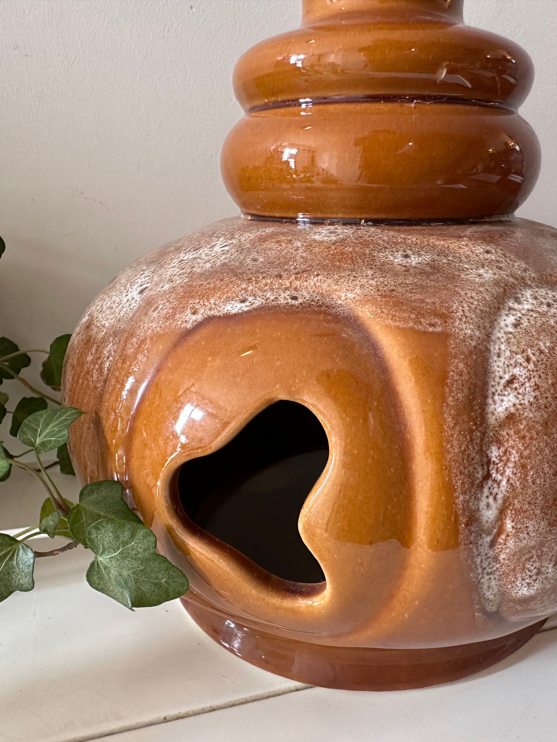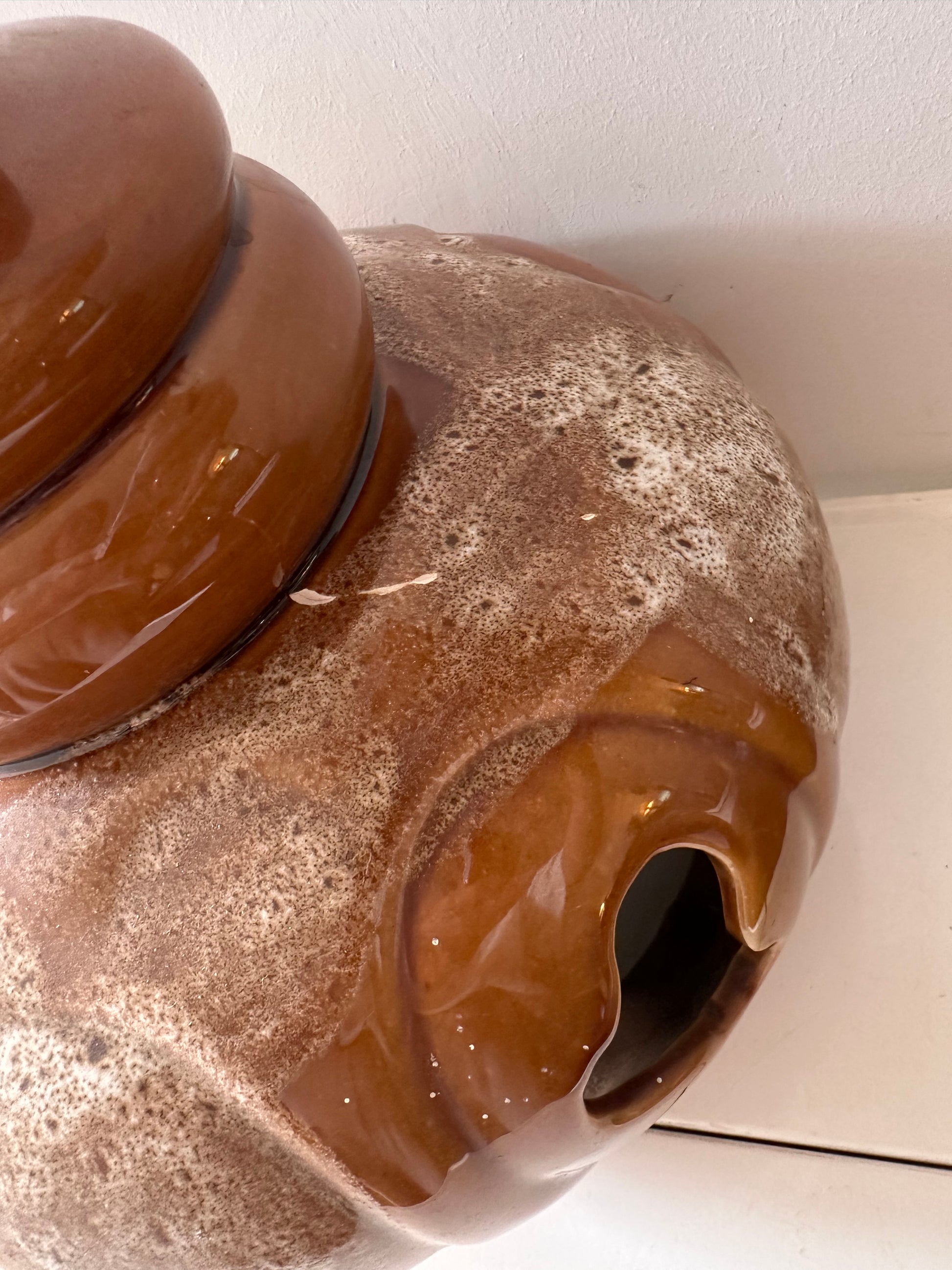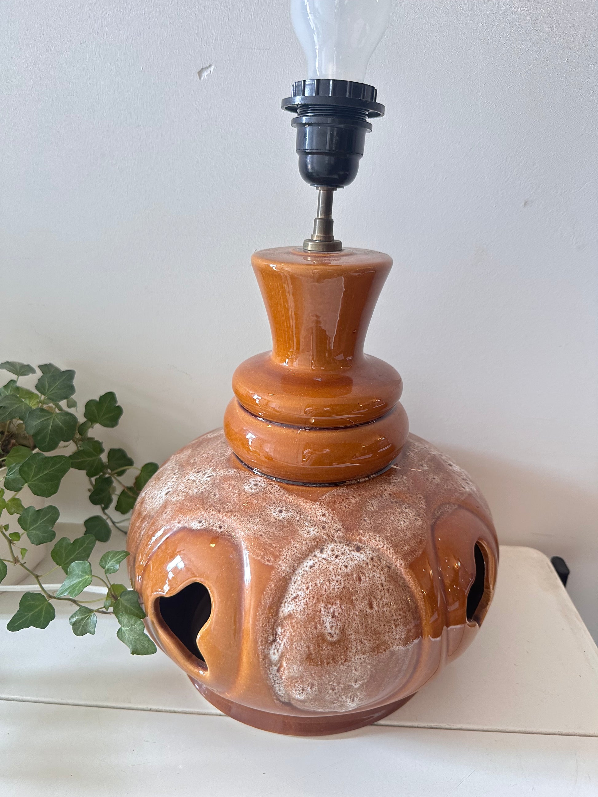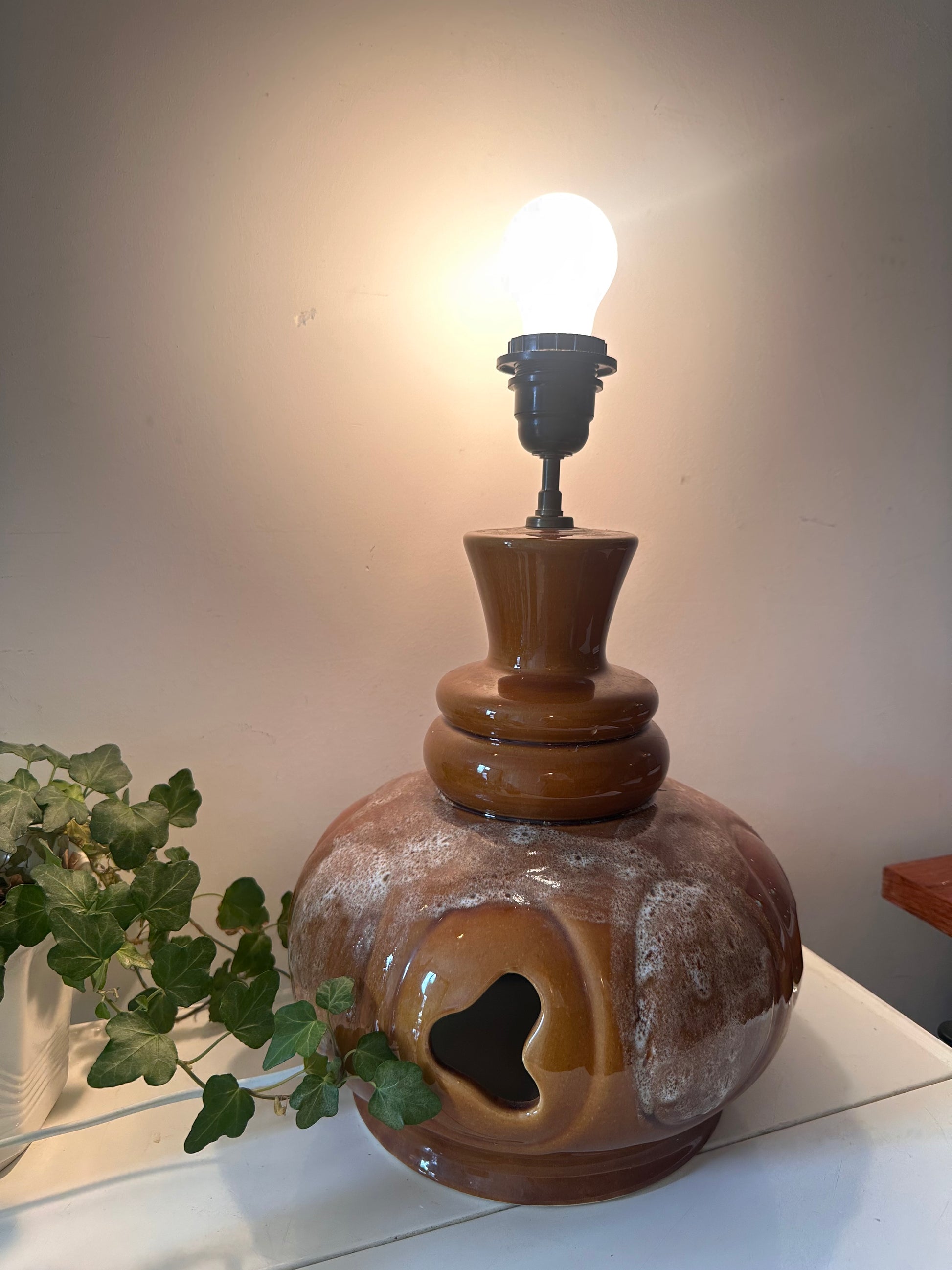Statement alert! Deze dikke keramieken jaren 70 lamp heeft een bolle buik, leuke openingen en een glazuur in warme bruin- en crème-tinten met een vettig fat lava effect. De bovenkant is afgewerkt met een retro hals en fitting. Werkt prima (zie foto). De lamp heeft wel wat gebruikssporen passend bij z’n leeftijd maar die zijn absoluut niet storend. Q215