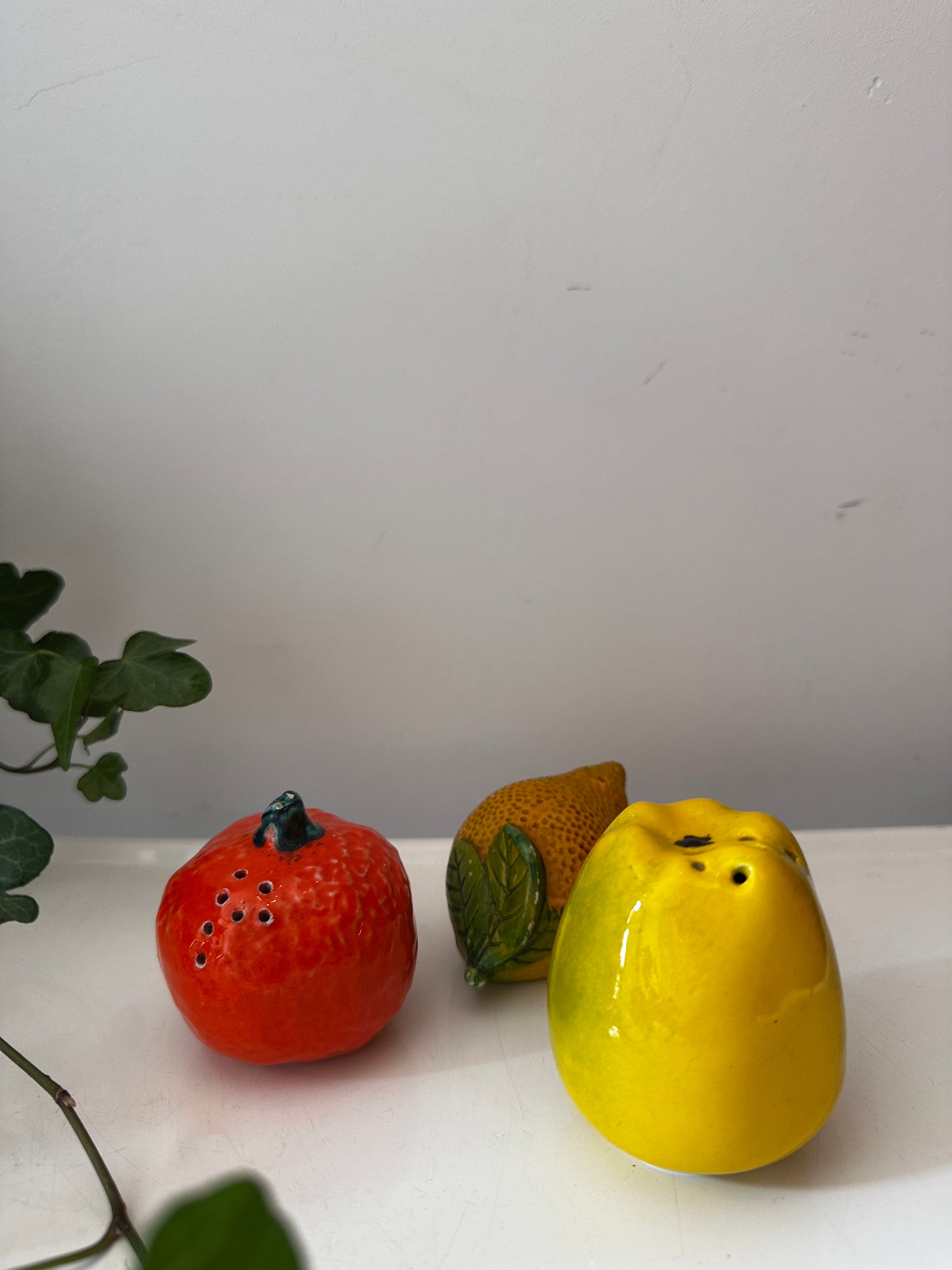 Hoe leuk zijn deze keramieken kruidenvaatjes in de vorm van een citroen, peer en sinaasappel? Handbeschilderd en lekker retro. Ze zijn niet alleen handig aan tafel, maar ook een vrolijke eyecatcher in je keuken. Q3