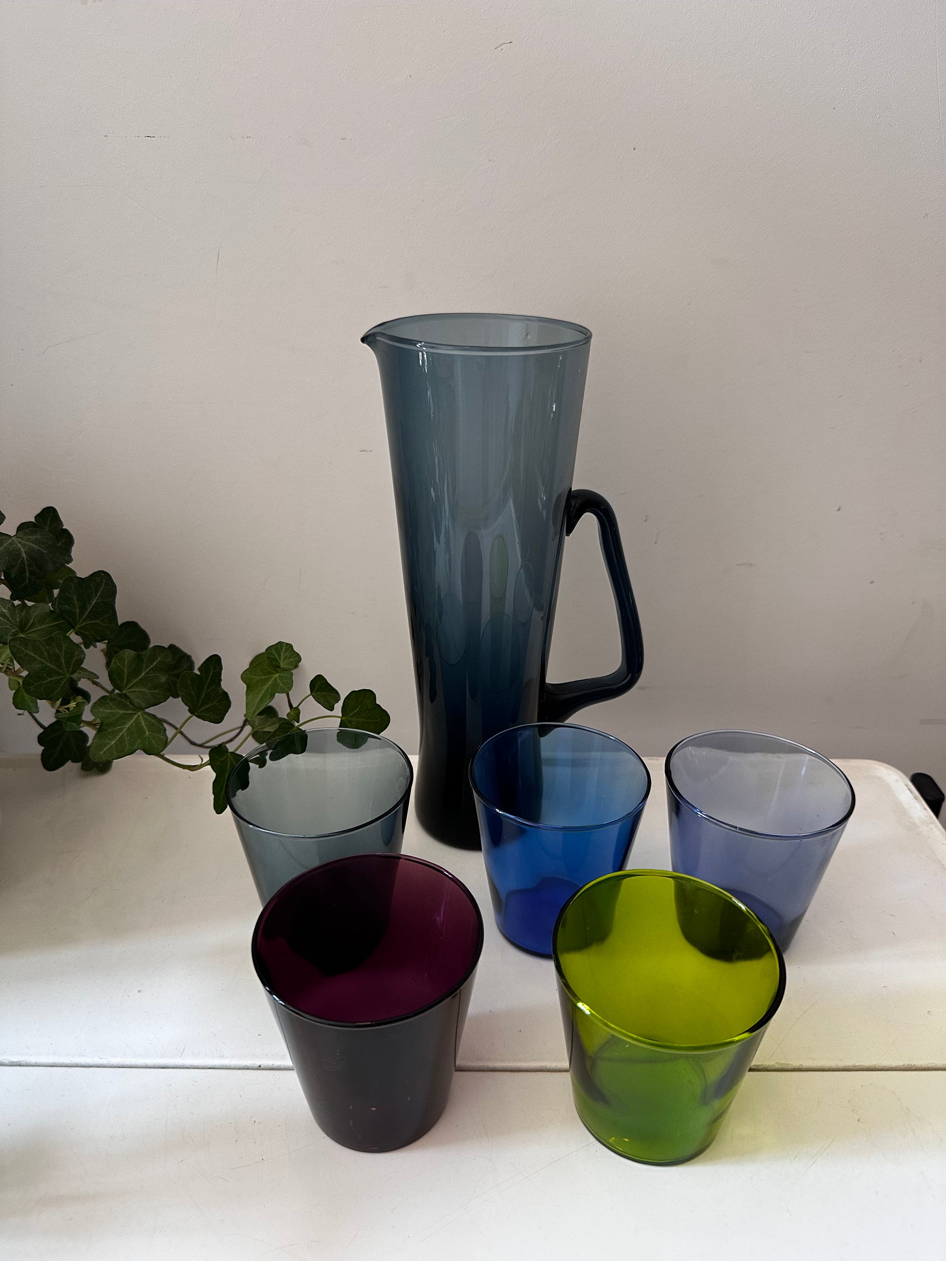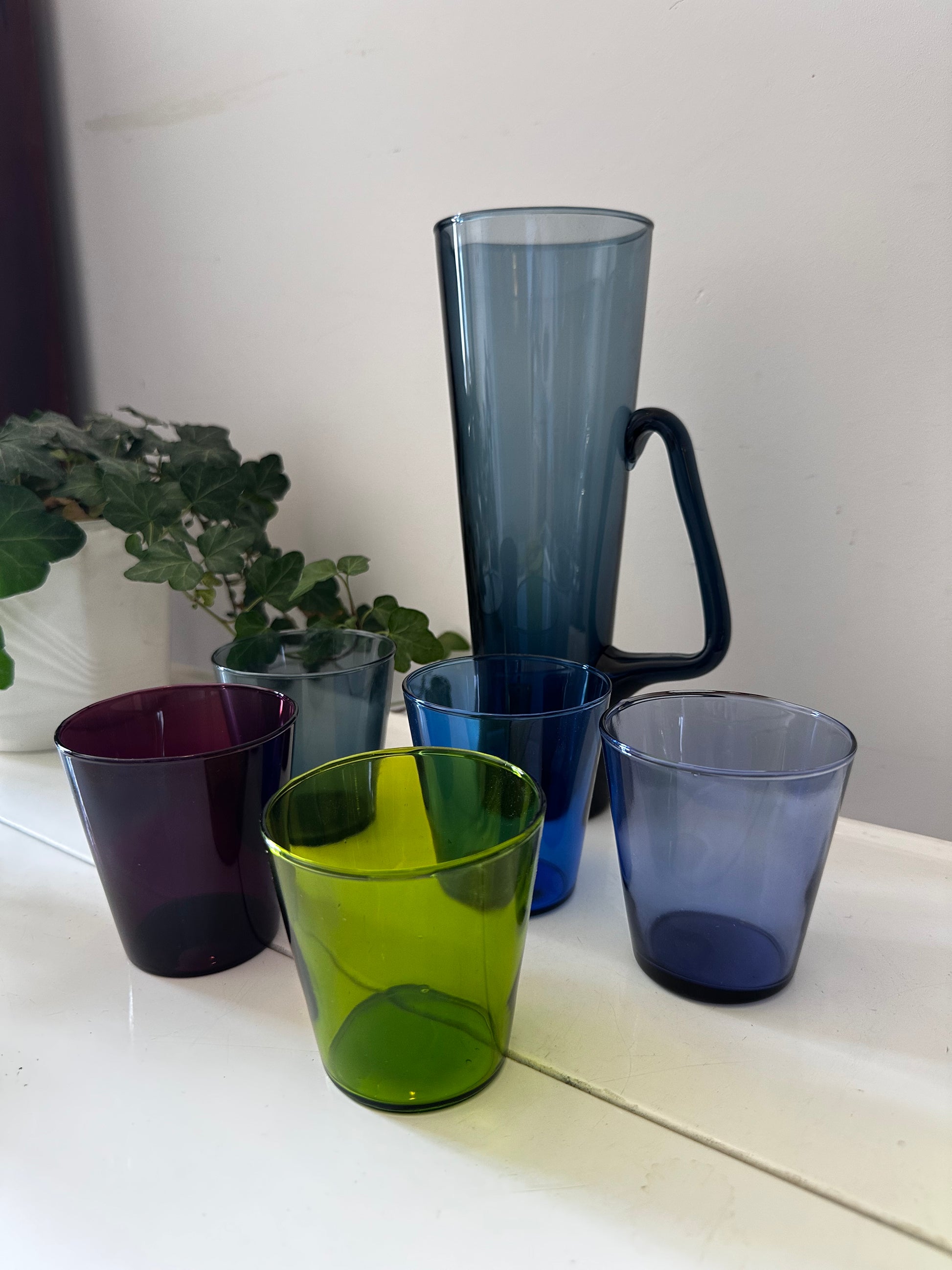 Supertoffe set van vijf kleurrijke glazen en een hoge karaf in blauw glas. De glazen zijn elk in een andere tint (o.a. blauw, paars,groen en rookglas) en geven een vrolijke, moderne twist aan je tafel. De karaf heeft een elegant slank model met oor en schenktuit. Alles in mooie vintage staat zonder chips. De glazen kleuren in licht mooi op.