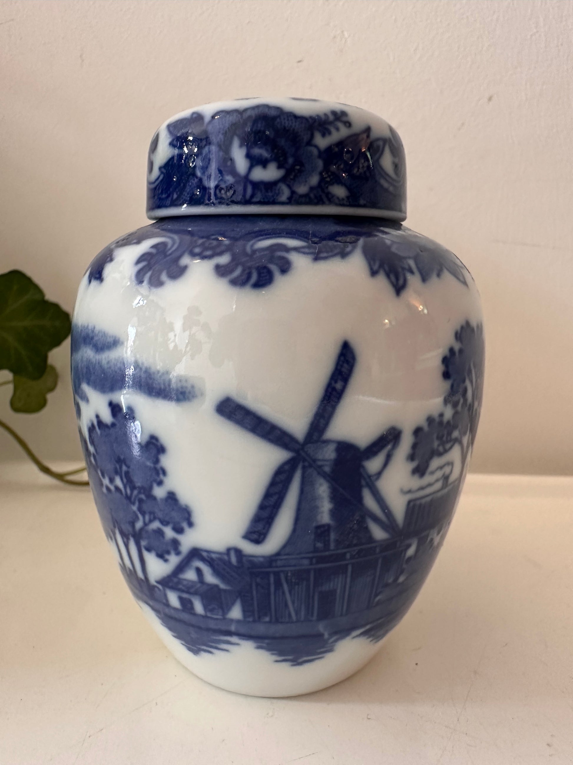 Hoe leuk is dit kleine porseleinen gemberpotje? Heeft dat klassieke blauw-witte bloemen- en landschapsdecor. Gemerkt aan de onderkant met Japanse tekens. Heeft nog een kunststof afdekdopje. Q211.