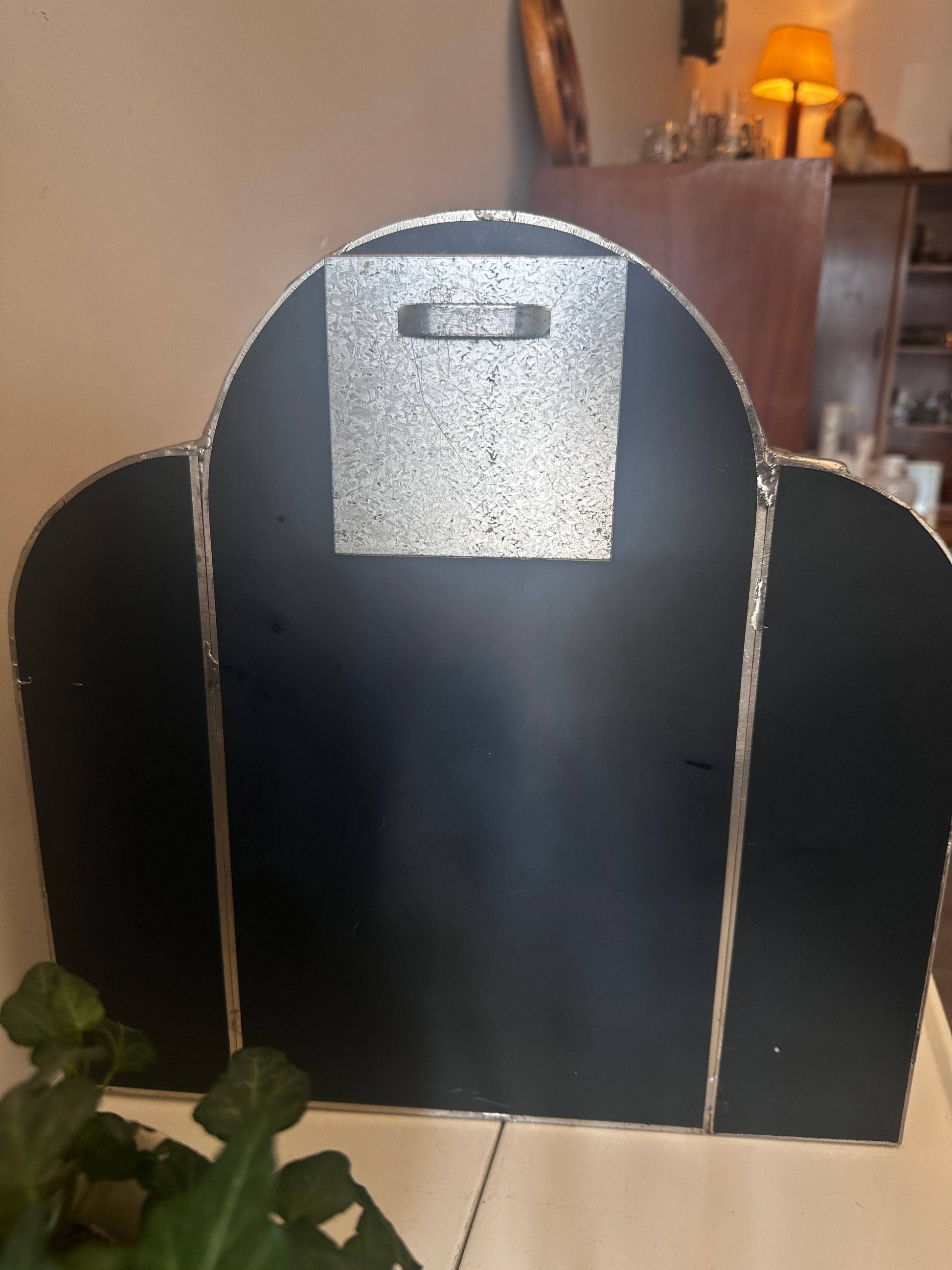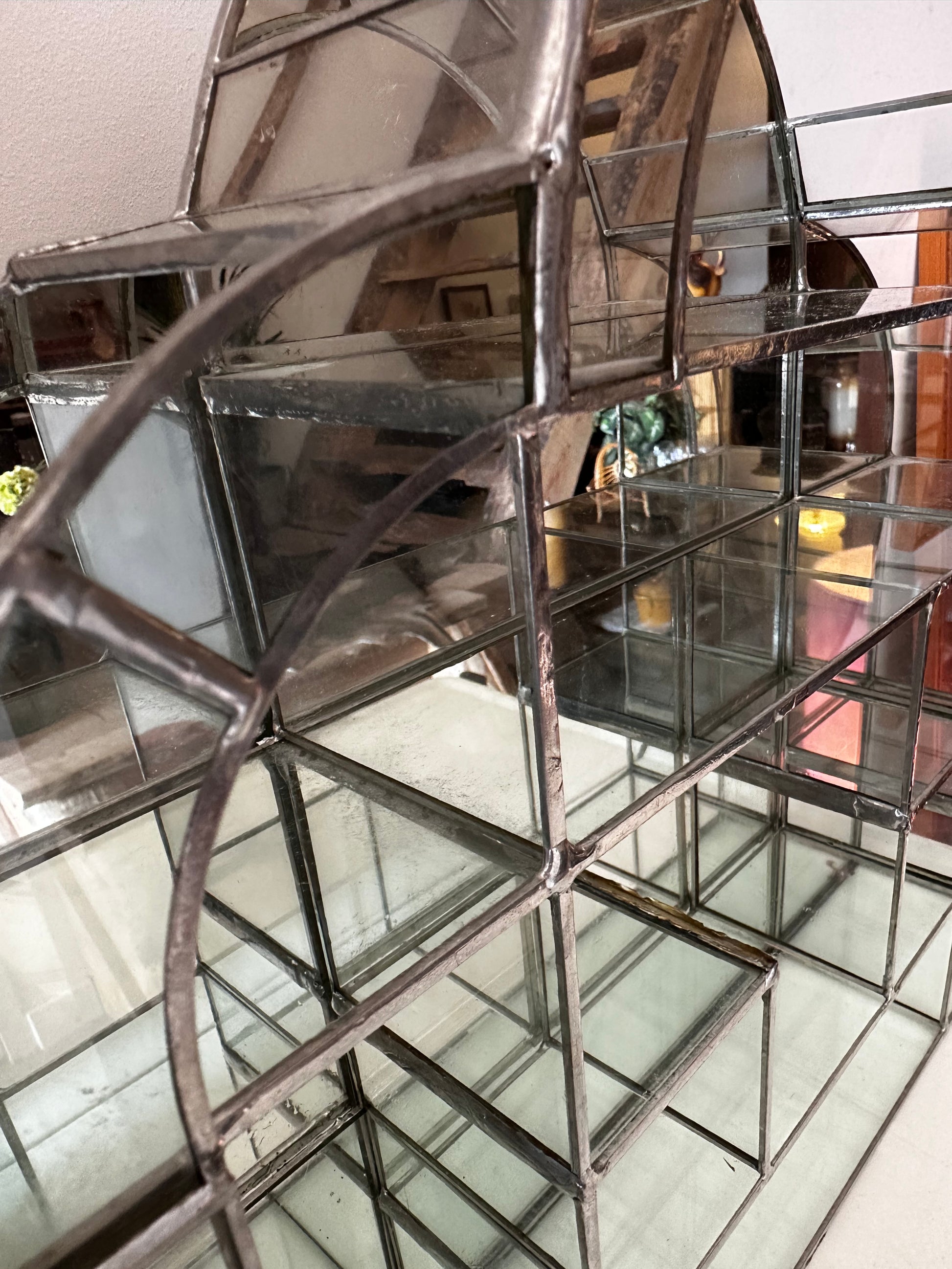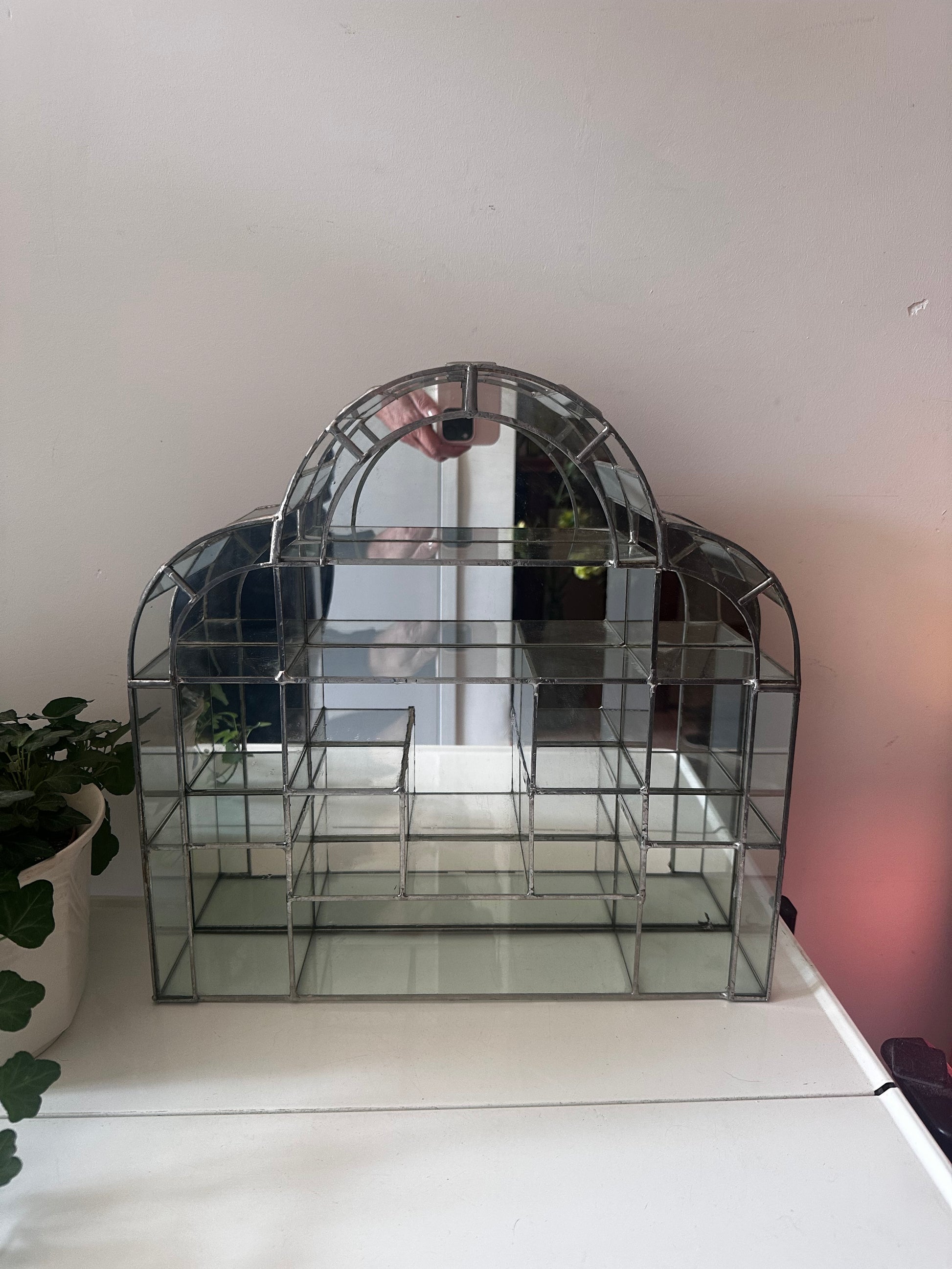 Stijlvol vitrinekastje met een bijzondere vorm: rechthoekige basis met ronde, gebogen lijnen aan de bovenkant. Gemaakt van helder glas met metalen randen en een spiegel achterkant. Kastje is in een top vintage staat en heeft een art deco uitstraling.