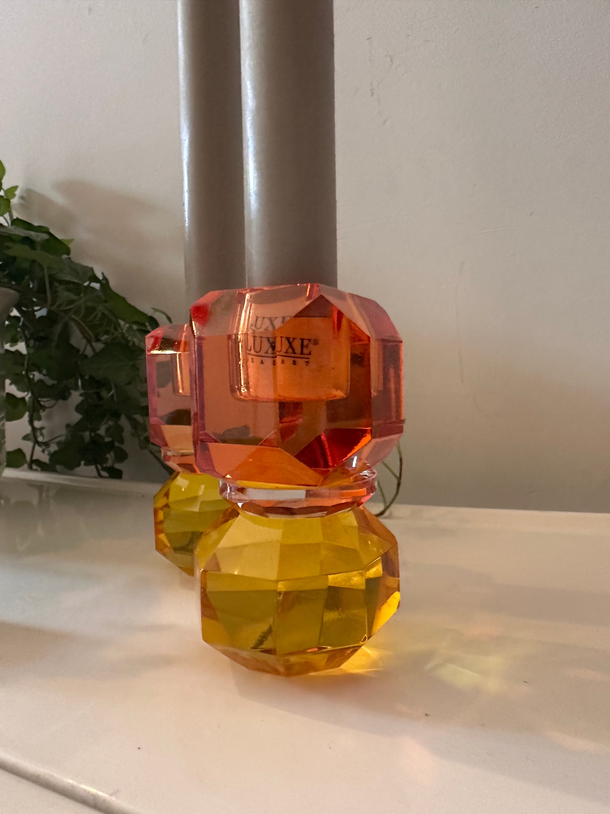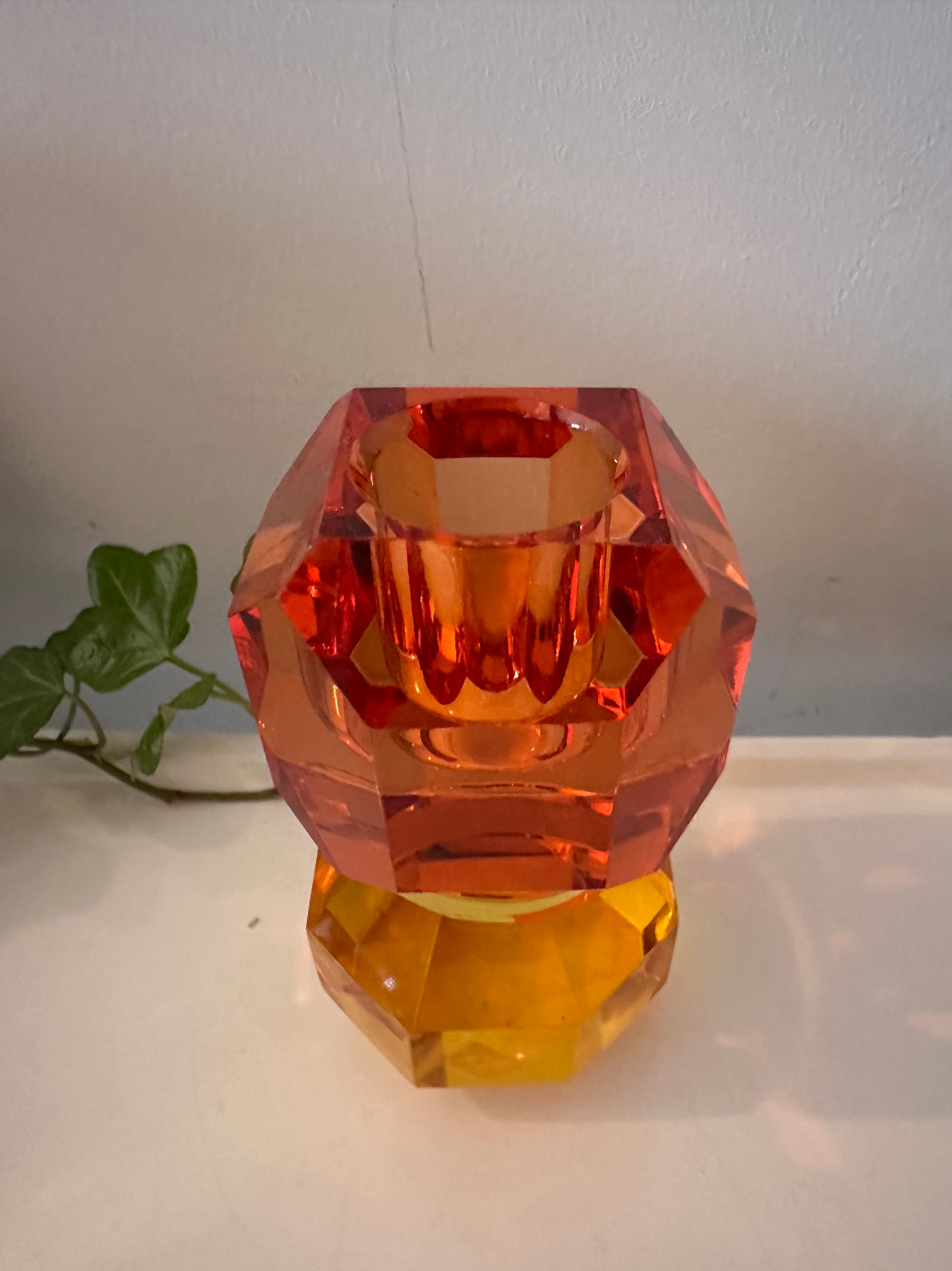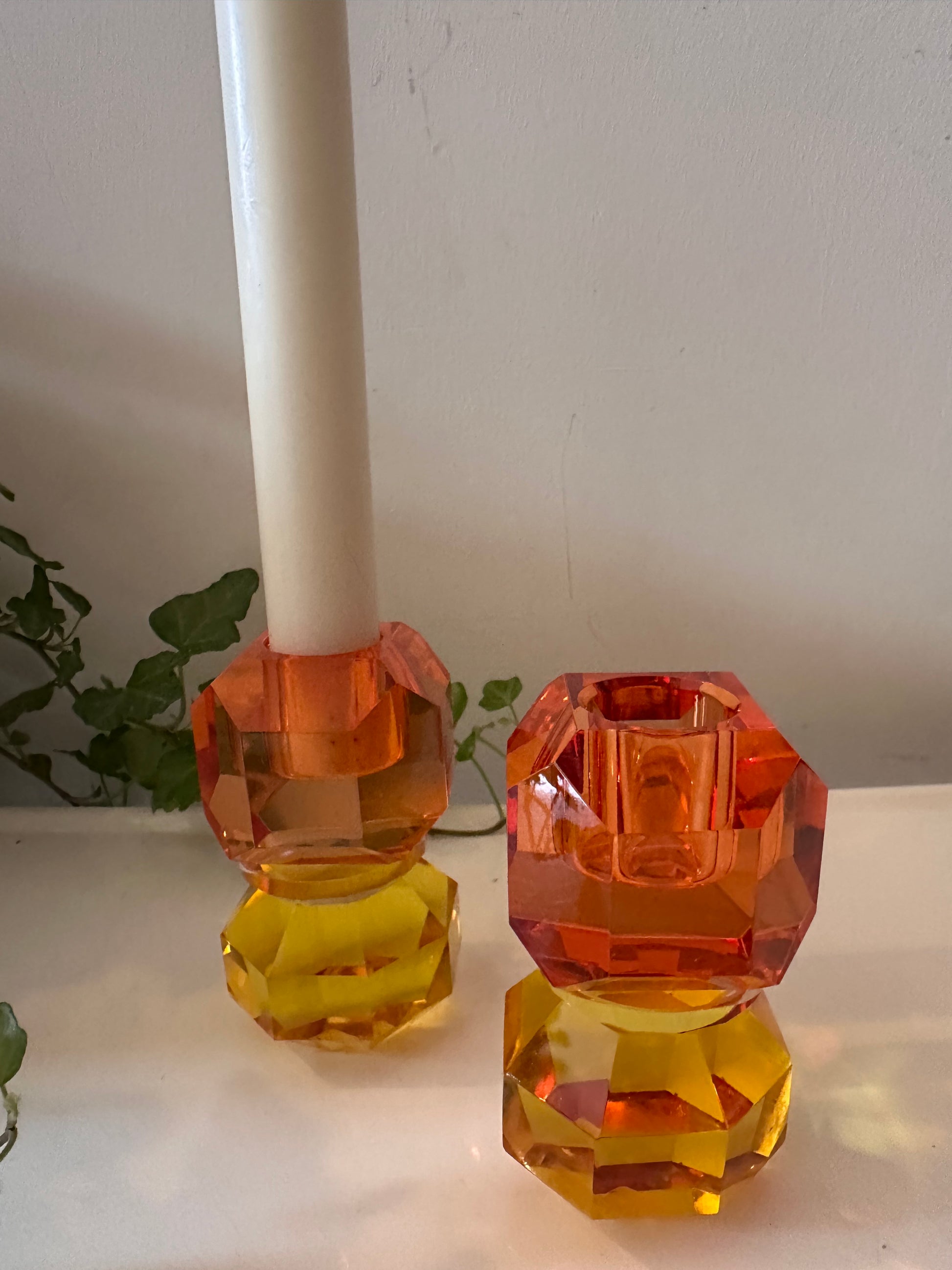 Superleuke deze glazen kandelaar in oranje en geel hebben die echte eighties-vibe — kleurrijk, grafisch en lekker opvallend door de facetgeslepen vormen. Gemaakt van dik, helder glas en geven prachtig licht als de zon erop valt. Perfect te mixen met andere kleuren kaarsen voor een speels effect. Q518/519