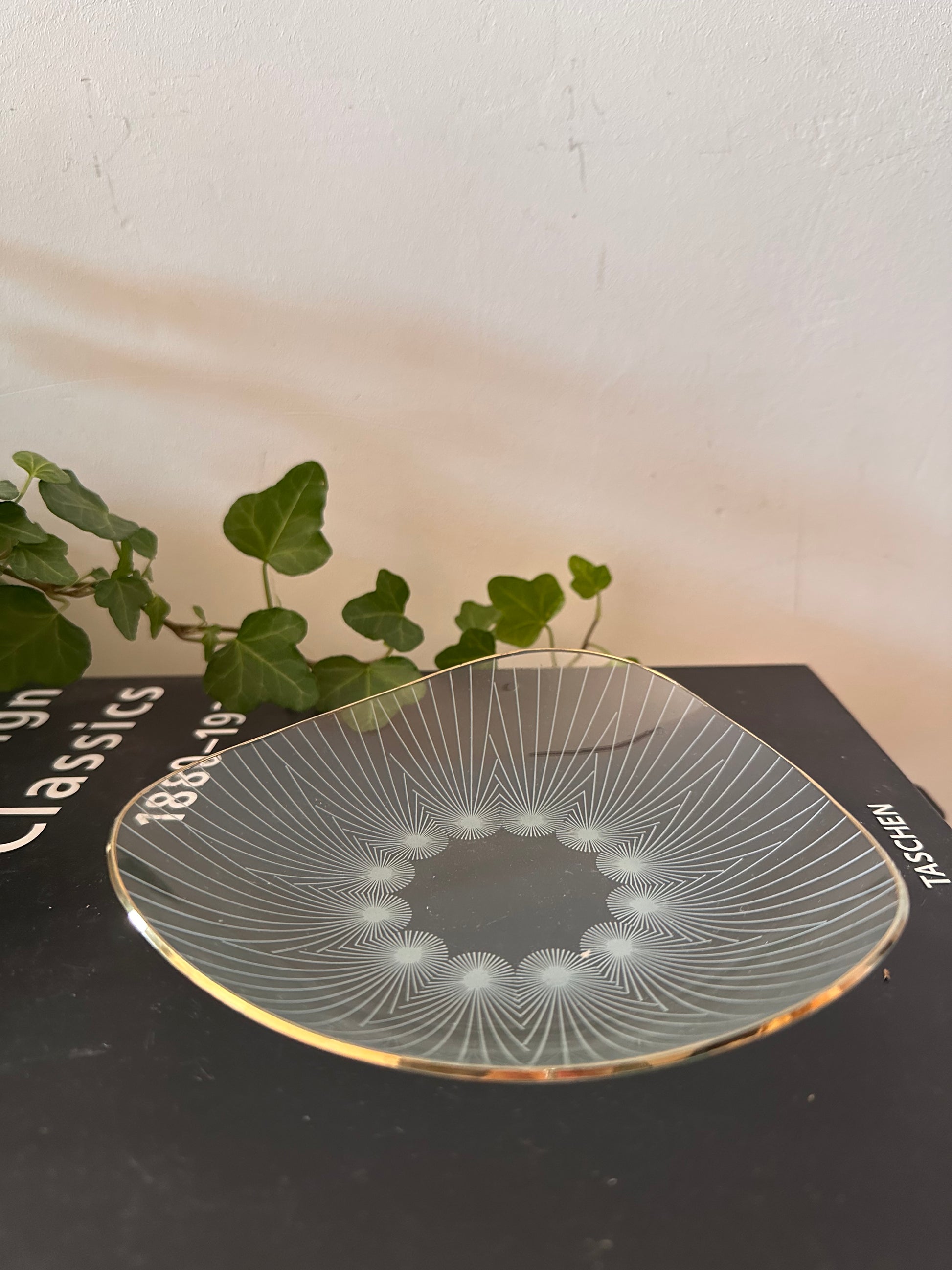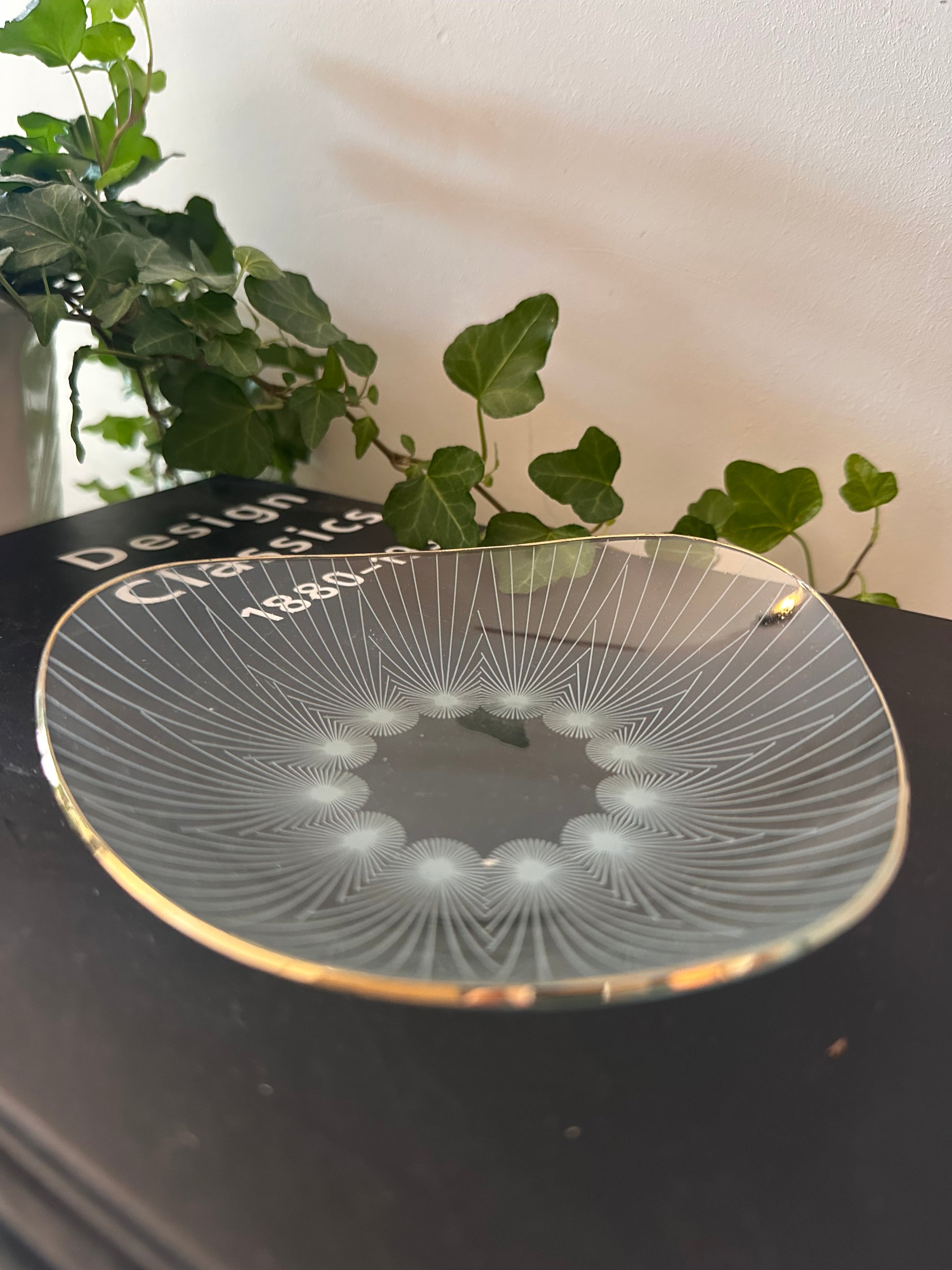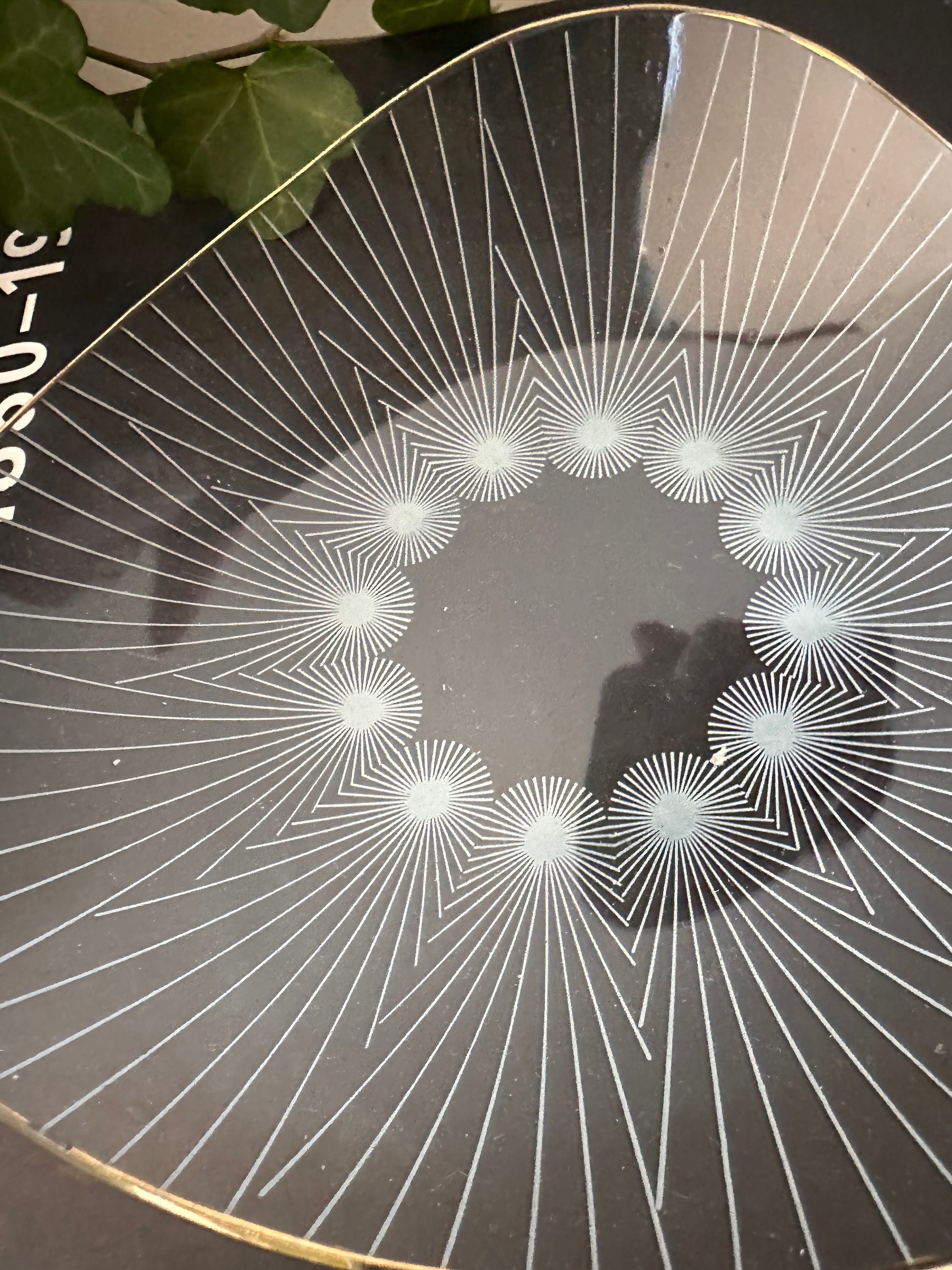 Mooi transparant glazen schaaltje met een fijn grafisch sterpatroon in wit en een gouden rand. Typisch ontwerp uit de jaren 60/70. Leuk om te gebruiken voor kleine hapjes, sieraden of gewoon als decoratief stukje glasdesign. Q503