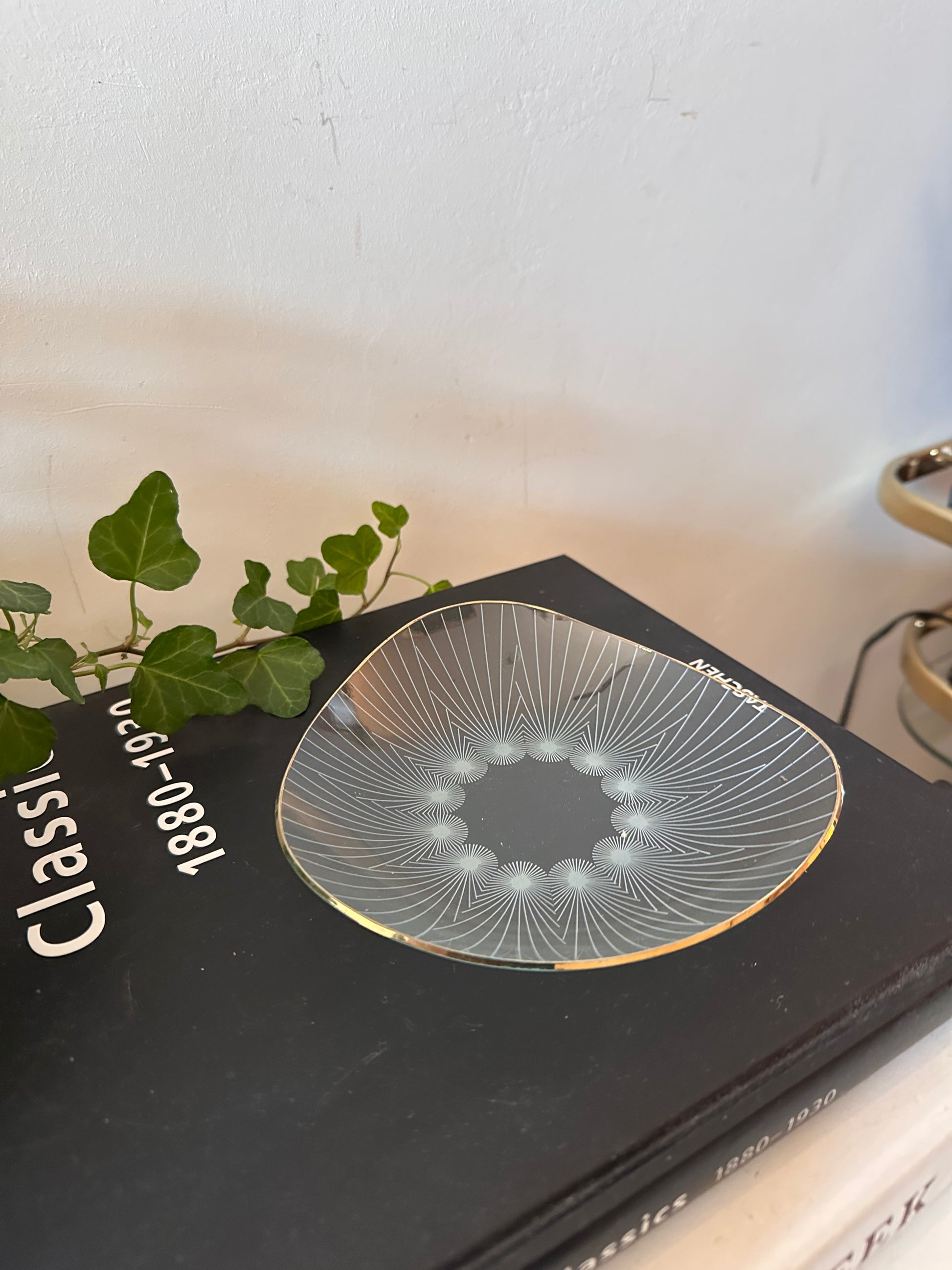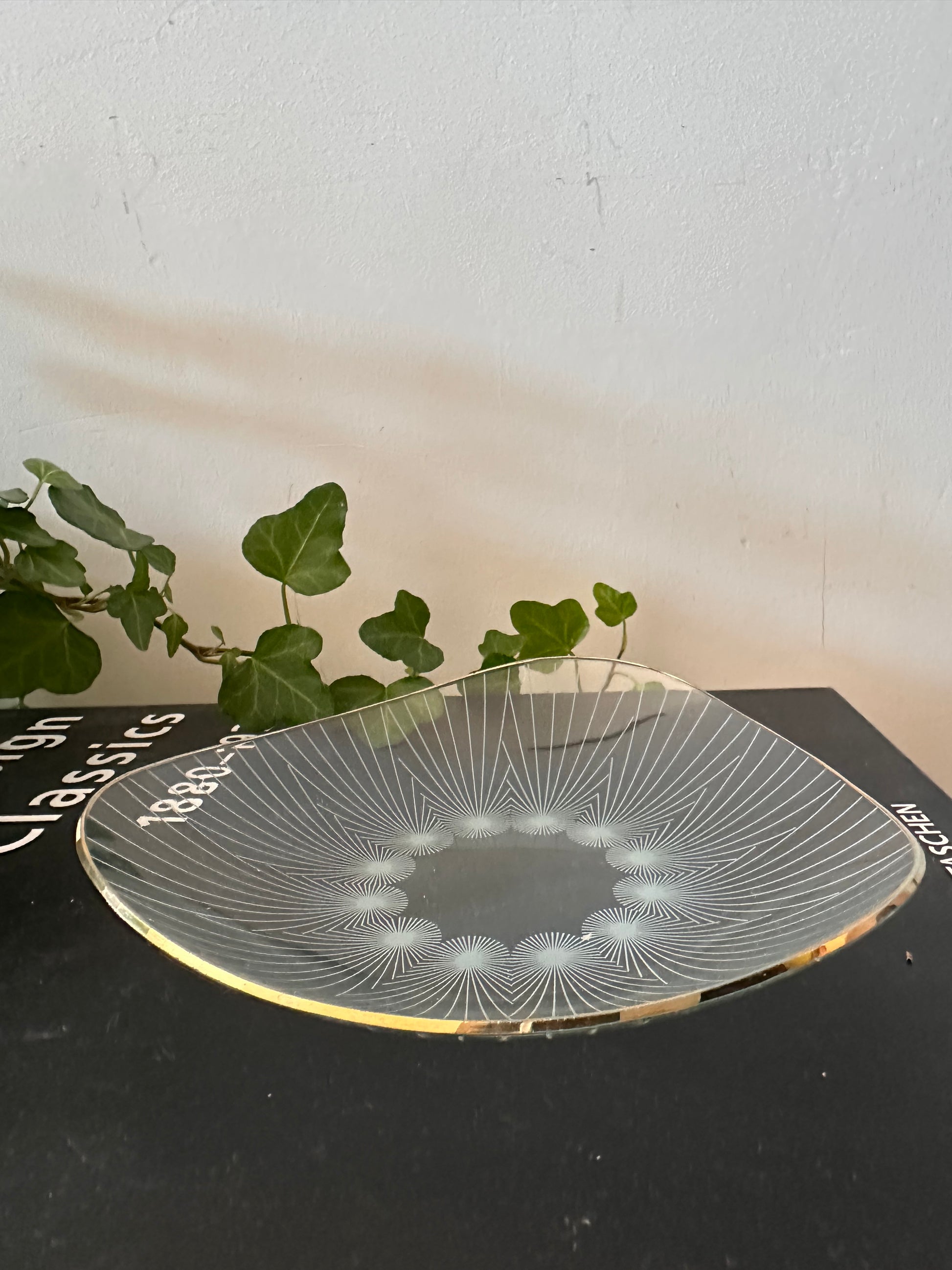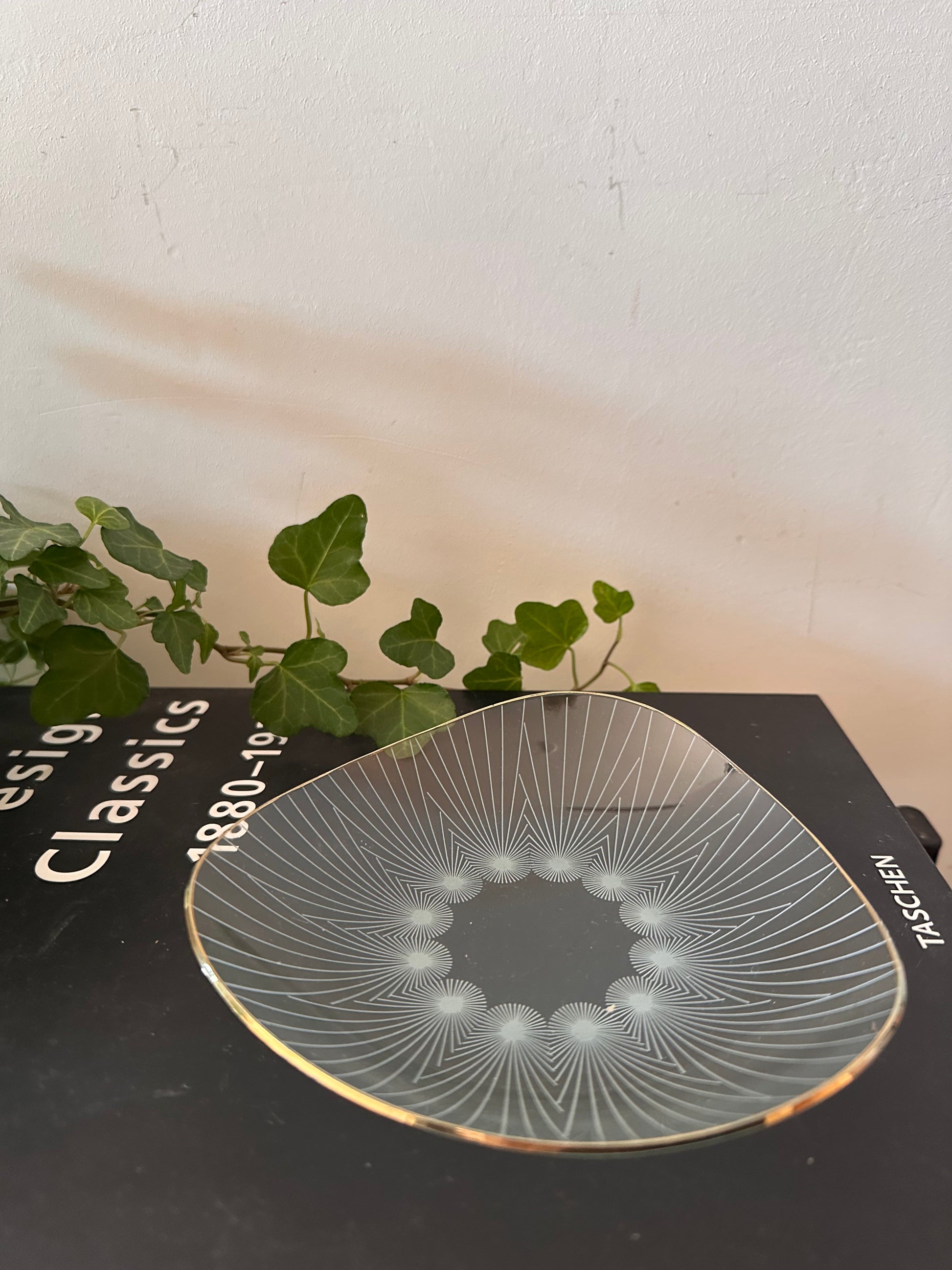 Mooi transparant glazen schaaltje met een fijn grafisch sterpatroon in wit en een gouden rand. Typisch ontwerp uit de jaren 60/70. Leuk om te gebruiken voor kleine hapjes, sieraden of gewoon als decoratief stukje glasdesign. Q503