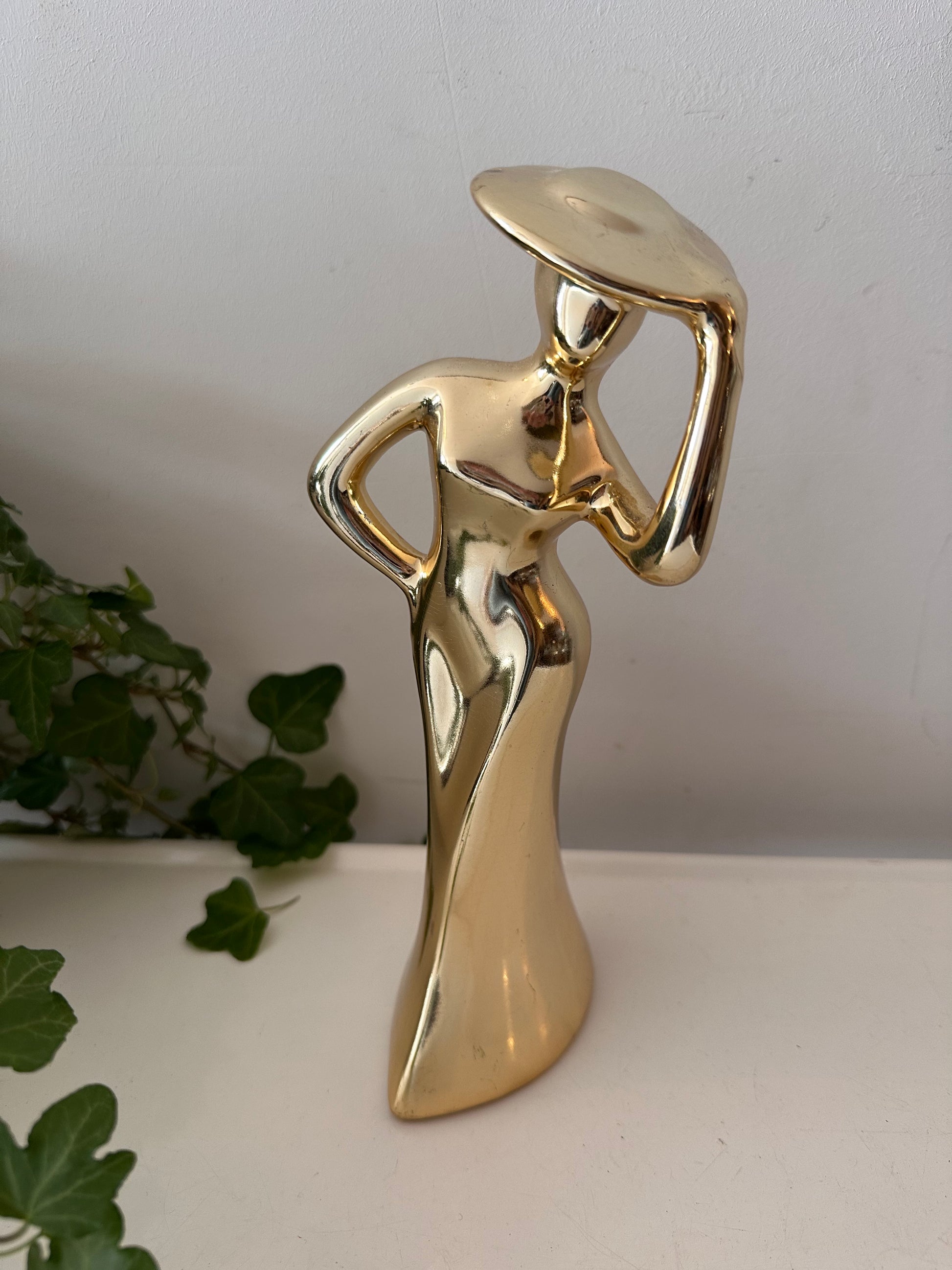 Mooi retro beeldje van een dame met brede hoed. Het glanzende goudkleurige glazuur geeft ‘m een chique look – een echte eyecatcher voor in je interieur. Afkomstig Frankrijk jaren ’80. Q428