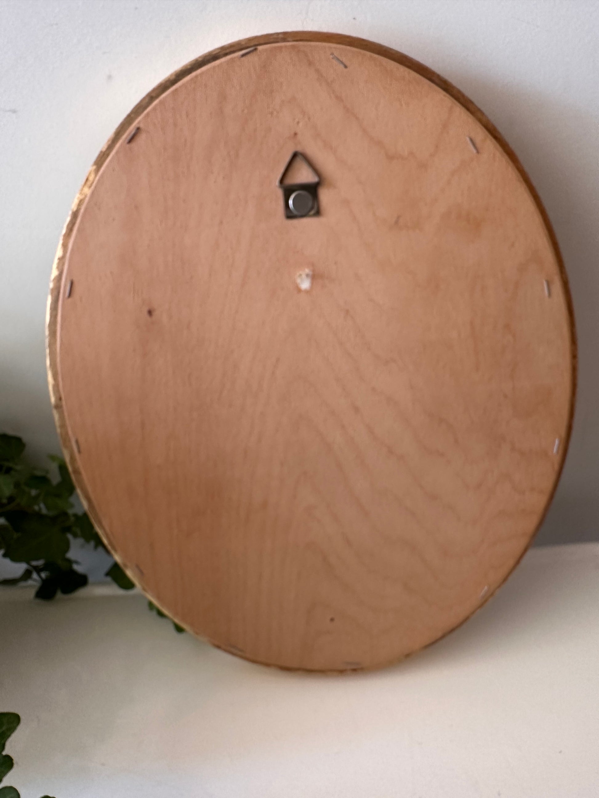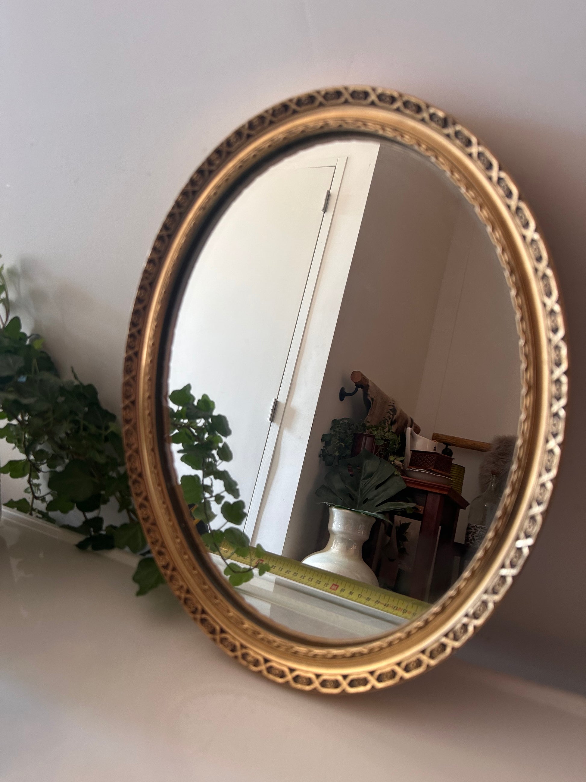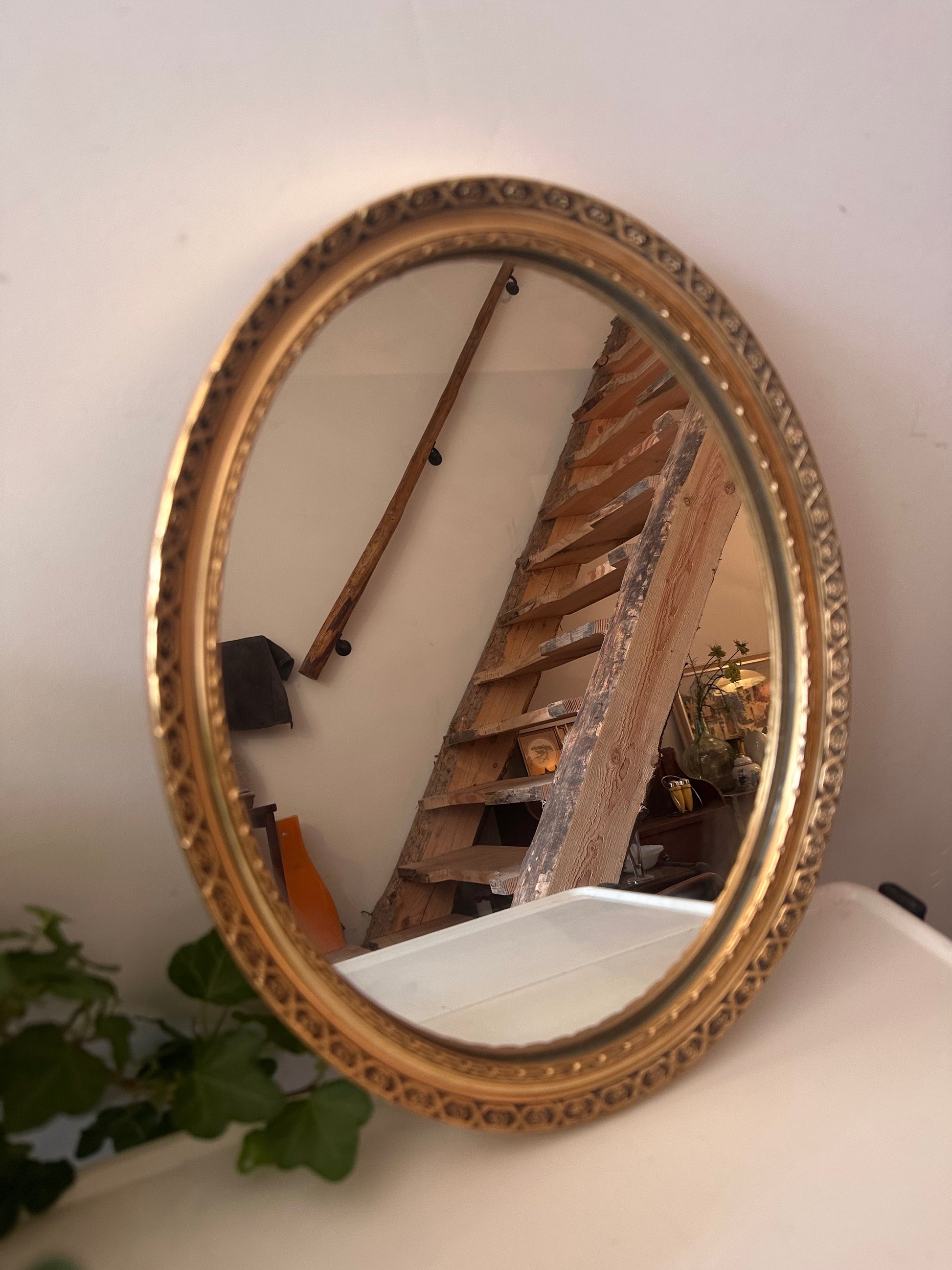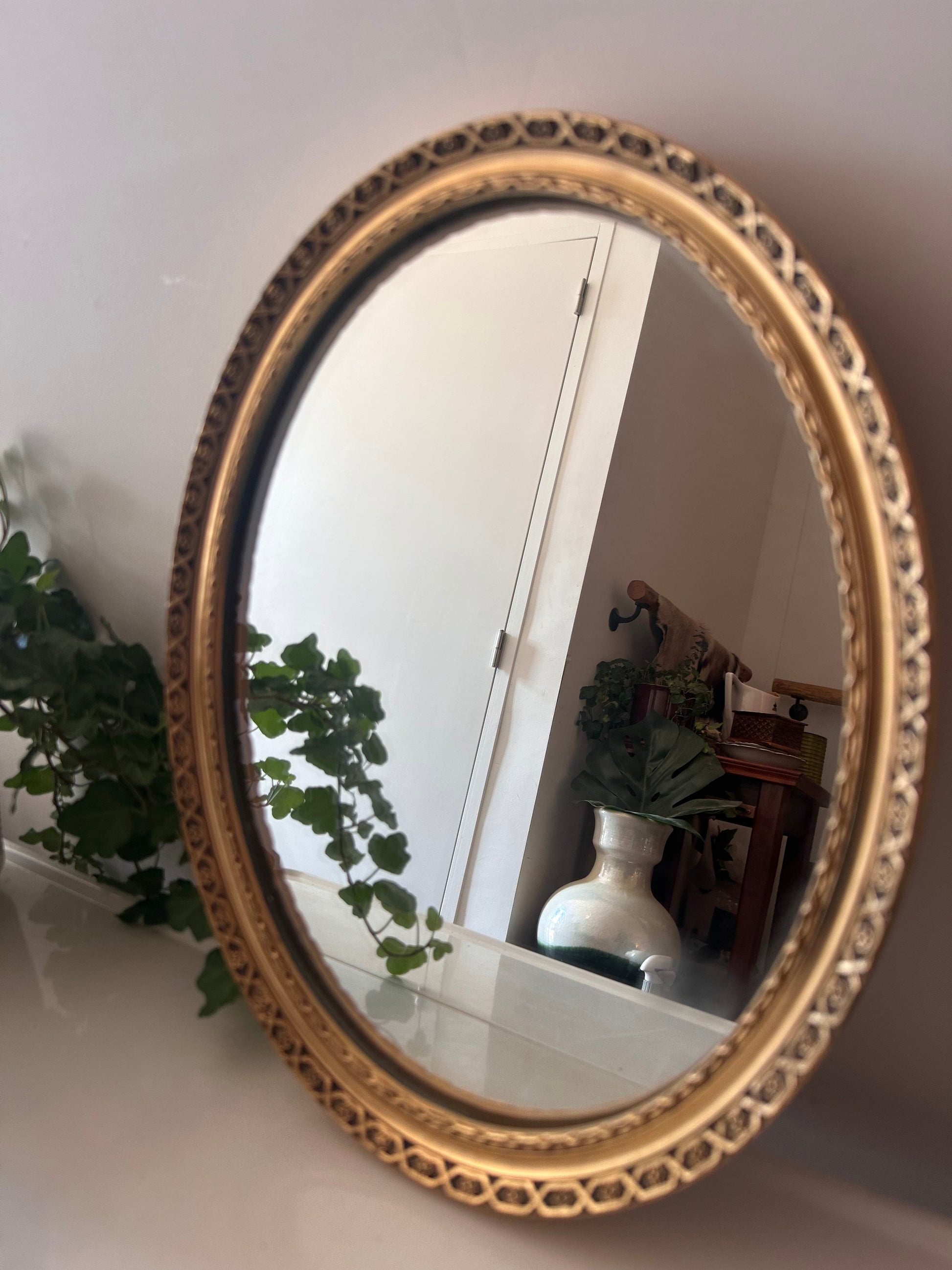 Ovalen spiegel met een chunky goudkleurige lijst en speels reliëf. Zo’n item dat meteen een statement maakt aan je muur – ideaal om te mixen in een gallery wall of gewoon los te shinen. Q508
