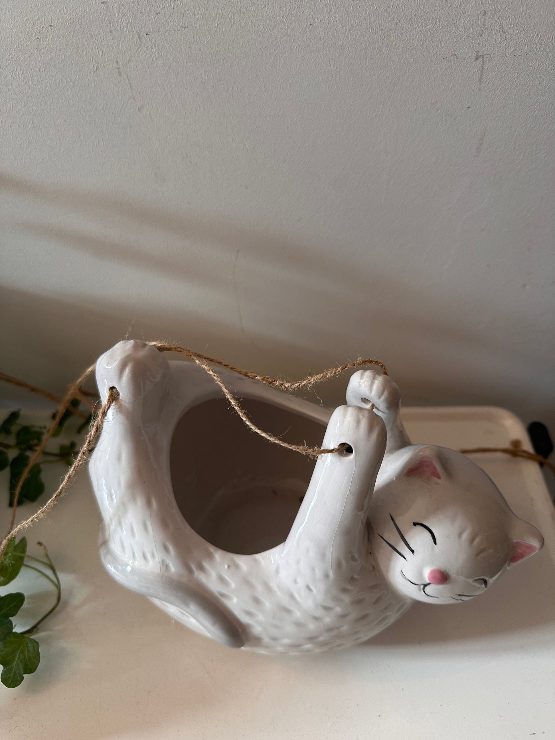 Hele leuke hangbloempot in de vorm van een katje ๐ฑ Gemaakt van geglazuurd aardewerk in zachtgrijs, met touwtjes om โm op te hangen. Staat superleuk met een klein hangplantje erin of wat droogbloemen.