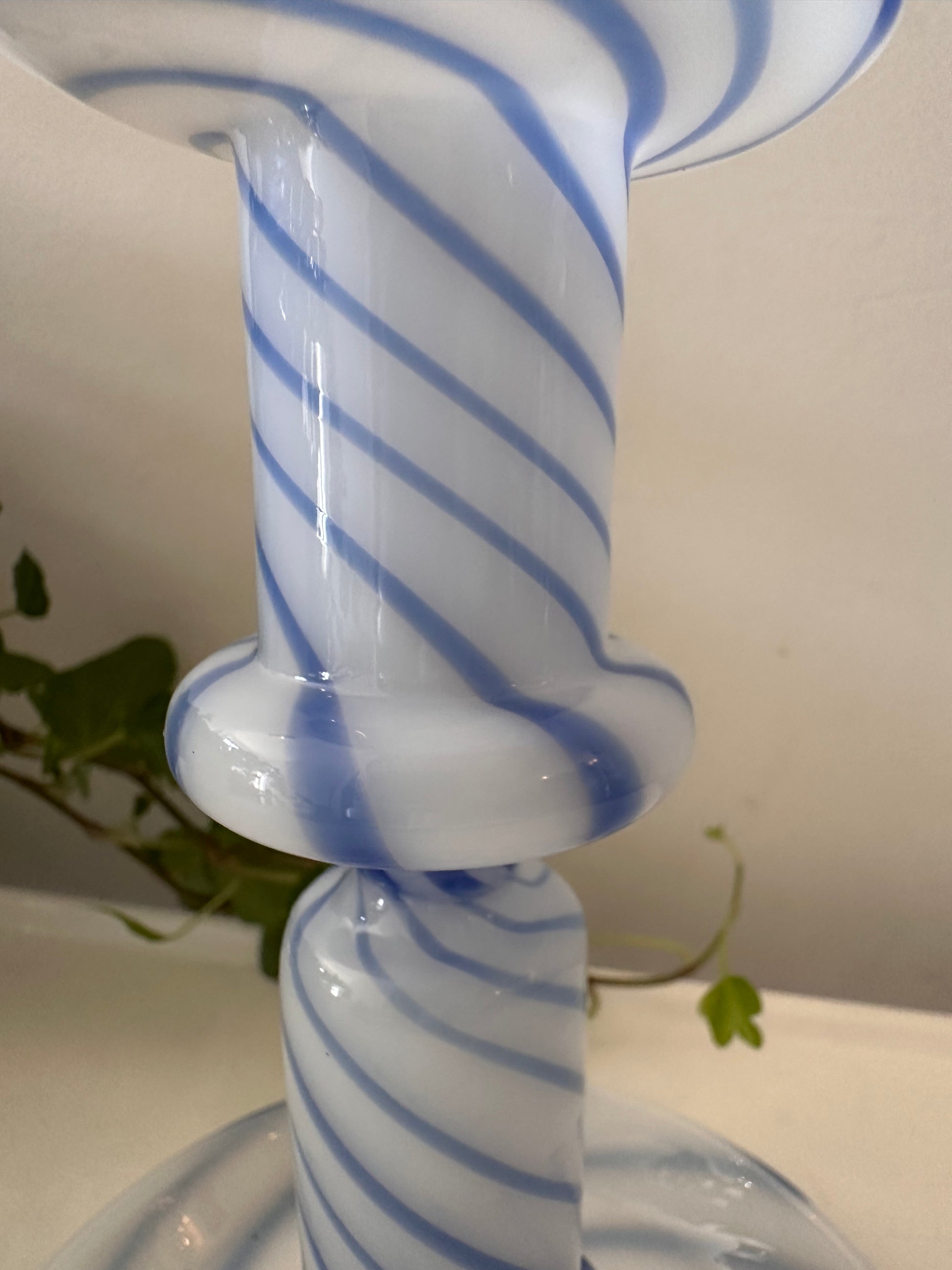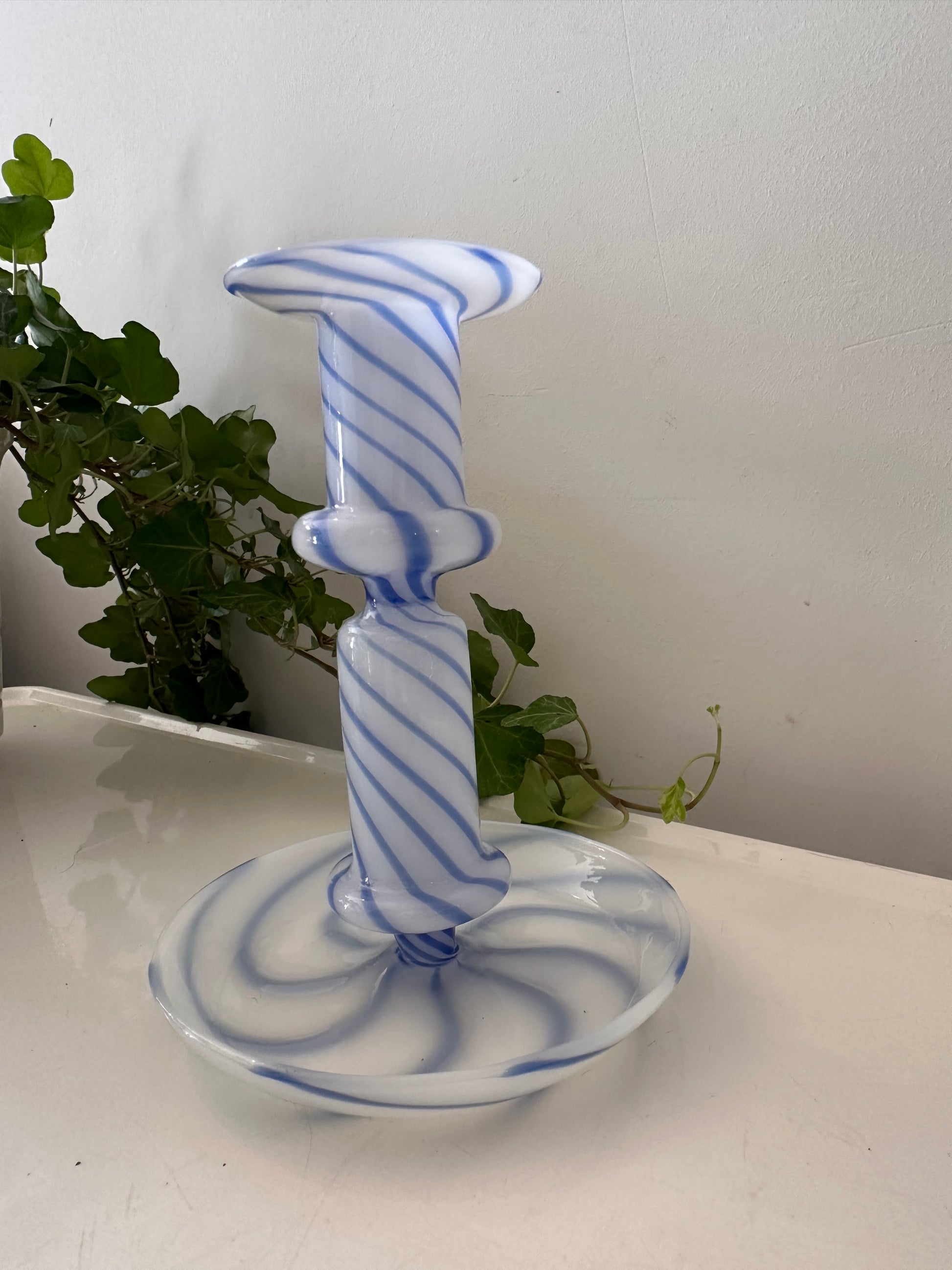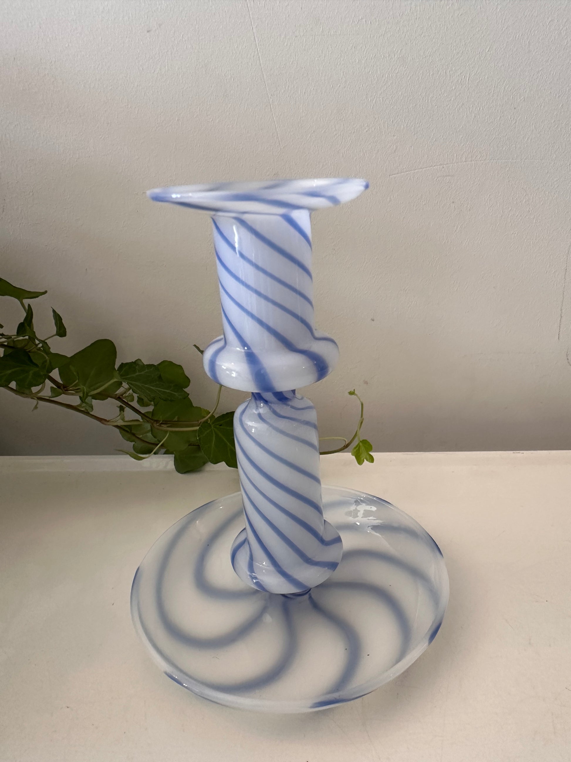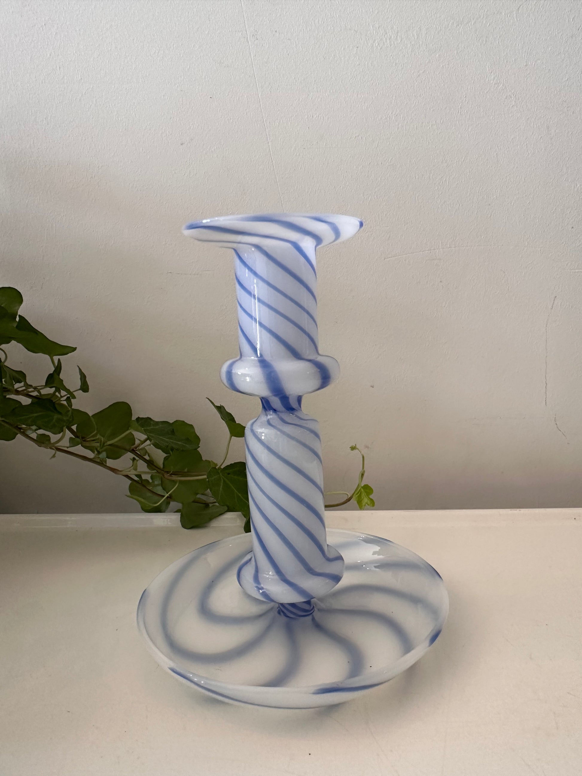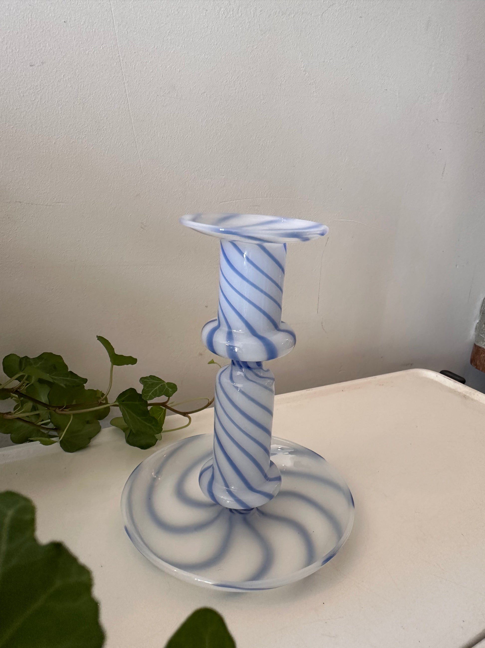 Hoe tof is deze swirl kandelaar! Gemaakt van wit opaalglas met blauwe spiraalstrepen.