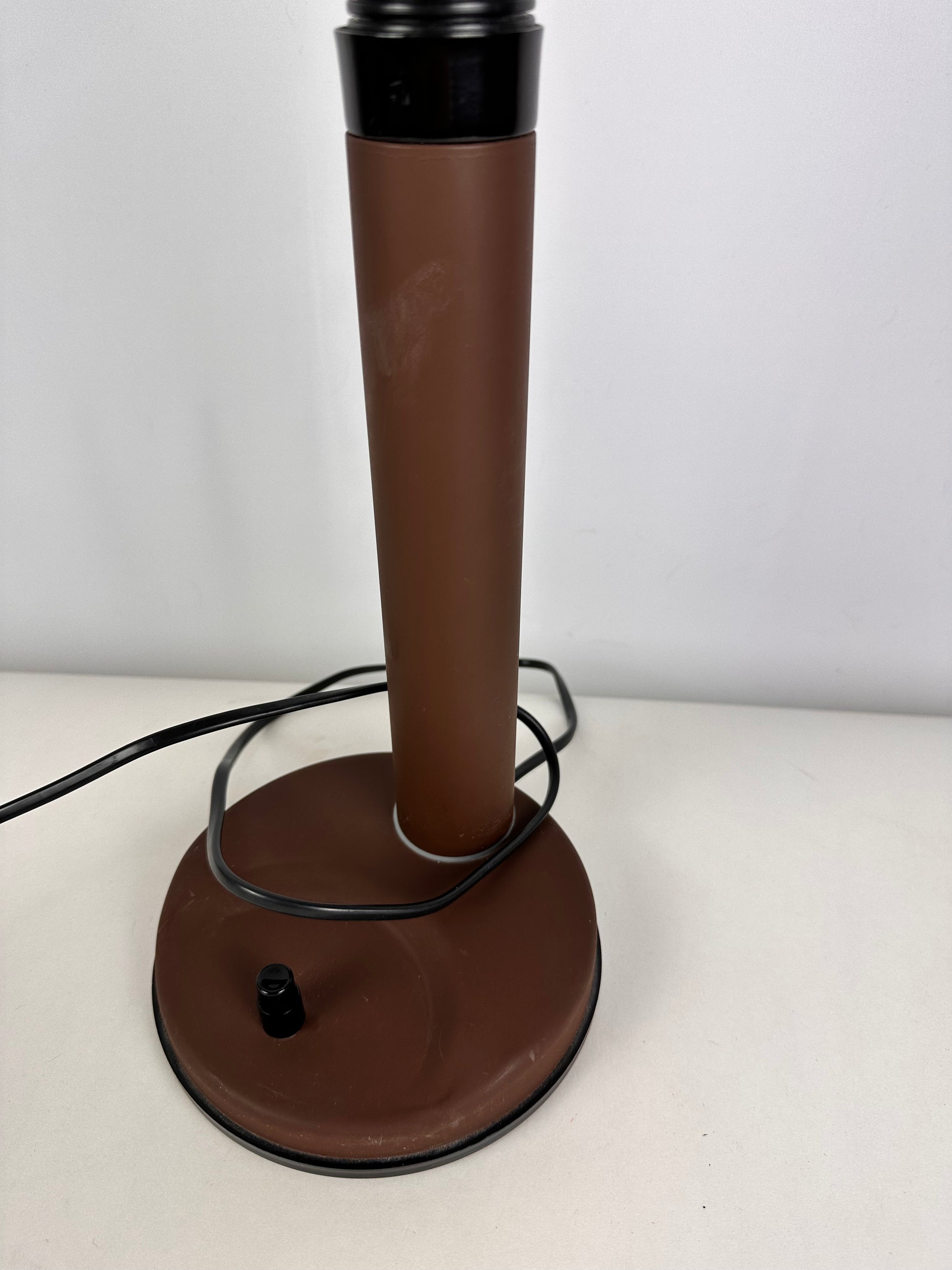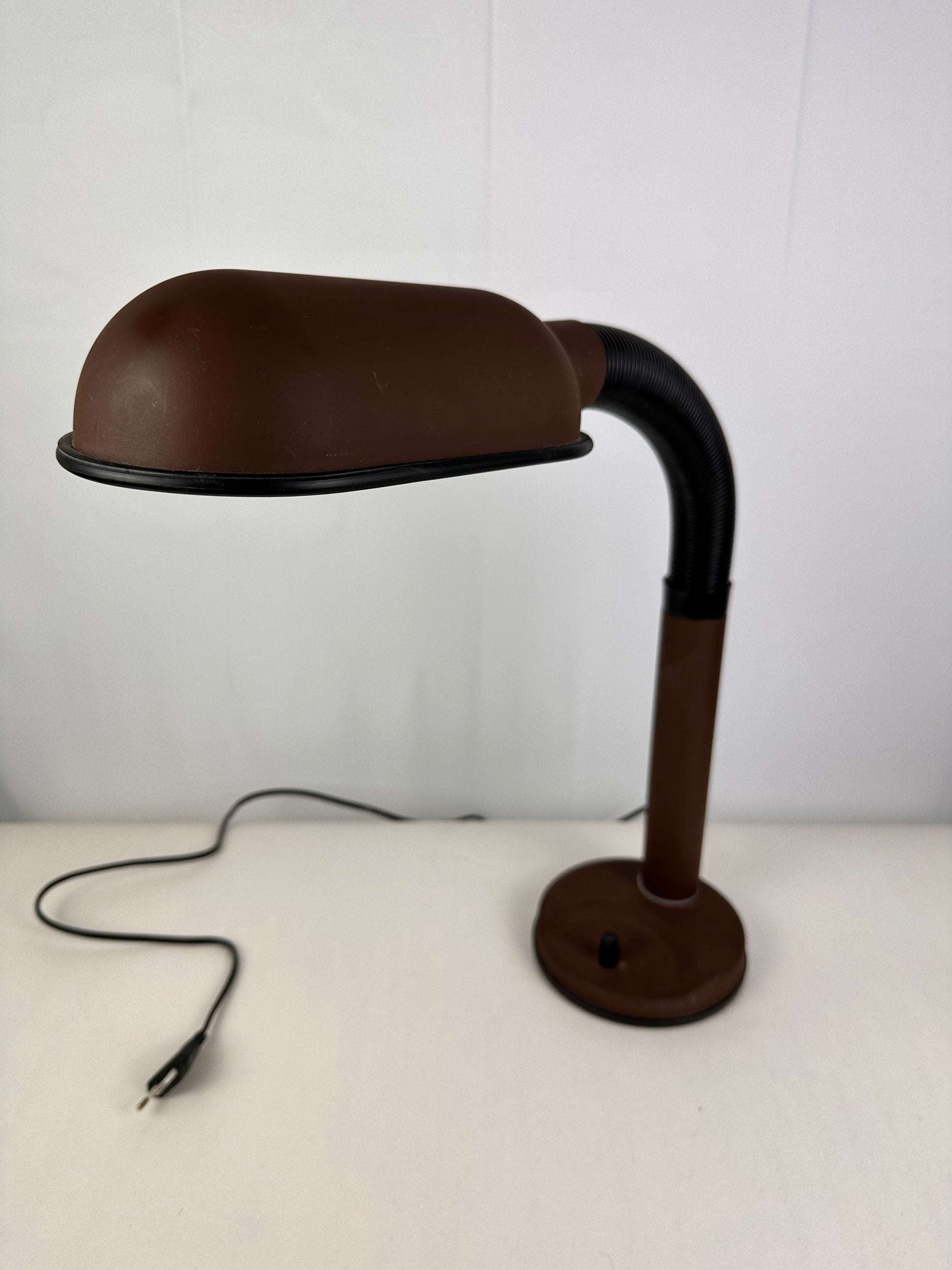 Geweldig mooie retro/postmoderne bureau lamp van het Nederlandse merk Herda dateerende uit de jaren ‘70. Lamp is verstelbaar. Donkerbruine kleur met zwarte accenten. Drukknopje aan de voet en natuurlijk werkt de lamp. Lamp is gemerkt. In een mooie vintage staat met lichte gebruikssporen.