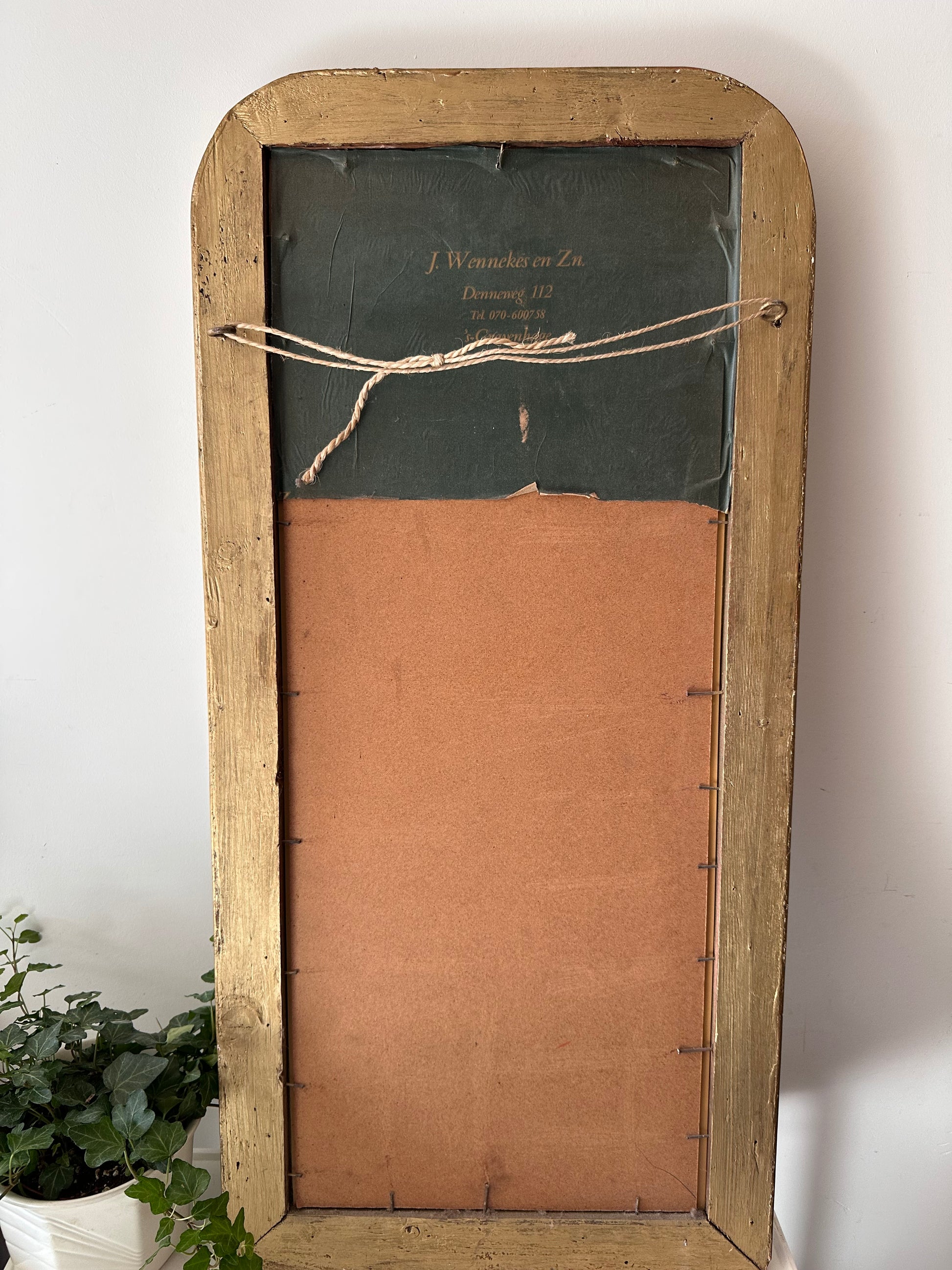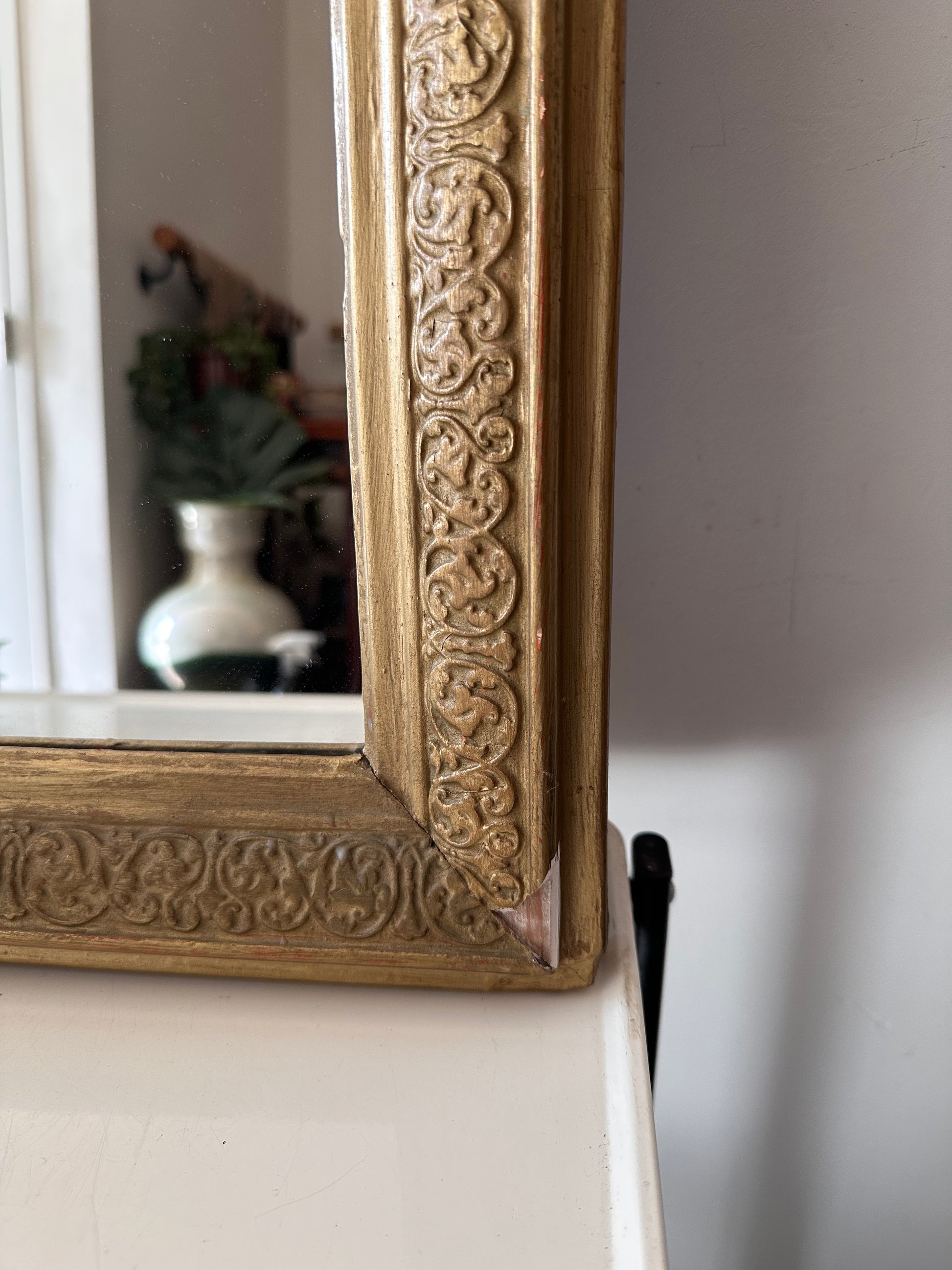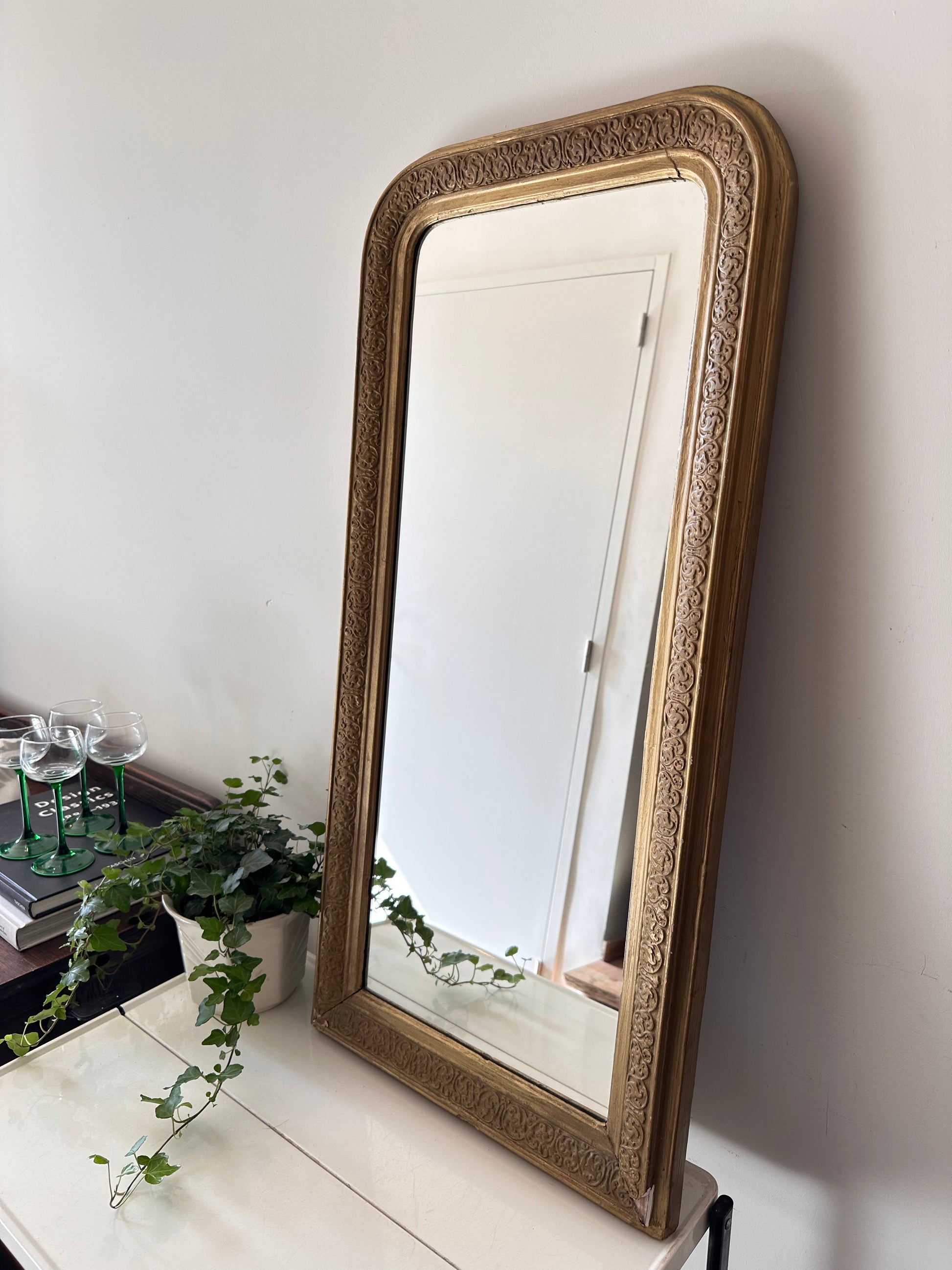 Een echte blikvanger met sierlijk reliëf in de lijst en een warme goudkleurige finish. Ideaal om neer te zetten of op te hangen, geeft meteen dat klassieke vintage sfeertje in huis. Heeft wat gebruikssporen in de hoeken onder, maar dat verhoogt alleen maar de charme van deze spiegel!