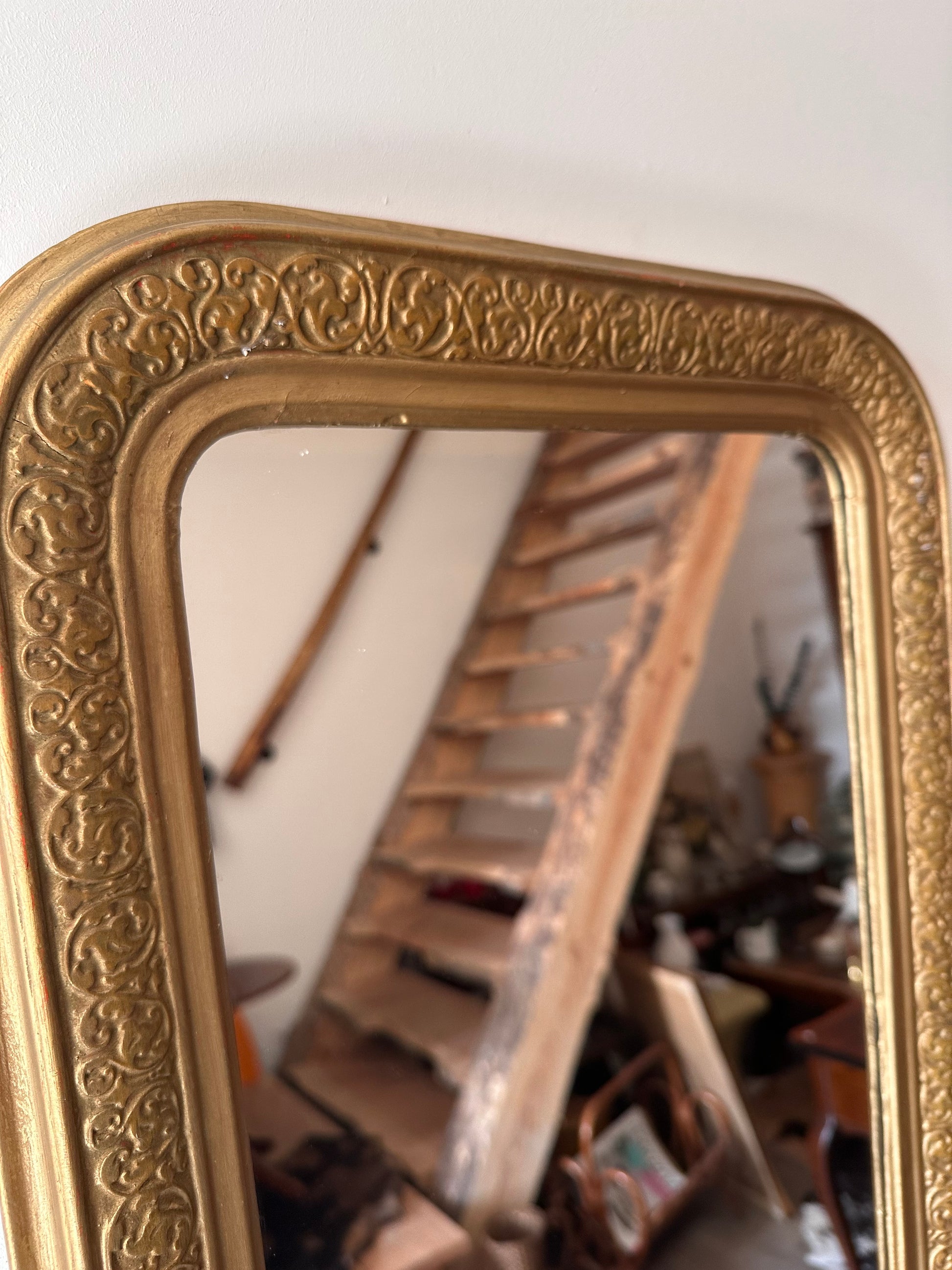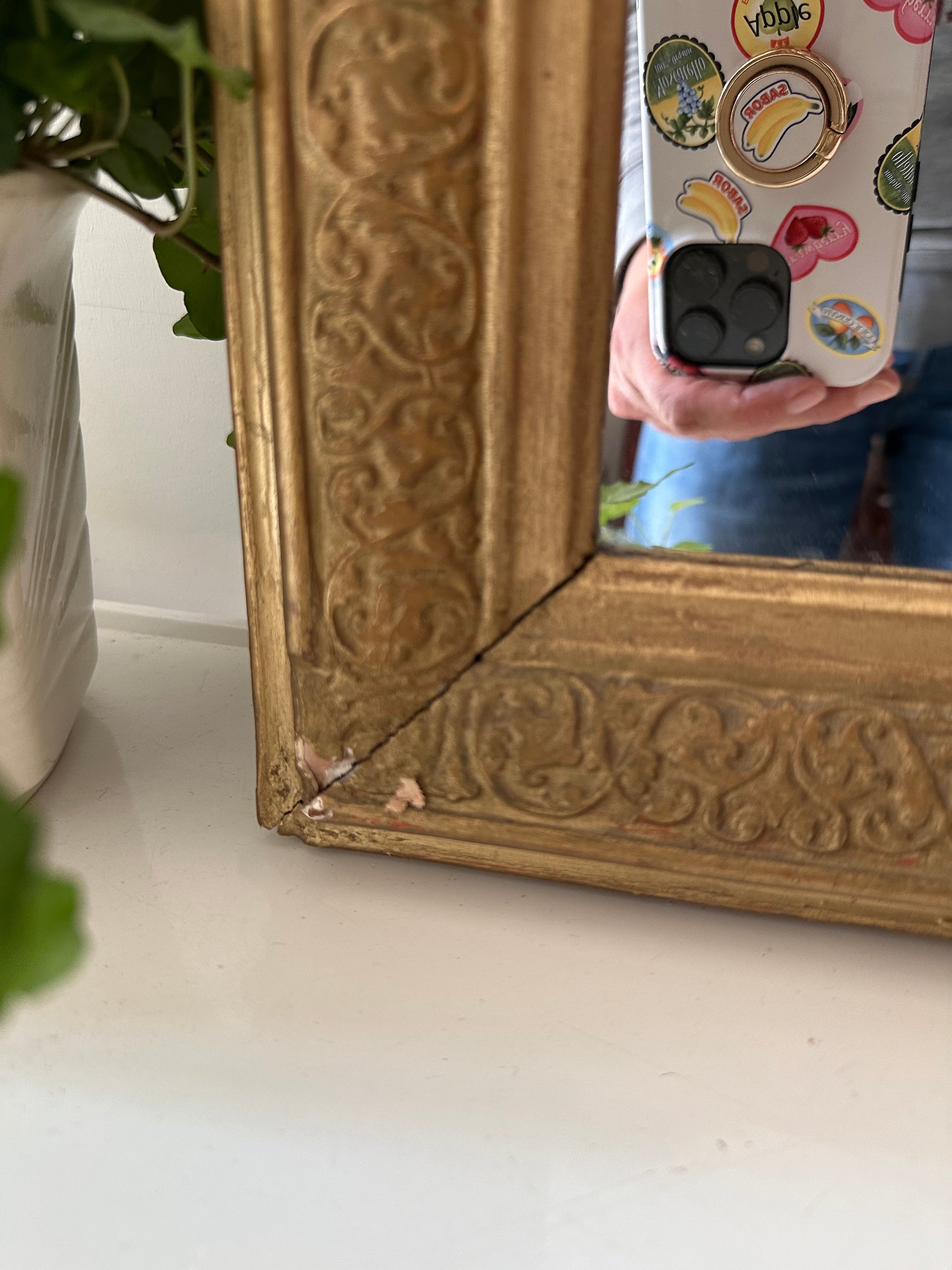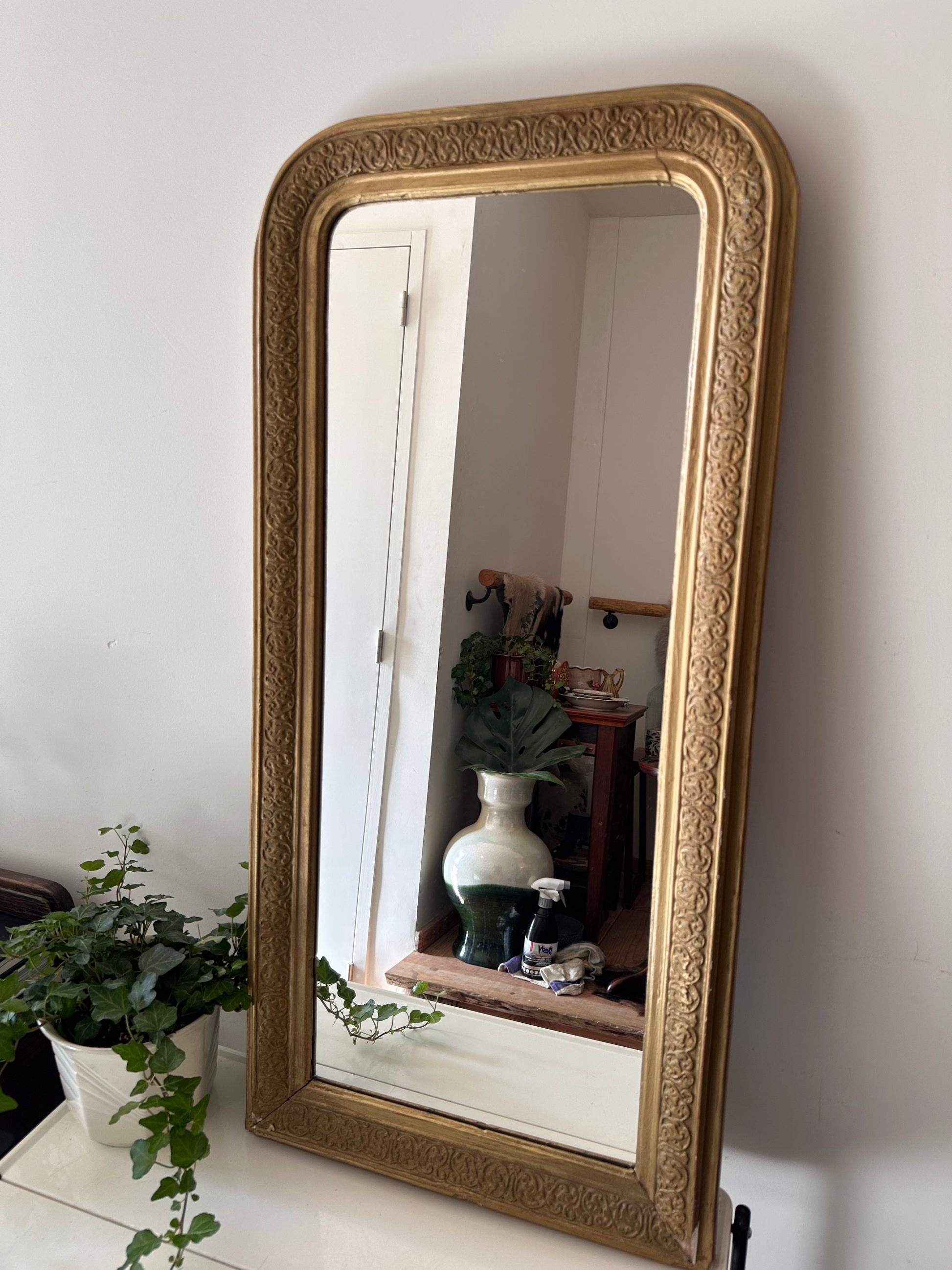 Een echte blikvanger met sierlijk reliëf in de lijst en een warme goudkleurige finish. Ideaal om neer te zetten of op te hangen, geeft meteen dat klassieke vintage sfeertje in huis. Heeft wat gebruikssporen in de hoeken onder, maar dat verhoogt alleen maar de charme van deze spiegel!