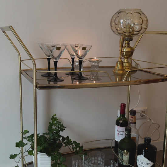 Supergave serveerwagen Bar Cart uit de jaren 70. In een mooie vintage staat. De Bar Cart is messing met twee rookglazen platen. Onder een messing afscheiding om je flessen in te zetten. Bar Cart is verrijdbaar. De Bar Cart vertoont gebruikssporen aan het messing (zie foto’s) De glazen platen zijn helemaal gaaf zonder chipjes en vertoont lichte gebruikssporen. Bar Cart is afkomstig uit Frankrijk rond de jaren 70